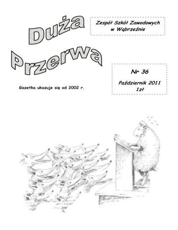 Zespół Szkół Zawodowych w Wąbrzeźnie Nr 36 Gazetka ukazuje się od 2002 r. Październik 2011 1zł skiego. Jak co roku została przeprowadzona sonda wśród klas pierwszych, na temat Witamy Was serdecznie po wakacyjnej przerwie na łamach naszego szkolnego pisma. W zmienionym składzie redakcyjnym, chcielibyśmy kontynuować wydawanie i udoskonalenie DUŻEJ PRZERWY. Wraz z nowym rokiem szkolnym powitaliśmy w murach naszej szkoły uczniów klas pierwszych oraz nowych nauczycieli. Pozdrawiamy wszystkich oddanych czytelników: nauczycieli i całą społeczność naszej szkoły. Dla zainteresowanych przygotowałyśmy artykuł pt. „Jak się uczyć?”, dotyczący sposobów i technik skutecznej nauki. Mamy już za sobą dwie udane imprezy, Dzień Sportu i I Wąbrzeski Festiwal Turystyczny oraz wybory do Samorządu Uczniowskiego, o których można przeczytać również w tym numerze. Dodatkiem do naszego pisma będzie jakże ulubiony przez wszystkich uczniów szczęśliwy ku- uczniowską, a w szczególności naszych „pierwszaków” Szkoła to miejsce wspólnie pon. Zachęcamy do lektury. spędzanego czasu, odkrywania talentów, zawierania nowych przyjaźni, dlatego też warto zainteresować się tym, co się wokół nas dzieje. Wszystkie te informacje znajdziecie w DP. Tradycyjnie już umieszczamy terminarz dni wolnych od nauki, wykaz wychowawstw i godziny pracy pedagoga, SZOK-u i pani pielęgniarki. W tym numerze wywiadu udzieliła nam Pani Elżbieta Piątek - nauczyciel języka angiel- Redakcja 2 Kiedy wolne i inne wydarzenia 30.09 szkolne zawody sportowe 31.10 dzień wolny (zarządzenie dyrektora) 11.11 Święto Niepodległości 23 – 31.12. 2011 -zimowa przerwa świąteczna 06.01.2012 – Święto Trzech Króli do 12.01 wystawienie ocen za pierwszy semestr, 20.01 zakończenie I semestru 13.02 – 26.02.2012 - ferie zimowe 24.04 Rada klasyfikacyjna dla klas maturalnych 05 – 10.04.2012- wiosenna przerwa świąteczna 27.04 uroczystość zakończenia zajęć dydaktycznych w klasach maturalnych 01.- 03.05. 2012 – dni wolne 04, 08.05. 2012 pisemne egzaminy dojrzałości 07.06.2012 Boże Ciało 18.06.2012r.(poniedziałek) pisemny egzamin zawodowy dla absolwentów wszystkich typów szkół 29.06.2012- WAKACJE I TMH/TM Hanna Kołpacka I TL Agnieszka Bochra I TE/THO Lidia Przybylska II TE/THO Hanna Kowalska II TMH Anna Wilamowska II TL/TM Szymon Krawczyk III THO/TMH Violetta Fijołek-Trzcińska III TE Lukrecja Bytnar III TL Ewa Rutkowska IV TL Aleksandra Ługiewicz IV THO Stanisława Kowalska IV TE/TMH Aleksandra Goldyszewicz Ia Agnieszka Dzielska Ib Karol Alichnowicz Ic Łukasz Molczyński Id Sabina Mikulska II a wz Wojciech Trzciński II b wz Lucyna Szczygłowska-Rarus II c wz Edyta Sroka II d wz Arkadiusz Żabiński III b wz Ewa Turek III dwz Marcin Lewicki Szkoły w systemie zaocznym I TU/z opiekun Ewelina Robaczewska II TU/z opiekun Zbigniew Wierzbowski II SP opiekun Lucyna Jachimowicz Stan liczbowy w ZSZ na dzień 30.09.2011 - 568 w zasadniczej szkole zawodowej 231 ucz. (77 dz.) w technikach 274 ucz. (140 dz.) w technikum uzupełniającym 51 słuchaczy (29 dz.) szkoła policealna - 12 słuchaczy (12 dz.) 3 Gabinet pielęgniarki Szkolny Ośrodek Kariery DZIEŃ TYGODNIA Anna Szelążek Sabina Mikulska Poniedziałek 1, 2 lekcja - 4 lekcja 3 lekcja 2,3 lekcja - 5 lekcja 4 lekcja 2,3 lekcja - Wtorek Środa Czwartek Piątek Dzień tygodnia Poniedziałek Jolanta Topij - Wtorek 11.45 – 14.00 Środa 11.45 – 14.00 Czwartek 11.45 – 14.00 Piątek 7.30 – 10.45 Wybory do SU Pedagog szkolny Poniedziałek Wtorek Środa Czwartek Piątek 1035 - 1505 820 – 950 1140 - 1440 825 -1025 1235 - 1305 815 - 1245 1335 - 1405 Kiedy przerwy? 8:00 – 8:45 8:55 – 9:40 9:50 – 10:35 10:55 – 11:40 11:50 – 12:35 12:45 – 13:30 13:40 – 14:25 14:35 – 15:15 28.09. br. odbyły się wybory do Samorządu Uczniowskiego na rok szkolny 2011/2012 r. Do zarządu zakwalifikowali się Rogowski Dariusz - II TMH Głogowska Maria - I THO Osmańska Katarzyna-ITE Szczygieł Monika - ITHO Jeziorowski Jan - III TMH Socha Bartek - II TE Borzykowska Alicja - I THO Wkrótce przydział funkcji. 4 Ojciec Bernard z Wąbrzeźna Jak co roku na łamach „Dużej Przerwy” umieściliśmy wyniki ankiety przeprowadzonej wśród pierwszoklasistów. Dzięki niej pierwszaki mogły podzielić się z nami swoimi pierwszymi wrażeniami. Zobaczmy więc, co mieli do powiedzenia nasi ankietowani. 1.Moje pierwsze wrażenia z pobytu w tej szkole… Oto odpowiedzi klasy Ι TE/THO: Uczniowie klasy II Technikum Mechatronicznego Piotr Kaczor i Michał Balmas zajęli I miejsce w konkursie organizowanym przez Burmistrza pt.: "Ojciec Bernard z Wąbrzeźna". Oceniono wartość merytoryczną, sposób prezentacji tematu, oryginalność pomysłów, stronę artystyczną i technikę. Na konkurs wpłynęło 16 prac konkursowych. Praca naszych uczniów powstała pod Różyńskiej. opieką P. Sandry -Nie najgorzej. -Może być. -Dobrze. -Jest nawet fajnie. -Jest git. -Ujdzie. Odpowiedzi kl. Ι TL: -Super. -Świetnie. -Cudownie. -Ekstra. -Przerażenie, ciasnota, ale luz. -Radość. -Satysfakcja wyboru. -Chęć chodzenia do szkoły. -W porządku. Odpowiedzi Ι TMH/TM: -Zadowolenie. -Miła atmosfera. -Zaskoczenie. Odpowiedzi Ι a wz: -Dużo ludzi. -Na razie dobrze. 2.Nauczyciele… Kl. Ι TE/THO: -Wymagający. -Z poczuciem humoru. -W porządku. 5 -Spoko. -Mogą być. -Dobrze tłumaczą. Kl. Ι TL: -Wspaniali. -Kochani. -Wyrozumiali. -Niemili. -Fajni. -Trochę za ostrzy. -Dość fajni tylko mało się uśmiechają. -Pozdrawiamy Pana Krawczyka. Kl. Ι TMH/TM: -Sympatyczni. -Mili. -Szaleni. Kl. Ι a wz: -Jeden na dziesięciu fajny. -Sympatyczni. -Czasem niesprawiedliwi. 3.Starsi koledzy i koleżanki są wobec mnie… Kl. Ι TE/THO: -W porządku. -Luzik. -Ok, chociaż patrzą na nas z góry. -Nawet. -Jeszcze ich nie poznałam, ale wydaje mi się, że przez 4 lata będzie dobrze. Kl. Ι TL: -Na luzie. -Normalni. -Spoko, nic mi nie przeszkadza w zachowaniu
