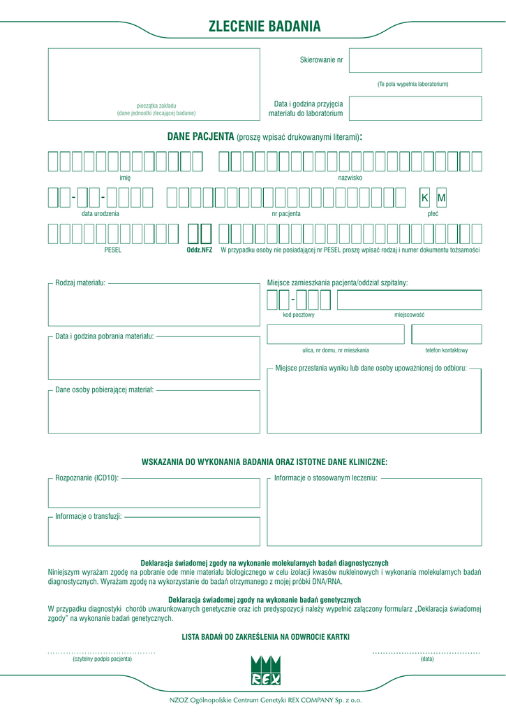 ZLECENIE BADANIA Skierowanie nr (Te pola wypełnia laboratorium) pieczątka zakładu (dane jednostki zlecającej badanie) Data i godzina przyjęcia materiału do laboratorium DANE PACJENTA (proszę wpisać drukowanymi literami): imię nazwisko K M nr pacjenta data urodzenia PESEL Oddz.NFZ Rodzaj materiału: płeć W przypadku osoby nie posiadającej nr PESEL proszę wpisać rodzaj i numer dokumentu tożsamości Miejsce zamieszkania pacjenta/oddział szpitalny: kod pocztowy miejscowość Data i godzina pobrania materiału: ulica, nr domu, nr mieszkania telefon kontaktowy Miejsce przesłania wyniku lub dane osoby upoważnionej do odbioru: Dane osoby pobierającej materiał: WSKAZANIA DO WYKONANIA BADANIA ORAZ ISTOTNE DANE KLINICZNE: Rozpoznanie (ICD10): Informacje o stosowanym leczeniu: Informacje o transfuzji: Deklaracja świadomej zgody na wykonanie molekularnych badań diagnostycznych Niniejszym wyrażam zgodę na pobranie ode mnie materiału biologicznego w celu izolacji kwasów nukleinowych i wykonania molekularnych badań diagnostycznych. Wyrażam zgodę na wykorzystanie do badań otrzymanego z mojej próbki DNA/RNA. Deklaracja świadomej zgody na wykonanie badań genetycznych W przypadku diagnostyki chorób uwarunkowanych genetycznie oraz ich predyspozycji należy wypełnić załączony formularz „Deklaracja świadomej zgody” na wykonanie badań genetycznych. LISTA BADAŃ DO ZAKREŚLENIA NA ODWROCIE KARTKI (czytelny podpis pacjenta) (data) LISTA OFEROWANYCH BADAŃ Wybrane badania prosimy zakreślić krzyżykiem DIAGNOSTYKA INFEKCJI UKŁADU MOCZOWO-PŁCIOWEGO DIAGNOSTYKA PATOGENÓW UKŁADU ODDECHOWEGO (badania jakościowe) Chlamydia pneumoniae HPV 12 (typy wysokoonkogenne) Mycoplasma pneumoniae HPV 2 (typy niskoonkogenne) Adenowirusy (ADV) HPV 35 (typy wysoko- i niskoonkogenne) MRSA (Staphylococcus aureus metycylinioporny) HSV - wirus opryszczki typ 1 i 2 PAKIETY BADAŃ HSV - wirus opryszczki typ 1 i 2 (różnicowanie) Chlamydia trachomatis Ureaplasma urealyticum Mycoplasma genitalium Mycoplasma hominis Neisseria gonorrhoeae Trichomonas vaginalis Gardnerella vaginalis Streptococcus agalactiae (badania jakościowe) Chlamydia pneumoniae, Mycoplasma pneumoniae DIAGNOSTYKA ZAKAŻEŃ WIRUSAMI HAPATOTROPOWYMI ORAZ HIV (badania jakościowe) HCV - jakościowo HBV - jakościowo HIV - jakościowo (metoda Western-Blott) HCV - genotypowanie HBV - genotypowanie (A-H) PAKIETY BADAŃ HBV – lekooporność YMDD Pakiet HPV (nisko- i wysokoonkogenne) HBV – lekooporność na entekawir Chlamydia trachomatis, Ureaplsma urealyticum (badania ilościowe) Chlamydia trachomatis, Mycoplasma genitalium HCV - ilościowo Chlamydia trachomatis, Mycoplasma hominis HBV - ilościowo HPV, Chlamydia trachomatis, Ureaplsma urealyticum HIV - ilościowo HPV, Chlamydia trachomatis, Mycoplasma genitalium HPV, Chlamydia trachomatis, Mycoplasma hominis PAKIETY BADAŃ HCV jakościowo, HCV ilościowo Chlamydia trachomatis, Ureaplasma urealyticum, Mycoplasma genitalium HCV jakościowo, HCV genotypowanie Chlamydia trachomatis, Ureaplasma urealyticum, Mycoplasma hominis HCV ilościowo, HCV genotypowanie PAKIETY INFEKCYJNE Pakiet infekcyjny I: HBV jakościowo, HBV ilościowo HBV jakościowo, lekooporność YMDD HPV, Chlamydia trachomatis, HSV, Ureaplasma urealyticum HBV ilościowo, lekooporność YMDD Pakiet infekcyjny II: HBV jakościowo, lekooporność entekawir Pakiet infekcyjny III: HBV ilościowo, lekooporność entekawir DIAGNOSTYKA ZAKAŻEŃ OGÓLNOUSTROJOWYCH DIAGNOSTYKA CHORÓB UWARUNKOWANYCH GENETYCZNIE ORAZ ICH PREDYSPOZYCJI (badania jakościowe) Hemochromatoza CMV – wirus cytomegalii Mukowiscydoza (19 mutacji) EBV – wirus Epsteina - Barr Mukowiscydoza mutacja Fdel508 HHV6 – herpeswirus typ 6 Mutacja Leiden czynnika V Parwowirus B-19 Mutacja genu protrombiny Borrelia burgdorferi Zespół Gilberta (badania ilościowe) Nietolerancja laktozy EBV - ilościowo Głuchota wrodzona Parwowirus B-19 - ilościowo BRCA1 CMV - ilościowo Celiakia HPV, Chlamydia trachomatis, Ureaplasma urealyticum, Mycoplasma genitalium HPV, Chlamydia trachomatis, Ureaplasma urealyticum, Mycoplasma hominis MTHFR (hiperhomocysteinemia) FARMAKOGENETYKA podpis i pieczęć lekarza zlecającego badanie* *Imię i nazwisko oraz nazwa i numer dokumentu potwierdzającego tożsamość innej osoby upoważnionej do zlecenia badania. Nadwrażliwość na IRINOTECAN HLA-B*57 (typowanie niskiej rozdzielczości)