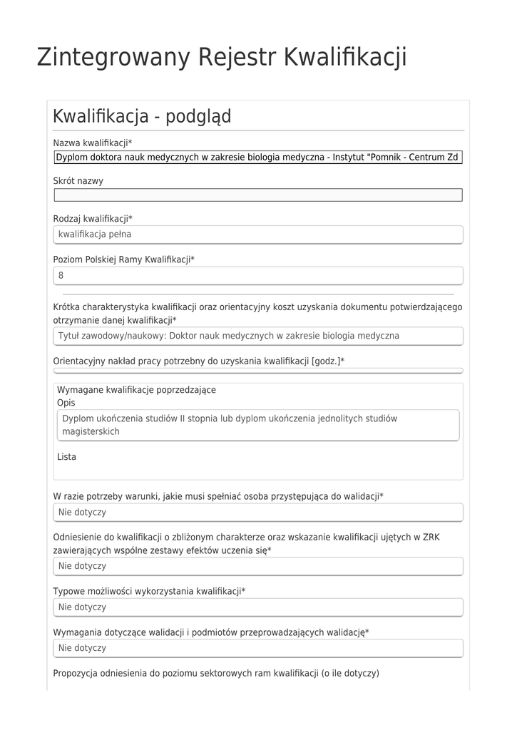 Zintegrowany Rejestr Kwalifikacji Kwalifikacja - podgląd Nazwa kwalifikacji* Dyplom doktora nauk medycznych w zakresie biologia medyczna - Instytut "Pomnik - Centrum Zd Skrót nazwy Rodzaj kwalifikacji* kwalifikacja pełna Poziom Polskiej Ramy Kwalifikacji* 8 Krótka charakterystyka kwalifikacji oraz orientacyjny koszt uzyskania dokumentu potwierdzającego otrzymanie danej kwalifikacji* Tytuł zawodowy/naukowy: Doktor nauk medycznych w zakresie biologia medyczna Orientacyjny nakład pracy potrzebny do uzyskania kwalifikacji [godz.]* Wymagane kwalifikacje poprzedzające Opis Dyplom ukończenia studiów II stopnia lub dyplom ukończenia jednolitych studiów magisterskich Lista W razie potrzeby warunki, jakie musi spełniać osoba przystępująca do walidacji* Nie dotyczy Odniesienie do kwalifikacji o zbliżonym charakterze oraz wskazanie kwalifikacji ujętych w ZRK zawierających wspólne zestawy efektów uczenia się* Nie dotyczy Typowe możliwości wykorzystania kwalifikacji* Nie dotyczy Wymagania dotyczące walidacji i podmiotów przeprowadzających walidację* Nie dotyczy Propozycja odniesienia do poziomu sektorowych ram kwalifikacji (o ile dotyczy) Nie dotyczy Syntetyczna charakterystyka efektów uczenia się* Nie dotyczy Zestawy efektów uczenia się Informacje o instytucjach uprawnionych do nadawania kwalifikacji Instytucja uprawniona do nadawania kwalifikacji Instytut "Pomnik - Centrum Zdrowia Dziecka" Data uzyskania uprawnień do nadawania kwalifikacji 2015-09-28 Termin wykonania ewaluacji zewnętrznej Instytucja prowadząca ewaluację zewnętrzną Centralna Komisja do Spraw Stopni i Tytułów Status aktywny Wnioskodawca* Minister właściwy* Instytut "Pomnik - Centrum Zdrowia Dziecka" Okres ważności dokumentu potwierdzającego nadanie kwalifikacji i warunki przedłużenia jego ważności* Nie dotyczy Nazwa dokumentu potwierdzającego nadanie kwalifikacji* Dyplom Uprawnienia związane z posiadaniem kwalifikacji* Nie dotyczy Kod dziedziny kształcenia* 0 - Nie dotyczy Kod PKD* 0 - Nie dotyczy Status Funkcjonująca