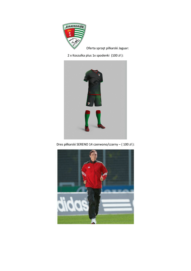 Oferta sprzęt piłkarski Jaguar: 2 x Koszulka plus 1x spodenki (100 zł ): Dres piłkarski SERENO 14 czerwono/czarny – ( 100 zł ): Ortalion Adidas CORE 15 – ( 80 zł ): Zakup całego kompletu – 250 zł ( wpisowe ) Dodatkowo można zakupić getry z logiem Jaguara cena – 10 zł