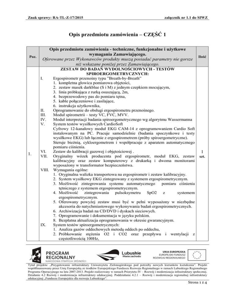 Znak sprawy: RA-TL-Z-17/2015 załącznik nr 1.1 do SIWZ Opis przedmiotu zamówienia – CZĘŚĆ 1 Poz. 1. Opis przedmiotu zamówienia - techniczne, funkcjonalne i użytkowe wymagania Zamawiającego. Oferowane przez Wykonawców produkty muszą posiadać parametry nie gorsze niż wskazane poniżej przez Zamawiającego. ZESTAW DO BADAŃ WYDOLNOŚCIOWYCH - TESTÓW SPIROERGOMETRYCZNYCH: I. Ergospirometr przenośny typu ”Breath-by-Breath” 1. kompletna głowica pomiarowa objętości, 2. zestaw masek darkblue (S i M) z jednym czepkiem mocującym, 3. linia próbkująca z rurką osuszającą, 2m, 4. bezprzewodowy pas do pomiaru tętna, 5. kable połączeniowe i zasilające, 6. instrukcja użytkownika, II. Oprogramowanie do obsługi ergospirometru przenośnego. III. Moduł spirometrii – testy VC, FVC, MVV. IV. Moduł interpretacji badania spiroergometrycznego wg algorytmu Wassermanna V. System testów wysiłkowych CardioSoft Cyfrowy 12-kanałowy moduł EKG CAM-14 z oprogramowaniem Cardio Soft instalowanym na PC. Pracuje samodzielnie (badania spoczynkowe i testy wysiłkowe EKG) lub łącznie z ergospirometrem (próby spiroergometryczne). Steruje bieżnią, cykloergometrem i współpracuje z aparatem automatycznego pomiaru ciśnienia. VI. Zestaw do kalibracji gazowej i objętościowej . VII. Oryginalny wózek producenta pod ergospirometr, moduł EKG, zestaw kalibracyjny oraz zestaw komputerowy z drukarką i dwoma monitorami wyposażony w transformator bezpieczeństwa. VIII. Wymagania ogólne: 1. Oryginalna walizka transportowa na ergospirometr i zestaw kalibracyjny. 2. System wysiłkowy EKG zintegrowany z systemem ergospirometrycznym. 3. Możliwość zintegrowania systemu automatycznego pomiaru ciśnienia tętniczego z systemem ergospirometrycznym. 4. Możliwość zintegrowania pulsoksymetru SpO2 z systemem ergospirometrycznym. 5. Oferowany powyżej zestaw musi być w pełni wyposażony w niezbędne akcesoria do natychmiastowego wykonywania badań ergospirometrycznych. 6. Archiwizacja badań na CD/DVD i dyskach sieciowych. 7. Oprogramowanie i dokumentacja w języku polskim. 8. Bezpłatna aktualizacja oprogramowania w okresie gwarancyjnym. IX. System testów spiroergometrycznych: 1. Analiza gazów oddechowych metodą oddech po oddechu, 2. Próbkowanie stężenia O2 i CO2 oraz przepływu i wentylacji z częstotliwością 100Hz, Ilość 1 szt. Tytuł projektu: „Przygotowanie infrastruktury Uniwersytetu Zielonogórskiego pod potrzeby nowych kierunków kształcenia”. Projekt współfinansowany przez Unię Europejską ze środków Europejskiego Funduszu Rozwoju Regionalnego w ramach Lubuskiego Regionalnego Programu Operacyjnego na lata 2007-2013. Projekt realizowany w ramach Priorytetu IV – Rozwój i modernizacja infrastruktury społecznej. Działanie 4.2 Rozwój i modernizacja infrastruktury edukacyjnej. Poddziałanie 4.2.1 – Rozwój i modernizacja regionalnej infrastruktury edukacyjnej „Fundusze Europejskie dla rozwoju Lubuskiego”. Strona 1 z 4 Znak sprawy: RA-TL-Z-17/2015 załącznik nr 1.1 do SIWZ 3. Prezentacja cyklu oddechowego „intra-breath” na ekranie, 4. Wymagane parametry: BF, TV, VE, VE/VO2, VE/VCO2, PETO2, PETCO2, PACO2, HR, VO2/HR, FIO2, FEO2, FICO2, FECO2, VO2, VCO2, VO2/kg, VCO2/kg, VO2max, METS, RER oraz FVC, 5. Pomiar pojemności i rzutu skurczowego serca metodą pośrednią wg Wassermanna, 6. Pomiary spirometryczne dla testów VC, FVC i MVV, 7. Optyczna głowica spirometryczna wielorazowego użytku o oporach poniżej 0.1kPa/l/s przy przepływie 16l/s, 8. Kalibracja głowicy pomiarowej dla różnych zakresów przepływu wykonywana nie częściej niż raz w ciągu dnia, 9. Elektrochemiczny czujnik stężenia O2 o czasie odpowiedzi <100ms, 10. Czujnik stężenia CO2 na podczerwień o czasie odpowiedzi <100ms, 11. Zakresy pomiarowe: 1) O2 min. 0 - 60% z dokładnością < 0.1% 2) CO2 min. 0 - 13% z dokładnością < 0.1% 3) przepływ 0 - 20l/s z dokładnością < 2% 4) wentylacja 0 - 300l/min 12. Prezentacja 9 paneli Wassermana z możliwością ich modyfikacji, 13. Automatyczne i ręczne określanie progów wentylacyjnych AT i RCP metodą V-Slope i równoważników wentylacyjnych, 14. Moduł interpretacji testu spiroergometrycznego z wykorzystaniem algorytmu Wassermana, 15. Moduł oceny ryzyka pacjenta przed zabiegiem operacyjnym, 16. Funkcja oceny kinetyki tlenu i opóźnienia τ, 17. Wprowadzanie wyników gazometrii w trakcie i po wykonanym badaniu spiroergometrycznym, 18. Automatyczne usuwanie okresów pauz z badania spiroergometrycznego wynikających z zatrzymania bieżni na czas pobrania próbki krwi, 19. Zestaw wzorcowych i budowanie własnych ekranów wg preferencji użytkownika, 20. Możliwość zmiany ekranów w trakcie badania, 21. Możliwość edycji wykresów i parametrów oraz ich wyłączenia na żądanie użytkownika, 22. Możliwość definiowania własnych parametrów i formuł obliczeniowych, 23. Zestaw standardowych i tworzenie własnych protokołów wysiłkowych na bieżnię i cykloergometr, m.in. narastających liniowo i progresywnych schodkowych o nieregularnym czasie trwania i zmiennych przyrostach obciążenia, 24. Graficzny i tekstowy edytor protokołów wysiłkowych, 25. System kompatybilny z bieżniami i cykloergometrami różnych producentów, 26. Zestaw do kalibracji gazowej i objętościowej, 27. Kalibracja gazowa systemu z użyciem butli nie częściej niż raz w miesiącu, 28. Bezobsługowa jednorazowa butla z gazem kalibracyjnym o wadze poniżej 1kg, 29. Kalibracja gazowa ergospirometru bez konieczności odkręcania i zakręcania butli z gazem, Tytuł projektu: „Przygotowanie infrastruktury Uniwersytetu Zielonogórskiego pod potrzeby nowych kierunków kształcenia”. Projekt współfinansowany przez Unię Europejską ze środków Europejskiego Funduszu Rozwoju Regionalnego w ramach Lubuskiego Regionalnego Programu Operacyjnego na lata 2007-2013. Projekt realizowany w ramach Priorytetu IV – Rozwój i modernizacja infrastruktury społec