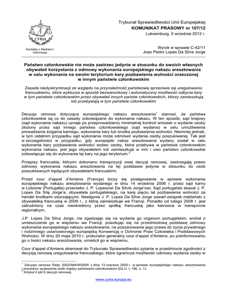 Trybunał Sprawiedliwości Unii Europejskiej KOMUNIKAT PRASOWY nr 107/12 Luksemburg, 5 września 2012 r. Wyrok w sprawie C-42/11 Joao Pedro Lopes Da Silva Jorge Kontakty z Mediami i Informacja Państwo członkowskie nie może zastrzec jedynie w stosunku do swoich własnych obywateli korzystania z odmowy wykonania europejskiego nakazu aresztowania w celu wykonania na swoim terytorium kary pozbawienia wolności orzeczonej w innym państwie członkowskim Zasada niedyskryminacji ze względu na przynależność państwową sprzeciwia się uregulowaniu francuskiemu, które wyklucza w sposób bezwarunkowy i automatyczny możliwość odbycia kary w tym państwie członkowskim przez obywateli innych państw członkowskich, którzy zamieszkują lub przebywają w tym państwie członkowskim Decyzja ramowa dotycząca europejskiego nakazu aresztowania1 stanowi, że państwa członkowskie są co do zasady zobowiązane do wykonania nakazu. W ten sposób, sąd krajowy (sąd wykonania nakazu) uznaje po przeprowadzeniu minimalnej kontroli wniosek o wydanie osoby złożony przez sąd innego państwa członkowskiego (sąd wydania) w celu umożliwienia prowadzenia ścigania karnego, wykonania kary lub środka pozbawienia wolności. Niemniej jednak, w tym ostatnim przypadku sąd wykonania może odmówić wydania osoby poszukiwanej. Tak jest w szczególności w przypadku, gdy europejski nakaz aresztowania wydany został w celu wykonania kary pozbawienia wolności wobec osoby, która przebywa w państwie członkowskim wykonania nakazu, jest jego obywatelem lub zamieszkuje w nim i owo państwo członkowskie zobowiązuje się do wykonania tej kary na jego terytorium.2 Przepisy francuskie, którymi dokonano transpozycji owej decyzji ramowej, zastrzegają prawo odmowy wykonania nakazu aresztowania na tej podstawie jedynie w stosunku do osób poszukiwanych będących obywatelami francuskimi. Przed cour d’appel d’Amiens (Francja) toczy się postępowanie w sprawie wykonania europejskiego nakazu aresztowania wydanego w dniu 14 września 2006 r. przez sąd karny w Lizbonie (Portugalia) przeciwko J. P. Lopesowi Da Silvie Jorge’owi. Sąd portugalski skazał J. P. Lopes Da Silę Jorge’a, obywatela portugalskiego, na karę pięciu lat pozbawienia wolności za handel środkami odurzającymi. Następnie J. P. Lopes Da Silve Jorge zawarł związek małżeński z obywatelką francuską w 2009 r., z którą zamieszkuje we Francji. Ponadto od lutego 2008 r. jest zatrudniony na czas nieokreślony przez spółkę francuską jako kierowca w transporcie regionalnym. J.P. Lopes Da Silva Jorge, nie zgadzając się na wydanie go organom portugalskim, wniósł o umieszczenie go w więzieniu we Francji, powołując się na przedmiotową podstawę odmowy wykonania europejskiego nakazu aresztowania, na poszanowanie jego prawa do życia prywatnego i rodzinnego ustanowionego europejską Konwencją o Ochronie Praw Człowieka i Podstawowych Wolności. W dniu 20 maja 2010 r. prokurator generalny cour d’appel d’Amiens, po poinformowaniu go o treści nakazu aresztowania, umieścił go w więzieniu. Cour d’appel d’Amiens skierował do Trybunału Sprawiedliwości pytanie w przedmiocie zgodności z decyzją ramową uregulowania francuskiego, które ogranicza możliwość odmowy wydania osoby w 1 Decyzja ramowa Rady 2002/584/WSiSW z dnia 13 czerwca 2002 r. w sprawie europejskiego nakazu aresztowania i procedury wydawania osób między państwami członkowskimi (Dz.U. L 190, s. 1). 2 Artykuł 4 pkt 6 decyzji ramowej. www.curia.europa.eu celu wykonania na jego terytorium kary pozbawienia wolności orzeczonej w innym państwie członkowskim jedynie do obywateli francuskich, wyłączając w sposób bezwarunkowy i automatyczny obywateli innych państw członkowskich, którzy przebywają lub zamieszkują we Francji. W wydanym dziś wyroku Trybunał przypomniał, że o ile państwa członkowskie powinny zasadniczo wykonywać europejski nakaz aresztowania, to jednak mogą one zezwolić w szczególnych sytuacjach właściwym sądom krajowym na postanowienie, że orzeczona kara powinna zostać wykonana na terytorium państwa członkowskiego wykonania. Tak jest w przypadku, zgodnie z decyzją ramową, gdy osoba poszukiwana „przebywa w państwie członkowskim wykonania nakazu, jest jego obywatelem lub ma w nim miejsce zamieszkania”, a państwo członkowskie zobowiązuje się doprowadzić do wykonania tej kary zgodnie ze swoim prawem krajowym. Zgodnie z utrwalonym orzecznictwem, owa fakultatywna podstawa odmowy wykonania nakazu ma zwłaszcza na celu umożliwienie sądowi przypisania szczególnej wagi zwiększeniu szans ponownej integracji społecznej osoby ściganej po wykonaniu kary, na którą została skazana. Do realizacji tego celu można zgodnie z prawem dążyć poprzez wykazanie określonego stopnia integracji ze społeczeństwem tego państwa. Zgodnie z tym, co orzekł już wcześniej Trybunał,3 na zasadzie wyjątku od zasady wzajemnego uznania, państwo członkowskie może ograniczyć korzystanie z tej podstawy odmowy wykonania europejskiego nakazu aresztowania do swoich obywateli i obywateli innych państw członkowskich, którzy przebywają legalnie na terytorium kraju nieprzerwanie przez okres pięciu lat. Warunek ten może w rzeczywistości zostać uznany za mogący zagwarantować, że osoba poszukiwana jest wystarczająco zintegrowana w państwie członkowskim wykonania. Niemniej jednak, państwa członkowskie nie mogą bez jednoczesnego naruszenia zasady niedyskryminacji ze względu na przynależność państwową4, ograniczyć owej podstawy odmowy wykonania jedynie do obywateli krajowych, poprzez bezwarunkowe i automatyczne wyłączenie obywateli innych państwa członkowskich, którzy przebywają lub zamieszkują – terminy te powinny zostać określone w sposób jednolity przez państwa członkowskie – na terytorium państwa członkowskiego wykonania, niezależnie od rodzaju powiązania, jakie mają oni z tym państwem. 