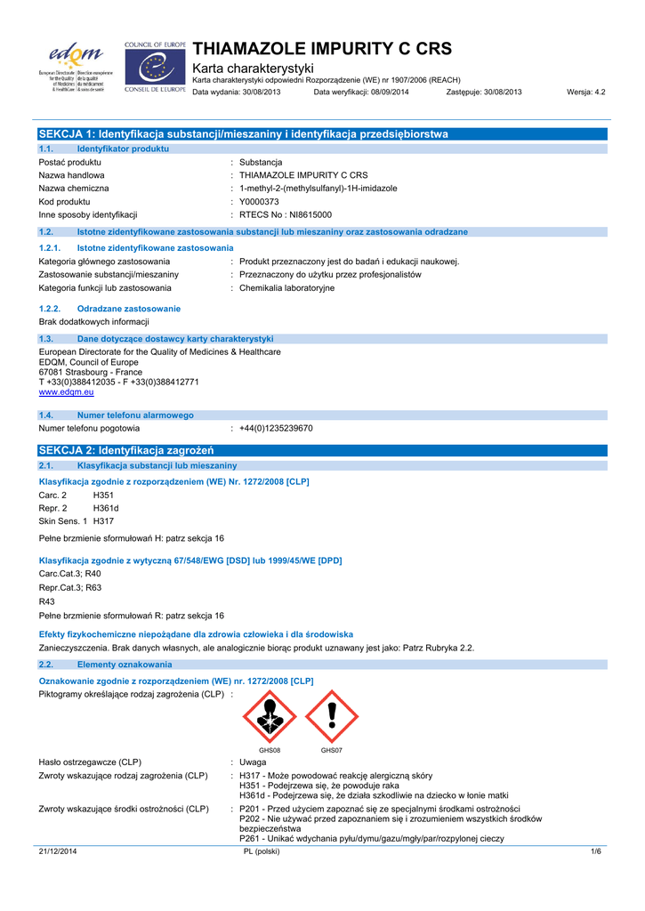 THIAMAZOLE IMPURITY C CRS Karta charakterystyki Karta charakterystyki odpowiedni Rozporządzenie (WE) nr 1907/2006 (REACH) Data wydania: 30/08/2013 Data weryfikacji: 08/09/2014 Zastępuje: 30/08/2013 Wersja: 4.2 SEKCJA 1: Identyfikacja substancji/mieszaniny i identyfikacja przedsiębiorstwa 1.1. Identyfikator produktu Postać produktu : Substancja Nazwa handlowa : THIAMAZOLE IMPURITY C CRS Nazwa chemiczna : 1-methyl-2-(methylsulfanyl)-1H-imidazole Kod produktu : Y0000373 Inne sposoby identyfikacji : RTECS No : NI8615000 1.2. Istotne zidentyfikowane zastosowania substancji lub mieszaniny oraz zastosowania odradzane 1.2.1. Istotne zidentyfikowane zastosowania Kategoria głównego zastosowania : Produkt przeznaczony jest do badań i edukacji naukowej. Zastosowanie substancji/mieszaniny : Przeznaczony do użytku przez profesjonalistów Kategoria funkcji lub zastosowania : Chemikalia laboratoryjne 1.2.2. Odradzane zastosowanie Brak dodatkowych informacji 1.3. Dane dotyczące dostawcy karty charakterystyki European Directorate for the Quality of Medicines & Healthcare EDQM, Council of Europe 67081 Strasbourg - France T +33(0)388412035 - F +33(0)388412771 www.edqm.eu 1.4. Numer telefonu alarmowego Numer telefonu pogotowia : +44(0)1235239670 SEKCJA 2: Identyfikacja zagrożeń 2.1. Klasyfikacja substancji lub mieszaniny Klasyfikacja zgodnie z rozporządzeniem (WE) Nr. 1272/2008 [CLP] Carc. 2 H351 Repr. 2 H361d Skin Sens. 1 H317 Pełne brzmienie sformułowań H: patrz sekcja 16 Klasyfikacja zgodnie z wytyczną 67/548/EWG [DSD] lub 1999/45/WE [DPD] Carc.Cat.3; R40 Repr.Cat.3; R63 R43 Pełne brzmienie sformułowań R: patrz sekcja 16 Efekty fizykochemiczne niepożądane dla zdrowia człowieka i dla środowiska Zanieczyszczenia. Brak danych własnych, ale analogicznie biorąc produkt uznawany jest jako: Patrz Rubryka 2.2. 2.2. Elementy oznakowania Oznakowanie zgodnie z rozporządzeniem (WE) nr. 1272/2008 [CLP] Piktogramy określające rodzaj zagrożenia (CLP) : GHS08 GHS07 Hasło ostrzegawcze (CLP) : Uwaga Zwroty wskazujące rodzaj zagrożenia (CLP) : H317 - Może powodować reakcję alergiczną skóry H351 - Podejrzewa się, że powoduje raka H361d - Podejrzewa się, że działa szkodliwie na dziecko w łonie matki Zwroty wskazujące środki ostrożności (CLP) : P201 - Przed użyciem zapoznać się ze specjalnymi środkami ostrożności P202 - Nie używać przed zapoznaniem się i zrozumieniem wszystkich środków bezpieczeństwa P261 - Unikać wdychania pyłu/dymu/gazu/mgły/par/rozpylonej cieczy 21/12/2014 PL (polski) 1/6 THIAMAZOLE IMPURITY C CRS Karta charakterystyki Karta charakterystyki odpowiedni Rozporządzenie (WE) nr 1907/2006 (REACH) P272 - Zanieczyszczonej odzieży ochronnej nie wynosić poza miejsce pracy P280 - Stosować rękawice ochronne/odzież ochronną/ochronę oczu/ochronę twarzy P302+P352 - W PRZYPADKU KONTAKTU ZE SKÓRĄ: Umyć dużą ilością wody z mydłem P308+P313 - W przypadku narażenia lub styczności: Zasięgnąć porady/zgłosić się pod opiekę lekarza P333+P313 - W przypadku wystąpienia podrażnienia skóry lub wysypki: Zasięgnąć porady/zgłosić się pod opiekę lekarza P501 - Zawartość/pojemnik usuwać do : Odpady niebezpieczne. Należy przestrzegać obowiązujących rozporządzeń prawnych 2.3. Inne zagrożenia Inne zagrożenia mające wpływ na klasyfikację : Ekspozycja może spowodować reakcję alergiczną. SEKCJA 3: Skład/informacja o składnikach 3.1. Substancja Nazwa : THIAMAZOLE IMPURITY C Nazwa Identyfikator produktu THIAMAZOLE IMPURITY C Nazwa Identyfikator produktu THIAMAZOLE IMPURITY C % Klasyfikacja zgodnie z dyrektywą 67/548/EEC ≤ 100 Carc.Cat.3; R40 Repr.Cat.3; R63 R43 % Klasyfikacja zgodnie z rozporządzeniem (WE) Nr. 1272/2008 [CLP] ≤ 100 Carc. 2, H351 Repr. 2, H361d Skin Sens. 1, H317 Brzmienie sformułowań R i H: patrz sekcja 16 3.2. Mieszanina Nie dotyczy SEKCJA 4: Środki pierwszej pomocy 4.1. Opis środków pierwszej pomocy Pierwsza pomoc - środki po zainhalowaniu : W razie przypadkowej inhalacji, wyprowadzić poszkodowanego na świeże powietrze. Zapewnić oddychanie świeżym powietrzem. Pierwsza pomoc - środki po kontakcie ze skórą : Spłukać skórę pod strumieniem wody/prysznicem. Pierwsza pomoc - środki po kontakcie z oczami : Płukanie w wodzie trzymając powieki szeroko rozwarte. Zdjąć soczewki kontaktowe. Pierwsza pomoc - środki po połknięciu : Przepłukać usta wodą. 4.2. Najważniejsze ostre i opóźnione objawy oraz skutki narażenia Symptomy/urazy 4.3. : Patrz Punkt 2. Wskazania dotyczące wszelkiej natychmiastowej pomocy lekarskiej i szczególnego postępowania z poszkodowanym Brak dostępnych danych. Leczenie objawowe. SEKCJA 5: Postępowanie w przypadku pożaru 5.1. Środki gaśnicze Odpowiednie środki gaśnicze 5.2. Szczególne zagrożenia związane z substancją lub mieszaniną Reaktywny w przypadku pożaru 5.3. : Małe ilości: Stosować odpowiednie środki do zwalczania pożaru w sąsiedztwie. Dwutlenek węgla. Suchy proszek. Duże ilości: Nie dotyczy. : Patrz Rubryka 10.1. Informacje dla straży pożarnej Środki zapobiegawcze celem uniknięcia pożaru : Małe ilości: Stosować zwykły, indywidualny sprzęt ochrony przeciwpożarowej. Duże ilości: Nie dotyczy. SEKCJA 6: Postępowanie w przypadku niezamierzonego uwolnienia do środowiska 6.1. Indywidualne środki ostrożności, wyposażenie ochronne i procedury w sytuacjach awaryjnych Ogólne środki zaradcze 6.1.1. Dla osób nienależących do personelu udzielającego pomocy Wyposażenie ochronne 21/12/2014 : Nosić odpowiednią odzież ochronną, odpowiednie rękawice i okulary ochronne lub osłonę twarzy. Duże ilości: Nie dotyczy. : Patrz Nagłówek 7/8. PL (polski) 2/6 THIAMAZOLE IMPURITY C CRS Karta charakterystyki Karta charakterystyki odpowiedni Rozporządzenie (WE) nr 1907/2006 (REACH) 6.1.2. Dla osób udzielających pomocy Brak dodatkowych informacji 6.2. Środki ostrożności w zakresie ochrony środowiska Brak dodatkowych info