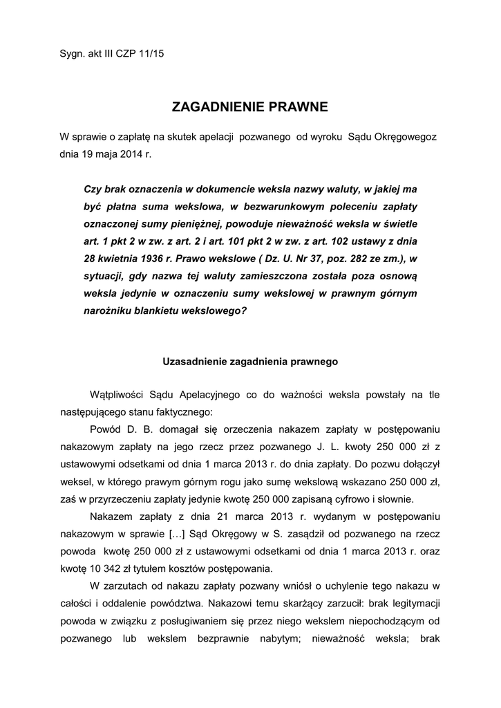 Sygn. akt III CZP 11/15 ZAGADNIENIE PRAWNE W sprawie o zapłatę na skutek apelacji pozwanego od wyroku Sądu Okręgowegoz dnia 19 maja 2014 r. Czy brak oznaczenia w dokumencie weksla nazwy waluty, w jakiej ma być płatna suma wekslowa, w bezwarunkowym poleceniu zapłaty oznaczonej sumy pieniężnej, powoduje nieważność weksla w świetle art. 1 pkt 2 w zw. z art. 2 i art. 101 pkt 2 w zw. z art. 102 ustawy z dnia 28 kwietnia 1936 r. Prawo wekslowe ( Dz. U. Nr 37, poz. 282 ze zm.), w sytuacji, gdy nazwa tej waluty zamieszczona została poza osnową weksla jedynie w oznaczeniu sumy wekslowej w prawnym górnym narożniku blankietu wekslowego? Uzasadnienie zagadnienia prawnego Wątpliwości Sądu Apelacyjnego co do ważności weksla powstały na tle następującego stanu faktycznego: Powód D. B. domagał się orzeczenia nakazem zapłaty w postępowaniu nakazowym zapłaty na jego rzecz przez pozwanego J. L. kwoty 250 000 zł z ustawowymi odsetkami od dnia 1 marca 2013 r. do dnia zapłaty. Do pozwu dołączył weksel, w którego prawym górnym rogu jako sumę wekslową wskazano 250 000 zł, zaś w przyrzeczeniu zapłaty jedynie kwotę 250 000 zapisaną cyfrowo i słownie. Nakazem zapłaty z dnia 21 marca 2013 r. wydanym w postępowaniu nakazowym w sprawie […] Sąd Okręgowy w S. zasądził od pozwanego na rzecz powoda kwotę 250 000 zł z ustawowymi odsetkami od dnia 1 marca 2013 r. oraz kwotę 10 342 zł tytułem kosztów postępowania. W zarzutach od nakazu zapłaty pozwany wniósł o uchylenie tego nakazu w całości i oddalenie powództwa. Nakazowi temu skarżący zarzucił: brak legitymacji powoda w związku z posługiwaniem się przez niego wekslem niepochodzącym od pozwanego lub wekslem bezprawnie nabytym; nieważność weksla; brak przedstawienia weksla do zapłaty; brak związku uzupełnionego weksla in blanco z umową zbycia udziału. Podnoszoną nieważność weksla pozwany wiązał z wadliwie oznaczonym miejscem płatności weksla. W toku postępowania pozwany ograniczył podnoszone zarzuty do zarzutu nieważności weksla i braku przedstawienia weksla do zapłaty. Na rozprawie w dniu 14 maja 2014 r. podtrzymał jedynie zarzut nieważności weksla uprzednio zmodyfikowany w piśmie z dnia 12 maja 2014r. i uzasadniony brakiem oznaczenia waluty przy kwocie 250 000. Powód wniósł o utrzymanie nakazu zapłaty w mocy, podnosząc, że weksel jest ważny. Wyrokiem z dnia 19 maja 2014 r. w sprawie […] Sąd Okręgowy w S. utrzymał zaskarżony nakaz w całości i orzekł o kosztach postępowania. Powyższe rozstrzygnięcie Sąd Okręgowy oparł na następujących ustaleniach faktycznych: Powód oraz pozwany byli wspólnikami spółki z ograniczoną odpowiedzialnością U. w L. W 2011 r. powód zawarł z pozwanym umowę sprzedaży udziałów w spółce, określając w niej ilość udziałów oraz wartość każdego udziału. W związku z dokonaną sprzedażą pozwany wręczył powodowi szereg weksli wypełnionych własnoręcznie przez pozwanego i przez niego podpisanych. Wszystkie weksle miały określone terminy zapłaty. Dodatkowo pozwany podpisał i wręczył powodowi weksel in blanco, na którym oprócz podpisu pozwany wpisał jedynie cyframi oraz słownie „250 000 dwieście pięćdziesiąt tysięcy”. Weksel w takiej postaci wypełniony został po to, aby powód w dowolnym terminie, w razie braku gotówki, mógł go wypełnić. Wszystkie weksle i rozliczenia pomiędzy stronami dokonywane były w walucie polskiej. Sporny weksel, oprócz podpisu oraz sumy wpisanej cyframi i słownie przez pozwanego, wypełniony został przez powoda. Powód wpisał też nazwę waluty po kwocie 250 000, mianowicie dopisał słowo „złotych”. W tak ustalonym stanie faktycznym Sąd Okręgowy uznał powództwo za zasadne. Sąd a quo wskazał, że weksel, w oparciu o który wydano nakaz zapłaty, był wekslem in blanco. Sąd ten uznał, że weksel jest ważny. Co prawda brak oznaczenia waluty, w jakiej wyrażono sumę wekslową, powoduje, że weksel jest nieważny, dotyczy to jednak tylko sytuacji, gdy nazwa waluty nie figuruje w żadnym miejscu dokumentu. Jeśli zaś tak, jak w niniejszej sprawie, została wymieniona jednokrotnie, weksel jest ważny. Ponadto Sąd wskazał, że strony dokonywały rozliczeń udziałów w spółce w walucie polskiej, wobec czego tylko ta waluta mogła być wpisana po wypełnieniu weksla przez powoda. W ocenie Sądu a quo powód posiadając weksel in blanco był uprawniony do wpisania nazwy waluty na mocy porozumienia, z którego wynikało, że przy użyciu weksli nastąpi rozliczenie z pozwanym po przerwaniu współpracy w U. Wszystkie inne weksle wystawione przez pozwanego także opiewały na walutę polską. Powyższy wyrok zaskarżył w całości pozwany. Wyrokowi temu skarżący zarzucił. 1) naruszenie przepisów prawa materialnego w postaci art. 65 § 1 kc w zw. z art. 101 pkt 2 ustawy Prawo wekslowe - poprzez ich błędną wykładnię przejawiającą się w uznaniu, że dokument określony przez powoda jako weksel jest wekslem, mimo że w jego treści brak jest oznaczenia sumy pieniężnej, a pozwany nie miał zamiaru zaciągać zobowiązania wekslowego; 2) naruszenie przepisów prawa materialnego w postaci art. 102 Prawa wekslowego poprzez jego niezastosowanie przejawiające się w uznaniu za weksel dokumentu, w treści którego nie została wskazana suma pieniężna; 3) naruszenie przepisów prawa procesowego w postaci art. 233 § 1 kpc poprzez błędną jego wykładnię przejawiającą się w pominięciu dowodu z zeznań J. L. złożonych podczas rozprawy, gdy stwierdził on, że nie miał zamiaru wystawiać dokumentu mającego cechy weksla własnego - naruszenie to miało istotny wpływ na rozstrzygnięcie sprawy, gdyż doprowadziło do błędnego ustalenia stanu faktycznego w postaci ustalenia przez Sąd I instancji, że pozwany wystawił dokument będący wekslem, podczas gdy w rzeczywistości dokument ten wekslem nie jest, a pozwany nie miał woli za