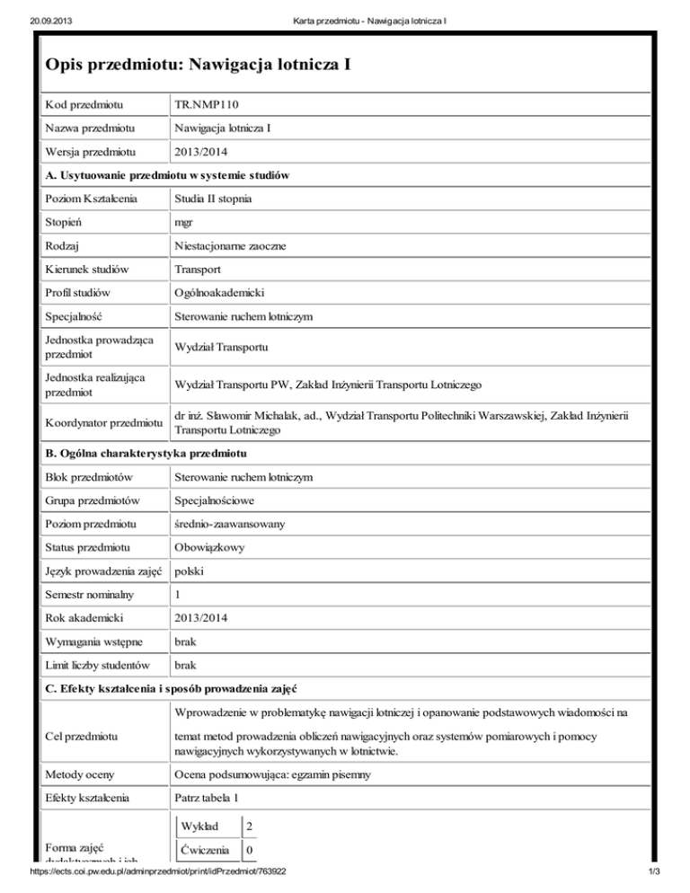 Opis przedmiotu: Nawigacja lotnicza I