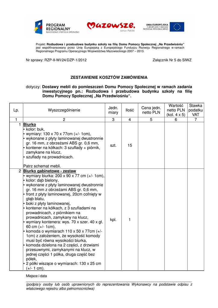 Projekt: Rozbudowa i przebudowa budynku szkoły na fili Domu Pomocy Społecznej „Na Przedwio niu” jest współfinansowany przez Uni Europejsk z Europejskiego Funduszu Rozwoju Regionalnego w ramach Regionalnego Programu Operacyjnego Województwa Mazowieckiego 2007 – 2013. Nr sprawy: RZP-II-WI/24/DZP-1/2012 Zał cznik Nr 5 do SIWZ ZESTAWIENIE KOSZTÓW ZAMÓWIENIA dotyczy: Dostawy mebli do pomieszcze Domu Pomocy Społecznej w ramach zadania inwestycyjnego pn.: Rozbudowa i przebudowa budynku szkoły na fili Domu Pomocy Społecznej „Na Przedwio niu“. Lp. Wyszczególnienie Jedn. miary 1 2 3 4 szt. 15 kpl. 1 1 Biurko • kolor: buk, • wymiary: 130 x 70 x 77cm (+/- 1cm), • wykonane z płyty laminowanej dwustronnie gr. 16 mm, z obrze ami ABS gr. 0,6 mm, • kontener na kółkach: 3 szuflady + piórnik, zamykane na klucz, • szuflady na prowadnicach. Patrz schemat mebli. 2 Biurko gabinetowe - zestaw • wymiary biurka: 200 x 90 x 77 cm (+/- 1cm), • kolor: d b bielony, • wykonane z płyty laminowanej dwustronnie gr. 16 mm z obrze ami ABS gr. 0,6 mm, • front z płyty laminowanej, 20cm cofni ty w gł b blatu, • boki z płyty laminowanej, • kontener na kółkach, z 3 szufladami na prowadnicach, z piórnikiem na prowadnicach, zamykany na klucz, • wymiary kontenera: wys. 70 x szer. 40 x gł. 60 cm (+/- 1cm), • komoda o wymiarach 110 x 50 x 77cm (+/1cm) z zało eniem, e wysoko komody musi by równa wysoko ci biurka, • komoda dzielona na 2 cz ci, z drzwiami przesuwnymi, zamykanymi na klucz, w jednej cz ci 1 półka, druga cz bez półek, • 2 półki wisz ce o wymiarach: 130 x 25 cm (+/- 1 cm). Ilo Cena jedn. netto PLN 5 Stawka Warto netto PLN podatku (kol. 4 x 5) VAT 6 7 Miejsce i data ______________________________________________________________________________________ (podpis/y osoby lub osób uprawnionych do reprezentowania Wykonawcy na podstawie odpisu z wła ciwego rejestru albo pełnomocnictwa) Nr sprawy: RZP-II-WI/24/DZP-1/2012 3 Biurko-zestaw • wykonane z płyty laminowanej dwustronnie gr.16 mm; • blat gr. 25 mm; • okleina: calvados, • wymiary: (140+120) x 70 x 77cm (+/- 1cm) wraz z ł cznikiem w kształcie 1/4 koła, • 2 kontenery 3-szufladowe na kółkach, wymiary: wys. 70 x szer. 40 x gł. 60 (+/1cm), zamykane na klucz, szuflady na prowadnicach,; • stela biurka ze stali malowanej proszkowo RAL 7035; • nadstawka na biurko z półkami, wymiary 120 x 20 x 30(h) cm (+/- 1cm); • pod dłu sz cz ci biurka – półka na klawiatur z płyty laminowanej; • od frontu płyty czołowe osłonowe laminowane, • 2 szafki cienne wisz ce, odkryte, bez pleców, boków i drzwi, składaj ce si z 3 półek o wymiarach 80 x 25 (+/- 1 cm) poł czonych ze sob prostopadle ł cznikami z tego samego materiału o wymiarach 25 x 25 cm (+/- 1 cm). Patrz schemat mebli. 4 Blat w wiatrołapie • wymiary 30 x 270cm (+/- 1cm), • płyta laminowana gr. 25 mm oklejona ABS gr. 2 mm, • kolor: buk. 5 Fotel obrotowy gabinetowy • obicie skóra naturalna w kolorze czerwonym, • na kółkach, • odchylane oparcie, blokada oparcia w wybranej pozycji, • regulowana wysoko siedziska za pomoc podno nika pneumatycznego, • wysoko : 1205 – 1295 mm (+/- 10mm), • wysoko oparcia: 725 mm (+/- 10mm), • noga: 480 – 570 mm (+/- 10mm), • szeroko podstawy jezdnej: 700 mm (+/- 10mm), • wysoko r czki od siedziska: 250 mm (+/- 10mm) • siedzisko szer. 580 mm x gł. 530 mm (+/20 mm) • podstawa jezdna z polerowanego aluminium lub chrom. Zał cznik Nr 5 do SIWZ kpl. 1 szt. 1 szt. 1 Miejsce i data ______________________________________________________________________________________ (podpis/y osoby lub osób uprawnionych do reprezentowania Wykonawcy na podstawie odpisu z wła ciwego rejestru albo pełnomocnictwa) 2/15 Nr sprawy: RZP-II-WI/24/DZP-1/2012 6 Fotel tapicerowany • sztuczna skóra w kolorze br z-czekolada, • siedzisko 40 x 50 cm (+/- 1 cm), • na kółkach. 7 Komoda • wymiary 80 x 43 x 115 cm (+/- 1 cm), • kolor: buk, • wykonana z płyty wiórowej laminowanej dwustronnie gr. 16 mm, • kraw dzie oklejone obrze em ABS gr. 0,6 mm; • drzwi zamykane na klucz, • 2 półki. Patrz schemat mebli. 8 Komoda • wymiary 80 x 43 x 115cm (+/- 1 cm), • kolor: d b bielony, • wykonane z płyty wiórowej laminowanej dwustronnie gr. 16 mm, • kraw dzie oklejone obrze em ABS gr. 0,6 mm, • drzwi przesuwne zamykane na klucz, • 2 półki. Patrz schemat mebli. 9 Kontener do biurka • wykonany z płyty laminowanej dwustronnie gr. 16 mm, • kraw dzie oklejone obrze em ABS gr. 0,6 mm, • kolor: buk, • 3 szuflady zamykane, na prowadnicach, • kontener na kółkach, • wysoko : 70cm (+/- 1 cm), • szeroko : 40 cm (+/- 1 cm), • gł boko : 60 cm (+/- 1 cm). Patrz schemat mebli. 10 Krzesło • tapicerowane skór ekologiczn , • kolor obicia: czerwony, • z oparciem, • na stela u metalowym, kolor chrom, • wysoko : 865 mm (+/- 10mm), • szeroko : 460 – 515 mm (+/- 10mm), • wysoko od podłogi do siedziska: 430 – 480 mm (+/- 10mm), • wysoko oparcia: 385 mm (+/- 10mm). 11 Krzesło • siedzisko i oparcie ze sklejki, • tapicerowane materiałem zmywalnym, Zał cznik Nr 5 do SIWZ szt. 10 szt. 16 szt. 1 szt. 2 szt. 14 szt. 138 Miejsce i data ______________________________________________________________________________________ (podpis/y osoby lub osób uprawnionych do reprezentowania Wykonawcy na podstawie odpisu z wła ciwego rejestru albo pełnomocnictwa) 3/15 Nr sprawy: RZP-II-WI/24/DZP-1/2012 Zał cznik Nr 5 do SIWZ na stela u metalowym, chromowanym nogi wyposa one w nakładki poziomuj ce, wysoko : 865 mm (+/- 20mm), wysoko od podłogi do siedziska: 450 mm (+/- 20mm), • siedzisko 400 x 400mm (+/- 10 mm), • z mo liwo ci składowania skomasowanego, • obicie w kolorze br z-czekolada. • • • • 12 Krzesło • siedzisko i oparcie ze sklejki, • tapicerowane materiałem zmywalnym, • na stela u metalowym, chromowanym • nogi wyposa one w nakładki 
