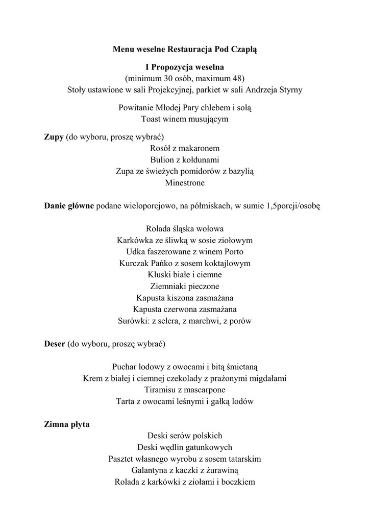 Menu weselne Restauracja Pod Czaplą I Propozycja weselna (minimum 30 osób, maximum 48) Stoły ustawione w sali Projekcyjnej, parkiet w sali Andrzeja Styrny Powitanie Młodej Pary chlebem i solą Toast winem musującym Zupy (do wyboru, proszę wybrać) Rosół z makaronem Bulion z kołdunami Zupa ze świeżych pomidorów z bazylią Minestrone Danie główne podane wieloporcjowo, na półmiskach, w sumie 1,5porcji/osobę Rolada śląska wołowa Karkówka ze śliwką w sosie ziołowym Udka faszerowane z winem Porto Kurczak Pańko z sosem koktajlowym Kluski białe i ciemne Ziemniaki pieczone Kapusta kiszona zasmażana Kapusta czerwona zasmażana Surówki: z selera, z marchwi, z porów Deser (do wyboru, proszę wybrać) Puchar lodowy z owocami i bitą śmietaną Krem z białej i ciemnej czekolady z prażonymi migdałami Tiramisu z mascarpone Tarta z owocami leśnymi i gałką lodów Zimna płyta Deski serów polskich Deski wędlin gatunkowych Pasztet własnego wyrobu z sosem tatarskim Galantyna z kaczki z żurawiną Rolada z karkówki z ziołami i boczkiem Roladki z szynki z żółtym serem i ogórkiem kiszonym Tymbaliki z drobiu Łosoś marynowany a’la Gravlax z sosem kaparowym Śledzik po wiejsku z kiszonymi ogórkami Omlet z camembertem i wędzoną makrelą Cukinia grillowana z fetą i pstrągiem Ogórki czaplowskie Pieczona papryka z oliwą i czosnkiem Sałatka jarzynowa Sałatka Szmaragdowa z brokułami i jajkiem Włoskie bułeczki, ciemne pieczywo, masło Smalec z grzybami I gorąca kolacja (do wyboru, proszę wybrać) Filecik hawajski z ananasem i serem, ziemniaki pieczone, surówka Colesław Filecik w kremowym sosie winnym, ryż jaśminowy, mix sałat z sosem vinegret Żeberka BBQ na chrupko, frytki, grillowane warzywa II gorąca kolacja (do wyboru, proszę wybrać) Pikantny bulion z nachosami Żurek z grzybami Barszczyk z krokietem Koszt menu wynosi 189,00 zł od osoby. W tej cenie podamy Państwu poniższe napoje bez ograniczeń: - Kawa rozpuszczalna - Herbata - Woda mineralna nie gazowana - Napoje owocowe Oraz w prezencie od Restauracji Voucher o wartości 200,00 złotych na Państwa pierwszą rocznicę ślubu (przy menu dla powyżej 30 osób) Proponujemy Państwu również : Tort w cenie od 45 do 65zł/kg – w zależności od rodzaju Owoce 5,00zł/os. Ciasto 8,00zł/os. Alkohol w promocyjnej cenie: Sobieski 0,5l w cenie 35,00zł/but Absolut 0,5l w cenie 45,00zł/but Finlandia 0,5l w cenie 55,00zł/but Piwo lane 0,5l w cenie 5,00zł Wino Ochagavia Medialuna – Chile, białe półwytrawne 30,00zł/but Wino Ochagavia Medialuna – Chile, czerwone półwytrawne 30,00zł/but Napoje w promocyjnej cenie: Cola 0,2l w cenie 3,00zł/but Fanta 0,2l w cenie 3,00zł/but Sprite 0,2l w cenie 3,00zł/but Woda gazowana 0,3l w cenie 2,00zł/but