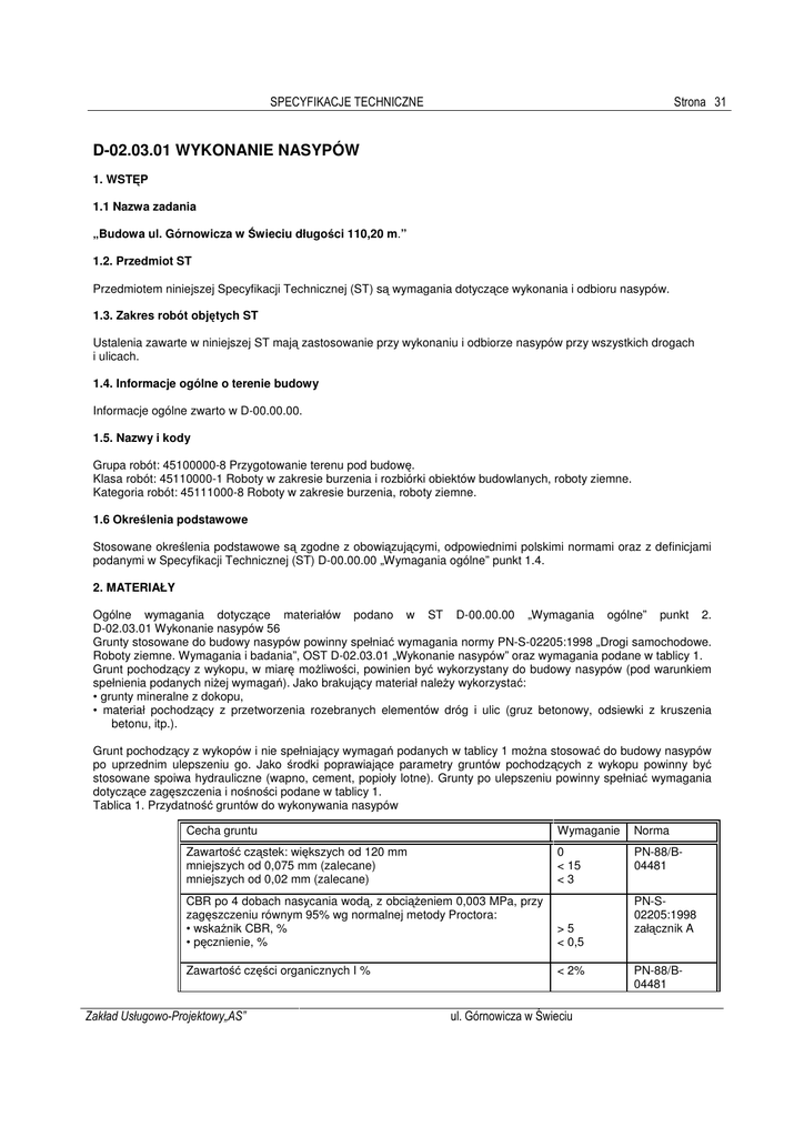SPECYFIKACJE TECHNICZNE Strona 31 D-02.03.01 WYKONANIE NASYPÓW 1. WSTĘP 1.1 Nazwa zadania „Budowa ul. Górnowicza w Świeciu długości 110,20 m.” 1.2. Przedmiot ST Przedmiotem niniejszej Specyfikacji Technicznej (ST) są wymagania dotyczące wykonania i odbioru nasypów. 1.3. Zakres robót objętych ST Ustalenia zawarte w niniejszej ST mają zastosowanie przy wykonaniu i odbiorze nasypów przy wszystkich drogach i ulicach. 1.4. Informacje ogólne o terenie budowy Informacje ogólne zwarto w D-00.00.00. 1.5. Nazwy i kody Grupa robót: 45100000-8 Przygotowanie terenu pod budowę. Klasa robót: 45110000-1 Roboty w zakresie burzenia i rozbiórki obiektów budowlanych, roboty ziemne. Kategoria robót: 45111000-8 Roboty w zakresie burzenia, roboty ziemne. 1.6 Określenia podstawowe Stosowane określenia podstawowe są zgodne z obowiązującymi, odpowiednimi polskimi normami oraz z definicjami podanymi w Specyfikacji Technicznej (ST) D-00.00.00 „Wymagania ogólne” punkt 1.4. 2. MATERIAŁY Ogólne wymagania dotyczące materiałów podano w ST D-00.00.00 „Wymagania ogólne” punkt 2. D-02.03.01 Wykonanie nasypów 56 Grunty stosowane do budowy nasypów powinny spełniać wymagania normy PN-S-02205:1998 „Drogi samochodowe. Roboty ziemne. Wymagania i badania”, OST D-02.03.01 „Wykonanie nasypów” oraz wymagania podane w tablicy 1. Grunt pochodzący z wykopu, w miarę możliwości, powinien być wykorzystany do budowy nasypów (pod warunkiem spełnienia podanych niżej wymagań). Jako brakujący materiał należy wykorzystać: • grunty mineralne z dokopu, • materiał pochodzący z przetworzenia rozebranych elementów dróg i ulic (gruz betonowy, odsiewki z kruszenia betonu, itp.). Grunt pochodzący z wykopów i nie spełniający wymagań podanych w tablicy 1 można stosować do budowy nasypów po uprzednim ulepszeniu go. Jako środki poprawiające parametry gruntów pochodzących z wykopu powinny być stosowane spoiwa hydrauliczne (wapno, cement, popioły lotne). Grunty po ulepszeniu powinny spełniać wymagania dotyczące zagęszczenia i nośności podane w tablicy 1. Tablica 1. Przydatność gruntów do wykonywania nasypów Cecha gruntu Wymaganie Norma Zawartość cząstek: większych od 120 mm mniejszych od 0,075 mm (zalecane) mniejszych od 0,02 mm (zalecane) 0 < 15 <3 PN-88/B04481 CBR po 4 dobach nasycania wodą, z obciążeniem 0,003 MPa, przy zagęszczeniu równym 95% wg normalnej metody Proctora: • wskaźnik CBR, % • pęcznienie, % >5 < 0,5 Zawartość części organicznych I % < 2% Zakład Usługowo-Projektowy„AS” ul. Górnowicza w Świeciu PN-S02205:1998 załącznik A PN-88/B04481 SPECYFIKACJE TECHNICZNE Strona 32 3 Najmniejsza maksymalna gęstość pozorna szkieletu gruntowego w normalnym badaniu Proctora >1,7 g/cm PN-88/B04481 Wskaźnik równoziarnistości U > 3,0 - Materiał przeznaczony do wbudowania w nasyp musi być zaakceptowany przez Inżyniera. 3. SPRZĘT Ogólne wymagania dotyczące sprzętu podano w ST D-00.00.00 „Wymagania ogólne” punkt 3. Do wykonania robót należy stosować: • walce wibracyjne okołkowane i gładkie, walce ogumione, ubijaki mechaniczne do zagęszczania, • spycharki i równiarki do formowania nasypu, • beczkowóz z ciśnieniowym systemem natrysku do nawilżania gruntu i sprzęt do wymieszania wody z gruntem, • sprzęt do spulchnienia gruntu dla celów przesuszenia. Wykonawca jest zobowiązany do używania jedynie takiego sprzętu, który nie spowoduje niekorzystnego wpływu na właściwości gruntu, zarówno w miejscach jego naturalnego zalegania, jak też w czasie odspajania, transportu, wbudowania i zagęszczania. Orientacyjny dobór sprzętu do zagęszczania oraz ilości przejść tego sprzętu potrzebnych do właściwego zagęszczenia należy przyjmować według OST D-02.03.01 „Wykonanie nasypów”. Ostatecznego doboru sprzętu zagęszczającego należy dokonać na podstawie wyników odcinka doświadczalnego wykonanego przed przystąpieniem do wykonywania nasypów. Sprzęt używany do wykonania każdego z elementów robót ziemnych musi być zaakceptowany przez Inżyniera. 4 TRANSPORT Ogólne wymagania dotyczące transportu podano w ST D-00.00.00 „Wymagania ogólne” punkt 4. Grunty pochodzące z wykopów zaleca się transportować bezpośrednio do miejsca wbudowania w nasyp i wbudowywać. W zależności od odległości transportu zaleca się użycie: • spycharek, • samochodów samowyładowczych, Materiały pochodzące z dokopu należy transportować samochodami samowyładowczymi. 5. WYKONANIE ROBÓT Ogólne wymagania dotyczące wykonania robót podano w ST D-00.00.00 „Wymagania ogólne” punkt 5. 5.1. Dokop Miejsce dokopu powinno być zatwierdzone przez Inżyniera po przedstawieniu mu wyników badań laboratoryjnych. Wykonawca jest zobowiązany do prowadzenia bieżących badań kontrolnych gruntów celu potwierdzenia ich przydatności do robót ziemnych. 5.2. Przygotowanie podłoża w obrębie podstawy nasypów Przed przystąpieniem do wykonywania nasypu należy w obrębie jego podstawy zakończyć roboty przygotowawcze, określone w Dokumentacji Projektowej oraz w ST. Wykonawca przy użyciu widocznych palików w odstępach nie większych niż 50 m wyznaczy zarysy krawędzi nasypu. Przed przystąpieniem do wykonywania nasypów Wykonawca dokona obmiaru terenu po zdjęciu warstwy humusu. Wykonawca powinien skontrolować wskaźnik zagęszczenia gruntów rodzimych, zalegających w górnej strefie podłoża nasypu o grubości 50 cm. Jeżeli wartość wskaźnika zagęszczenia jest mniejsza niż określona w tablicy 4, Wykonawca powinien dogęścić podłoże tak, aby powyższe wymaganie zostało spełnione. Tablica 4. Wymagane zagęszczenie podłoża nasypów Wskaźnik zagęszczenia I S Wtórny moduł odkształcenia E [MPa] 2 Grunty spoiste Grunty niespoiste Nawierzchnia 0,97 30 40 Chodniki 0,95 - - Zakład Usługowo-Projektowy„AS” ul. Górnowicza w Świeciu SPECYFIKACJE TECHNICZNE Strona 33 Na wszys