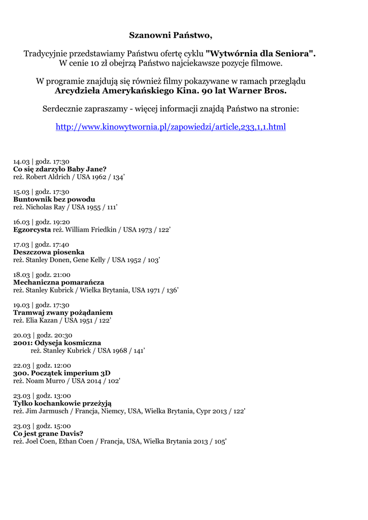 Szanowni Państwo, Tradycyjnie przedstawiamy Państwu ofertę cyklu "Wytwórnia dla Seniora". W cenie 10 zł obejrzą Państwo najciekawsze pozycje filmowe. W programie znajdują się również filmy pokazywane w ramach przeglądu Arcydzieła Amerykańskiego Kina. 90 lat Warner Bros. Serdecznie zapraszamy - więcej informacji znajdą Państwo na stronie: http://www.kinowytwornia.pl/zapowiedzi/article,233,1,1.html 14.03 | godz. 17:30 Co się zdarzyło Baby Jane? reż. Robert Aldrich / USA 1962 / 134’ 15.03 | godz. 17:30 Buntownik bez powodu reż. Nicholas Ray / USA 1955 / 111’ 16.03 | godz. 19:20 Egzorcysta reż. William Friedkin / USA 1973 / 122’ 17.03 | godz. 17:40 Deszczowa piosenka reż. Stanley Donen, Gene Kelly / USA 1952 / 103’ 18.03 | godz. 21:00 Mechaniczna pomarańcza reż. Stanley Kubrick / Wielka Brytania, USA 1971 / 136’ 19.03 | godz. 17:30 Tramwaj zwany pożądaniem reż. Elia Kazan / USA 1951 / 122’ 20.03 | godz. 20:30 2001: Odyseja kosmiczna reż. Stanley Kubrick / USA 1968 / 141’ 22.03 | godz. 12:00 300. Początek imperium 3D reż. Noam Murro / USA 2014 / 102' 23.03 | godz. 13:00 Tylko kochankowie przeżyją reż. Jim Jarmusch / Francja, Niemcy, USA, Wielka Brytania, Cypr 2013 / 122' 23.03 | godz. 15:00 Co jest grane Davis? reż. Joel Coen, Ethan Coen / Francja, USA, Wielka Brytania 2013 / 105'