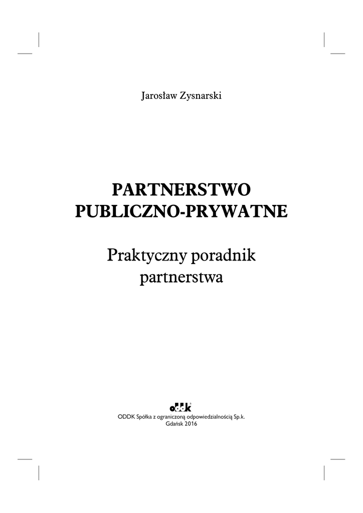Jarosław Zysnarski PARTNERSTWO PUBLICZNO-PRYWATNE Praktyczny poradnik partnerstwa ODDK Spółka z ograniczoną odpowiedzialnością Sp.k. Gdańsk 2016 Spis treści Słowniczek kluczowych pojęć i skrótów ..........................................................................................5 Wstęp .....................................................................................................................................................9 1. Zamiast wprowadzenia .................................................................................................................11 1.1. Czym jest, a czym nie jest PPP ..............................................................................................11 1.2. Najważniejsze akty prawne.....................................................................................................14 1.3. Jak podejść do projektu PPP, czyli procedura krok po kroku...........................................20 2. Identyfikacja potrzeb i wstępna koncepcja przedsięwzięcia ..................................................31 2.1. Trzy „P” na początek: potrzeby, problemy, priorytety ......................................................31 2.2. Kto może być stroną projektu PPP? .....................................................................................33 2.3. Do czego można i warto wykorzystać model PPP, czyli przedmiot PPP a zadania publiczne ............................................................................39 2.4. Jeszcze o działalności komercyjnej podmiotów publicznych ............................................45 3. Przygotowanie projektu ................................................................................................................51 3.1. Budowa zespołu i zarządzanie projektem.............................................................................51 3.2. Zadania zespołu roboczego.....................................................................................................55 3.3. Rola doradców zewnętrznych ................................................................................................58 3.4. Niezbędne analizy ...................................................................................................................64 4. Wybór modelu partnerstwa ..........................................................................................................69 4.1. Jaki mamy wybór, czyli możliwe opcje prawno-instytucjonalne ........................................69 4.2. „Opcja zerowa” – samodzielna realizacja przez podmiot publiczny........................................70 4.3. Ustawa o koncesji ....................................................................................................................72 4.4. Ustawa o PPP – bez powoływania spółki celowej ...............................................................75 4.5. Ustawa o PPP – z powołaniem spółki celowej .....................................................................80 4.6. Współpraca na podstawie ustawy autostradowej.................................................................88 4.7. Współpraca na podstawie ogólnych przepisów prawa ........................................................90 4.8. Którą ścieżkę wybrać?.............................................................................................................96 5. Analizy ...........................................................................................................................................101 5.1. Analizy rynku.........................................................................................................................101 5.2. Analiza finansowa projektu PPP .........................................................................................106 5.3. Analiza ekonomiczna – w tym badanie kosztów-korzyści ...............................................114 5.4. Kilka uwag o opłacalności projektów PPP ........................................................................122 5.5. Analizy ryzyka .......................................................................................................................129 5.6. Inne analizy ............................................................................................................................141 6. Procedury wdrożeniowe i wybór partnera................................................................................147 6.1. Działania związane z wdrożeniem projektu PPP ..............................................................147 6.2. Wybór partnera – przygotowanie i wdrożenie procedury................................................148 6.3. Przeprowadzenie procedury wyboru partnera – wybrane kwestie ......................................156 6.4. Podpisanie umowy i finansowe zamknięcie projektu.......................................................168 3 Spis treści 6.5. Zarządzanie umową...............................................................................................................177 6.6. Komunikacja w projekcie PPP ............................................................................................182 6.7. Zarządzanie ryzykiem w projekcie PPP .............................................................................185 7. Wybrane problemy partnerstwa ................................................................................................191 7.1. O różnych skrótach i ich znaczeniu, czyli rodzaje projektów PPP .....................................191 7.2. Tradycyjne formy PPP .........................................................................................................194 7.3. Pomoc publiczna w projektach PPP a usługi użyteczności publicznej ...............................................................................................................................199 7.4. Wpływ projektu PPP na dług pu