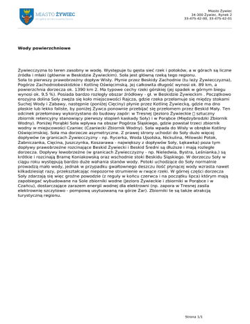 Miasto Żywiec 34-300 Żywiec, Rynek 2 33-475-42-00, 33-475-42-01 Wody powierzchniowe Żywiecczyzna to teren zasobny w wodę. Występuje tu gęsta sieć rzek i potoków, a w górach są liczne źródła i młaki (głównie w Beskidzie Żywieckim). Soła jest główną rzeką tego regionu. Soła to pierwszy prawobrzeżny dopływ Wisły. Płynie przez Beskidy Zachodnie (tu leży Żywiecczyzna), Pogórze Zachodniobeskidzkie i Kotlinę Oświęcimską. Jej całkowita długość wynosi ok. 89 km, a powierzchnia dorzecza ok. 1390 km 2. Ma typowe cechy rzeki górskiej (jej spadek w górnym biegu wynosi ok. 9,5 %). Posiada bardzo rozległy obszar źródłowy - gł. w Beskidzie Żywieckim . Początkowo erozyjna dolina Soły zwęża się koło miejscowości Rajcza, gdzie rzeka przełamuje się między stokami Suchej Wody i Zabawy, następnie (poniżej Cięciny) płynie przez Kotlinę Żywiecką, gdzie ma dno płaskie lub lekko faliste, by poniżej Żywca ponownie przebijać się przełomem przez Beskid Mały. Ten odcinek przełomowy wykorzystano do budowy zapór: w Tresnej (Jezioro Żywieckie sztuczny zbiornik retencyjny stanowiący pierwszy stopień kaskady Soły) i w Porąbce (Międzybrodzki Zbiornik Wodny). Poniżej Porąbki Soła wpływa na obszar Pogórza Śląskiego, gdzie powstał trzeci zbiornik wodny w miejscowości Czaniec (Czaniecki Zbiornik Wodny). Soła wpada do Wisły w obrębie Kotliny Oświęcimskiej. Soła ma dorzecze asymetryczne. Z prawej strony uchodzi do Soły dużo więcej dopływów (w granicach Żywiecczyzny - np. Rycerka, Woda Ujsolska, Nickulina, Milowski Potok, Żabniczanka, Cięcina, Juszczynka, Koszarawa - największy z dopływów Soły, Łękawka) poza tym dopływy prawobrzeżne rozcinające Beskid Żywiecki i Beskid Średni są dłuższe i mają rozległe dorzecza. Dopływy lewobrzeżne (w granicach Żywiecczyzny - np. Nieledwia, Bystra, Leśnianka,) są krótkie i rozcinają Bramę Koniakowską oraz wschodnie stoki Beskidu Śląskiego. W dorzeczu Soły w ciągu roku występują bardzo duże wahania stanów wody. Potoki uchodzące do Soły normalnie prowadzą mało wody, jednak w przypadku gwałtownego deszczu ilość płynącej wody wzrasta nawet kilkadziesiąt razy, przekształcając niepozorne strumienie w rwące rzeki. W górnej części dorzecza Soły zdarzają się więc groźne powodzie (z reguły w końcu czerwca i na początku lipca) którym mają zapobiegać wybudowane na Sole zbiorniki wodne (Jezioro Żywieckie i zbiorniki w Porąbce i w Czańcu), dostarczające zarazem energii wodnej dla elektrowni (np. zapora w Tresnej zasila elektrownię szczytowo - pompową usytuowaną na górze Żar). Zbiorniki te są także atrakcją turystyczną regionu. Strona 1/1 Powered by TCPDF (www.tcpdf.org)