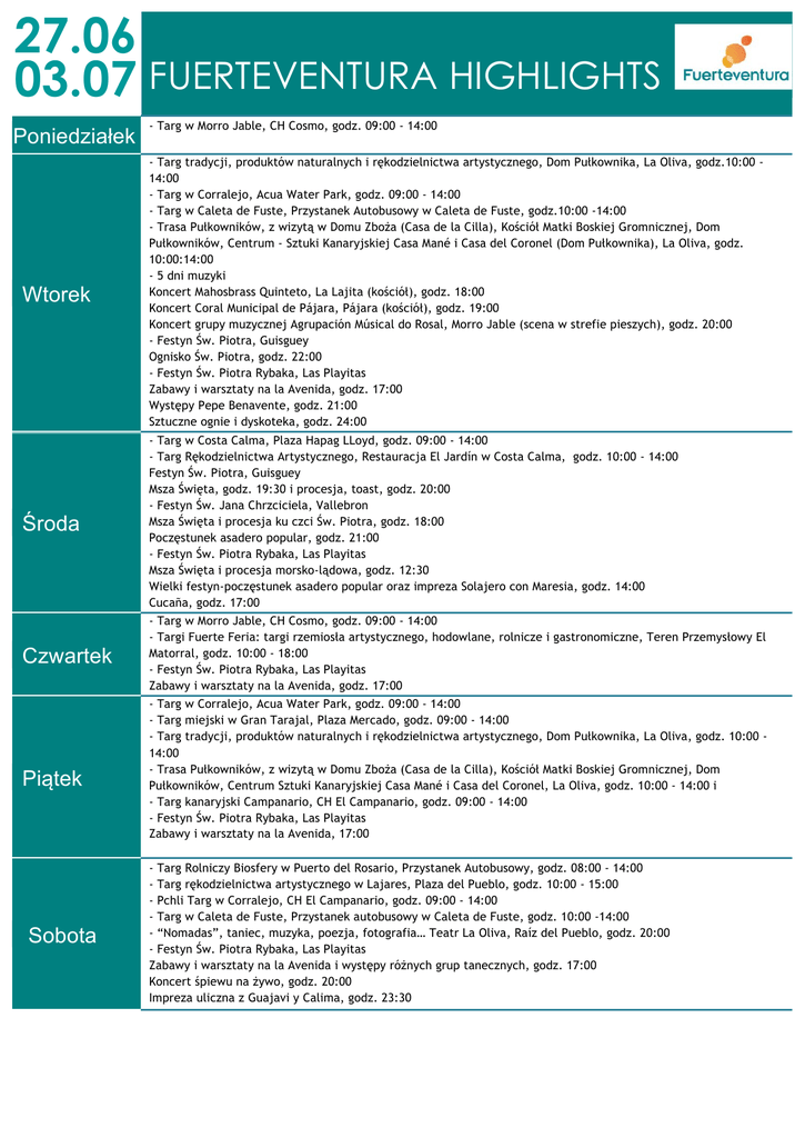 27.06 03.07 FUERTEVENTURA HIGHLIGHTS Poniedziałek - Targ w Morro Jable, CH Cosmo, godz. 09:00 - 14:00 Wtorek - Targ tradycji, produktów naturalnych i rękodzielnictwa artystycznego, Dom Pułkownika, La Oliva, godz.10:00 14:00 - Targ w Corralejo, Acua Water Park, godz. 09:00 - 14:00 - Targ w Caleta de Fuste, Przystanek Autobusowy w Caleta de Fuste, godz.10:00 -14:00 - Trasa Pułkowników, z wizytą w Domu Zboża (Casa de la Cilla), Kościół Matki Boskiej Gromnicznej, Dom Pułkowników, Centrum - Sztuki Kanaryjskiej Casa Mané i Casa del Coronel (Dom Pułkownika), La Oliva, godz. 10:00:14:00 - 5 dni muzyki Koncert Mahosbrass Quinteto, La Lajita (kościół), godz. 18:00 Koncert Coral Municipal de Pájara, Pájara (kościół), godz. 19:00 Koncert grupy muzycznej Agrupación Músical do Rosal, Morro Jable (scena w strefie pieszych), godz. 20:00 - Festyn Św. Piotra, Guisguey Ognisko Św. Piotra, godz. 22:00 - Festyn Św. Piotra Rybaka, Las Playitas Zabawy i warsztaty na la Avenida, godz. 17:00 Występy Pepe Benavente, godz. 21:00 Sztuczne ognie i dyskoteka, godz. 24:00 Środa - Targ w Costa Calma, Plaza Hapag LLoyd, godz. 09:00 - 14:00 - Targ Rękodzielnictwa Artystycznego, Restauracja El Jardín w Costa Calma, godz. 10:00 - 14:00 Festyn Św. Piotra, Guisguey Msza Święta, godz. 19:30 i procesja, toast, godz. 20:00 - Festyn Św. Jana Chrzciciela, Vallebron Msza Święta i procesja ku czci Św. Piotra, godz. 18:00 Poczęstunek asadero popular, godz. 21:00 - Festyn Św. Piotra Rybaka, Las Playitas Msza Święta i procesja morsko-lądowa, godz. 12:30 Wielki festyn-poczęstunek asadero popular oraz impreza Solajero con Maresia, godz. 14:00 Cucaña, godz. 17:00 Czwartek - Targ w Morro Jable, CH Cosmo, godz. 09:00 - 14:00 - Targi Fuerte Feria: targi rzemiosła artystycznego, hodowlane, rolnicze i gastronomiczne, Teren Przemysłowy El Matorral, godz. 10:00 - 18:00 - Festyn Św. Piotra Rybaka, Las Playitas Zabawy i warsztaty na la Avenida, godz. 17:00 Piątek Sobota - Targ w Corralejo, Acua Water Park, godz. 09:00 - 14:00 - Targ miejski w Gran Tarajal, Plaza Mercado, godz. 09:00 - 14:00 - Targ tradycji, produktów naturalnych i rękodzielnictwa artystycznego, Dom Pułkownika, La Oliva, godz. 10:00 14:00 - Trasa Pułkowników, z wizytą w Domu Zboża (Casa de la Cilla), Kościół Matki Boskiej Gromnicznej, Dom Pułkowników, Centrum Sztuki Kanaryjskiej Casa Mané i Casa del Coronel, La Oliva, godz. 10:00 - 14:00 i - Targ kanaryjski Campanario, CH El Campanario, godz. 09:00 - 14:00 - Festyn Św. Piotra Rybaka, Las Playitas Zabawy i warsztaty na la Avenida, 17:00 - Targ Rolniczy Biosfery w Puerto del Rosario, Przystanek Autobusowy, godz. 08:00 - 14:00 - Targ rękodzielnictwa artystycznego w Lajares, Plaza del Pueblo, godz. 10:00 - 15:00 - Pchli Targ w Corralejo, CH El Campanario, godz. 09:00 - 14:00 - Targ w Caleta de Fuste, Przystanek autobusowy w Caleta de Fuste, godz. 10:00 -14:00 - “Nomadas”, taniec, muzyka, poezja, fotografia… Teatr La Oliva, Raíz del Pueblo, godz. 20:00 - Festyn Św. Piotra Rybaka, Las Playitas Zabawy i warsztaty na la Avenida i występy różnych grup tanecznych, godz. 17:00 Koncert śpiewu na żywo, godz. 20:00 Impreza uliczna z Guajavi y Calima, godz. 23:30 - Targ rękodzielnictwa artystycznego Wysp Kanaryjskich w Corralejo, CH El Campanario, godz. 09:00 - 14:00 - Targ rolniczy i rękodzielnictwa artystycznego Oasis Park Fuerteventura - Ctra. Gral. de Jandía km 17 godz. 09:00 - 14:00 - Targ rzeczy yżywanych, Plaza de la Paz de Puerto del Rosario, godz. 08:00 do 14:00 - Festyn Św. Piotra Rybaka, Las Playitas Zabawy i warsztaty na la Avenida, godz. 12:00 ------------------------------------------------------------------------------------------------------------------------------------------- Wystawa “Surrealistyczne malowanie ciała. Nienawiść na płótnie”, autor Santiago Palenzuela, od 17 czerwca do 10 września, miejsce: Dom Pułkowników (Casa de los Coroneles), La Oliva Niedziela Wystawa “Anna Frank, żywa historia” w Domu Pułkowników od 23 czerwca do 10 września -------------------------------------------------------------------------------------------------------------------------------------------- Szanujlokalneobyczajeitradycjeoraznaszedziedzictwokulturowe.Pomóżnamchronićbudynkiimiejsca historyczne,archeologiczne,kulturoweireligijne: - Ubiór odpowiedni do odwiedzanych miejsc: kościołów, kaplic i muzeów. - Kupuj lokalne produkty na naszych targach i dowiedz się, jak zostały przygotowane. - Bierz udział w procesjach i odważ się założyć typowy strój kanaryjski. - Dołącz do wiejskich imprez, które odbywają się przez cały rok na wyspie.