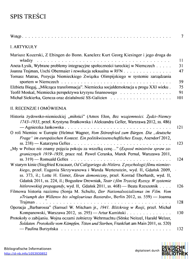 SPIS TREŚCI Wstęp 7 I. ARTYKUŁY Mariusz Kozerski, Z Ebingen do Bonn. Kanclerz Kurt Georg Kiesinger i jego droga do władzy Aneta Łysik, Wybrane problemy integracyjne społeczności tureckiej w Niemczech Joanna Trajman, Uschi Obermaier i rewolucja seksualna w RFN Tomasz Matras, Pozycja Niemieckiego Związku Olimpijskiego w systemie zarządzania sportem w Niemczech Elżbieta Biegaj, „Milcząca transformacja". Niemiecka socjaldemokracja u progu XXI wieku . Teofil Moskal, Niemiecka perspektywa kryzysu finansowego Michał Siekierka, Geneza oraz działalność SS-Galizien 11 31 47 59 75 91 101 II. RECENZJE I OMÓWIENIA Historia żydowsko-niemieckiej „miłości" (Amos Elon, Bez wzajemności. Żydzi-Niemcy 1743-1933, przeł. Krystyna Bratkowska i Aleksandra Geller, Warszawa 2012, ss. 486) — Agnieszka Jankowska O roli Niemiec w Europie (Helmut Wagner, Vom Stórenfried zum Biirgen. Die „deutsche Frage" im europćiischen Kontext. Ein politikwissenschaftliches Essay, Asendorf 2012, ss. 238) — Katarzyna Gelles „My w Polsce nie znamy pojęcia pokoju za wszelką cenę..." (Expose ministrów spraw za granicznych 1919-1939, prace red. Paweł Ceranka, Marek Pernal, Warszawa 2011, ss. 319) — Romuald Gelles W starym kinie (Siegfried Kracauer, Od Caligariego do Hitlera. Z psychologii filmu niemiec kiego, przeł. Eugenia Skrzywanowa i Wanda Wertenstein, wyd. II, Gdańsk 2009, ss. 373, il.; Lotte I-I. Eisner, Ekran demoniczny, przeł. Konrad Eberhardt, wyd. II, Gdańsk 2011, ss. 224, il.; Bogusław Drewniak, Teatr i film Trzeciej Rzeszy. W systemie hitlerowskiej propagandy, wyd. II, Gdańsk 2011, ss. 468)—Beata Rzeszotnik .... Filmowa historia nazizmu (Sonja M. Schultz, Der Nationalsozialismus im Film. Vom »Triumph des Willens« bis »lnglourious Baslerds«, Berlin 2012, ss. 559) — Joanna Trajman Operacja „Barbarossa" (Samuel W. Mitcham jr., 1941. Blitzkrieg w Rosji, przeł. Michał Kompanowski, Warszawa 2012, ss. 295) — Artur Kamiński Protokoły o zabijaniu. Wojna oczami żołnierzy Wehrmachtu (Sonke Neitzel, Harald Welzer, Soldaten. Protokolle vom Kampfen, Tóten und Sterben, Frankfurt am Main 2011, ss. 520) — Paulina Burzyńska http://d-nb.info/1053930852 121 123 124 126 128 130 132 SPIS TREŚCI SS-Galizien. Historia i pamięć (Michał Siekierka, SS-Calizien. Między ideologią nazi zmu, ukraińskim nacjonalizmem a zbrodniami, Wrocław 2012, ss. 208) — Krzysz tof Bulzacki Psychika nazistowskich zbrodniarzy wojennych (Gustave Mark Gilbert, Dziennik norym berski, przeł. Tomasz Łuczak, Warszawa 2012, ss. 528) — Paulina Burzyńska .... Nowa stara historia (Jerzy Holzer, Europa zimnej wojny, Kraków 2012, ss. 1088) — Michał Siekierka Sukces, który przerodził się w klęskę (David Clay Large, Munich 1972: Tragedy, Terror, and Triumph at the Otympic Games, San Prancisco 2012, ss. 372) — Tomasz Matras ... Filmy, które łączą i dzielą (Konrad Klejsa, Schamma Schahadat (red.), Deutschland und Polen. Filmische Grenzen und Nachbarschaften, „Marburger Schriften zur Medienforschung" 17, Marburg 2011, ss. 270) — Beata Rzeszotnik Świat, którego już nie ma (Rudiger von Fritsch, Stempel do wolności. Ucieczka z Niemiec do Niemiec, przeł. Kamila Gierko i Winfried Lipscher, Wrocław 2013, ss. 199) — Marek Kowalczyk Ambasador czasu zmian (Henri Froment-Meurice, Journal de Bonn. Ambassadeur de France de Schmidt a Kohl 1982-1983, Paris 2013, ss. 181) — Michał Wiącek Niebezpieczny spadek po dyktaturze SED (Uwe Muller, Grit Hartmann, Stasi. Zmowa nie pamięci, przeł. Ewa Stefańska, Poznań 2012, ss. 357) — Krzysztof Jagiełło „Rzeczpospolita silna jak nigdy!" (Expose ministrów spraw zagranicznych 1990-2011, prace red. Paweł Ceranka, Warszawa 2011, ss. 456) — Romuald Gelles Pięć wcieleń Joachima Gaucka (Norbert Robers, Joachim Gauck. Vom Pastor zum Prasidenten. Die Biographie, Munchen 2012, ss. 240) — Katarzyna Gelles 6 134 136 137 139 141 143 146 148 150 152 III. KRONIKA — S P R A W O Z D A N I A Aleksandra Kulpan, Debata o bezpieczeństwie Europy Mariusz Kozerski, Słowo o reorganizacji terytorialnej w NRD Mariusz Kozerski, Saksonia bliżej Dolnego Śląska Joanna Trajman, Romy Schneider — legenda ekranu Anna Umińska-Woroniecka, O Niemczech na kongresie politologicznym Paulina Burzyńska, Pamięć o pracy przymusowej w cyfrowym świecie 157 159 162 162 164 166 IV. Z ŻAŁOBNEJ KARTY Romuald Gelles, In memoriam: Profesor Adam Galos (1924-2013) 171 V. BIBLIOGRAFIA Indeks zawartości „Niemcoznawstwa" za lata 1992-2012, oprać. Katarzyna Gelles 177 Wykaz skrótów O autorach 191 193