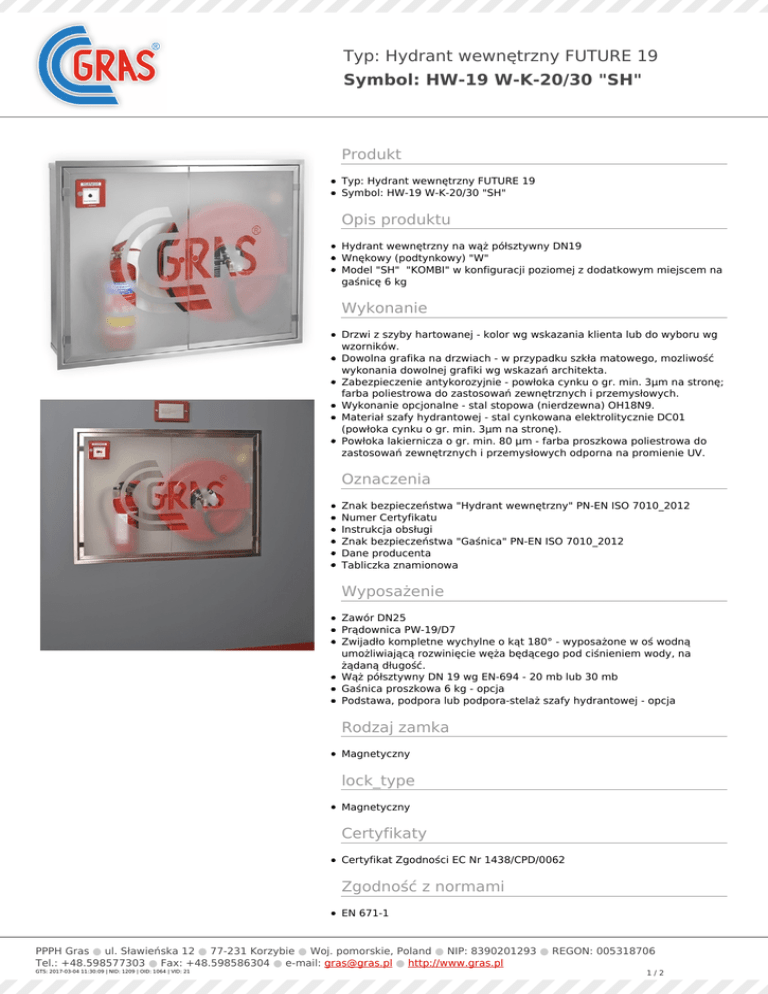 Typ: Hydrant wewnętrzny FUTURE 19 Symbol: HW-19 W-K-20/30 "SH" Produkt Typ: Hydrant wewnętrzny FUTURE 19 Symbol: HW-19 W-K-20/30 "SH" Opis produktu Hydrant wewnętrzny na wąż półsztywny DN19 Wnękowy (podtynkowy) "W" Model "SH" "KOMBI" w konfiguracji poziomej z dodatkowym miejscem na gaśnicę 6 kg Wykonanie Drzwi z szyby hartowanej - kolor wg wskazania klienta lub do wyboru wg wzorników. Dowolna grafika na drzwiach - w przypadku szkła matowego, mozliwość wykonania dowolnej grafiki wg wskazań architekta. Zabezpieczenie antykorozyjnie - powłoka cynku o gr. min. 3μm na stronę; farba poliestrowa do zastosowań zewnętrznych i przemysłowych. Wykonanie opcjonalne - stal stopowa (nierdzewna) OH18N9. Materiał szafy hydrantowej - stal cynkowana elektrolitycznie DC01 (powłoka cynku o gr. min. 3μm na stronę). Powłoka lakiernicza o gr. min. 80 μm - farba proszkowa poliestrowa do zastosowań zewnętrznych i przemysłowych odporna na promienie UV. Oznaczenia Znak bezpieczeństwa "Hydrant wewnętrzny" PN-EN ISO 7010_2012 Numer Certyfikatu Instrukcja obsługi Znak bezpieczeństwa "Gaśnica" PN-EN ISO 7010_2012 Dane producenta Tabliczka znamionowa Wyposażenie Zawór DN25 Prądownica PW-19/D7 Zwijadło kompletne wychylne o kąt 180° - wyposażone w oś wodną umożliwiającą rozwinięcie węża będącego pod ciśnieniem wody, na żądaną długość. Wąż półsztywny DN 19 wg EN-694 - 20 mb lub 30 mb Gaśnica proszkowa 6 kg - opcja Podstawa, podpora lub podpora-stelaż szafy hydrantowej - opcja Rodzaj zamka Magnetyczny lock_type Magnetyczny Certyfikaty Certyfikat Zgodności EC Nr 1438/CPD/0062 Zgodność z normami EN 671-1 PPPH Gras ● ul. Sławieńska 12 ● 77-231 Korzybie ● Woj. pomorskie, Poland ● NIP: 8390201293 ● REGON: 005318706 Tel.: +48.598577303 ● Fax: +48.598586304 ● e-mail: [email protected] ● http://www.gras.pl GTS: 2017-03-04 11:30:09 | NID: 1209 | OID: 1064 | VID: 21 1/2 Typ: Hydrant wewnętrzny FUTURE 19 Symbol: HW-19 W-K-20/30 "SH" Kolor RAL3000 (czerwony) - farba poliestrowa odporna na promienie UV. standard RAL9010 (biały) - farba poliestrowa odporna na promienie UV. - standard Inny - dostępne wszystkie kolory z palety RAL oraz specjalne. - opcja Kolory zwijadła RAL 3000 (czerwony) wg EN 671-1 Ciśnienie pracy Minimalne: 0.2 MPa Maksymalne: 1.2 MPa Wersje Model Szerokość Wysokość Głębokość Średnica zwijadła Długość węża Waga HW-19 W-K-20 "SH" 1000 mm 750 mm 170 mm 500 mm 20 m 42 kg HW-19 W-K-30 "SH" 1000 mm 750 mm 170 mm 600 mm 30 m 47 kg Informacje dodatkowe Zgodnie z wymogami rynkowymi i prawnymi, producent P.P.P.H. GRAS zastrzega sobie prawo do wprowadzania w dowolnej chwili zmian konstrukcyjnych w oferowanych szafach hydrantowych, nie zmieniając ich ogólnego characteru. Prezentowana w katalogu oferta nie stanowi oferty w rozumieniu Kodeksu Cywilnego. Ze w względu na ograniczenia wynikające z techniki druku, kolory reprodukowane w dokumencie mogą się różnić od rzeczywistych kolorów oferowanych produktów. Źródło: http://www.gras.pl/gpl/pl/Hydranty/Hydranty-DN19/Future/Hydrant-wewnetrzny-FUTURE-19-HW-19-W-K-20-30-SH Sygnatura: GTS: 2017-03-04 11:30:09 | NID: 1209 | OID: 1064 | VID: 21 PPPH Gras ● ul. Sławieńska 12 ● 77-231 Korzybie ● Woj. pomorskie, Poland ● NIP: 8390201293 ● REGON: 005318706 Tel.: +48.598577303 ● Fax: +48.598586304 ● e-mail: [email protected] ● http://www.gras.pl GTS: 2017-03-04 11:30:09 | NID: 1209 | OID: 1064 | VID: 21 2/2