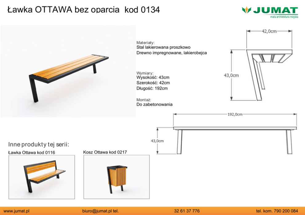 Ławka OTTAWA bez oparcia kod 0134 Materiały: Stal lakierowana proszkowo Drewno impregnowane, lakierobejca Wymiary: Wysokość: 43cm Szerokość: 42cm Długość: 192cm Montaż: Do zabetonowania Inne produkty tej serii: Ławka Ottawa kod 0116 www.jumat.pl Kosz Ottawa kod 0217 [email protected] tel. 32 61 37 776 tel. kom. 790 200 084