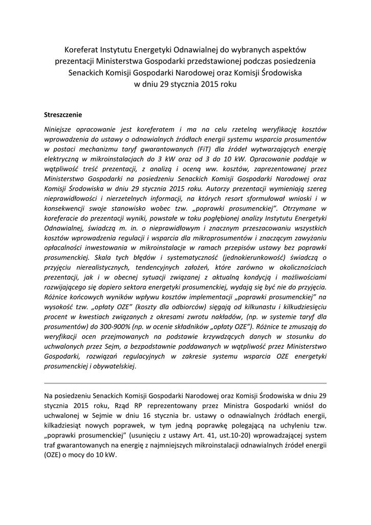 Koreferat Instytutu Energetyki Odnawialnej do wybranych aspektów prezentacji Ministerstwa Gospodarki przedstawionej podczas posiedzenia Senackich Komisji Gospodarki Narodowej oraz Komisji Środowiska w dniu 29 stycznia 2015 roku Streszczenie Niniejsze opracowanie jest koreferatem i ma na celu rzetelną weryfikację kosztów wprowadzenia do ustawy o odnawialnych źródłach energii systemu wsparcia prosumentów w postaci mechanizmu taryf gwarantowanych (FiT) dla źródeł wytwarzających energię elektryczną w mikroinstalacjach do 3 kW oraz od 3 do 10 kW. Opracowanie poddaje w wątpliwość treść prezentacji, z analizą i oceną ww. kosztów, zaprezentowanej przez Ministerstwo Gospodarki na posiedzeniu Senackich Komisji Gospodarki Narodowej oraz Komisji Środowiska w dniu 29 stycznia 2015 roku. Autorzy prezentacji wymieniają szereg nieprawidłowości i nierzetelnych informacji, na których resort sformułował wnioski i w konsekwencji swoje stanowisko wobec tzw. „poprawki prosumenckiej”. Otrzymane w koreferacie do prezentacji wyniki, powstałe w toku pogłębionej analizy Instytutu Energetyki Odnawialnej, świadczą m. in. o nieprawidłowym i znacznym przeszacowaniu wszystkich kosztów wprowadzenia regulacji i wsparcia dla mikroprosumentów i znaczącym zawyżaniu opłacalności inwestowania w mikroinstalacje w ramach przepisów ustawy bez poprawki prosumenckiej. Skala tych błędów i systematyczność (jednokierunkowość) świadczą o przyjęciu nierealistycznych, tendencyjnych założeń, które zarówno w okolicznościach prezentacji, jak i w obecnej sytuacji związanej z aktualną kondycją i możliwościami rozwijającego się dopiero sektora energetyki prosumenckiej, wydają się być nie do przyjęcia. Różnice końcowych wyników wpływu kosztów implementacji „poprawki prosumenckiej” na wysokość tzw. „opłaty OZE” (koszty dla odbiorców) sięgają od kilkunastu i kilkudziesięciu procent w kwestiach związanych z okresami zwrotu nakładów, (np. w systemie taryf dla prosumentów) do 300-900% (np. w ocenie składników „opłaty OZE”). Różnice te zmuszają do weryfikacji ocen przejmowanych na podstawie krzywdzących danych w stosunku do uchwalonych przez Sejm, a bezpodstawnie poddawanych w wątpliwość przez Ministerstwo Gospodarki, rozwiązań regulacyjnych w zakresie systemu wsparcia OZE energetyki prosumenckiej i obywatelskiej. Na posiedzeniu Senackich Komisji Gospodarki Narodowej oraz Komisji Środowiska w dniu 29 stycznia 2015 roku, Rząd RP reprezentowany przez Ministra Gospodarki wniósł do uchwalonej w Sejmie w dniu 16 stycznia br. ustawy o odnawialnych źródłach energii, kilkadziesiąt nowych poprawek, w tym jedną poprawkę polegającą na uchyleniu tzw. „poprawki prosumenckiej” (usunięciu z ustawy Art. 41, ust.10-20) wprowadzającej system traf gwarantowanych na energię z najmniejszych mikroinstalacji odnawialnych źródeł energii (OZE) o mocy do 10 kW. Uzasadnienie wniosku Rządu stanowiła prezentacja Ministra Gospodarki (MG) pt. „Wytwarzanie energii elektrycznej w mikroinstalacjach”, w której pojawiło się wiele wątpliwych założeń, nieprawdziwych informacji i czasami wręcz szokujących ocen kosztów i wyników analiz ekonomicznych. Wobec faktu, że prezentacja została przedstawiona Senatorom, którzy w oparciu o jej fikcyjne konkluzje będą podejmować decyzje w sprawie wniosku strony rządowej o uchyleniu przepisów pro-prosumenckich w ustawie o OZE oraz faktu, że informacje zawarte w prezentacji w postaci hasłowej (bez materiałów źródłowych i analiz) trafiły szeroko do opinii publicznej, Instytut Energetyki Odnawialnej (IEO) przygotował niniejszy koreferat prostujący fakty, uzupełniający podane w prezentacji informacje lub pokazujący w szerszym kontekście i innym świetle wyniki analiz MG. IEO, przygotowując poniższe uwagi, liczy na ich uwzględnienie w pracach Senatu, obok uwzględnienia argumentów i poparcia strony społecznej dla poprawki prosumenckiej (wyrażonej w niespotykanej do tej pory skali) oraz głęboko wierzy, że analiza wyników umożliwi zmianę podejścia do energetyki prosumenckiej i tym samym korektę stanowiska MG. Uwagi do części ekonomicznej i oceny kosztów wprowadzenia systemu taryf gwarantowanych FiT Ta cześć prezentacji MG zawiera najwięcej nieuprawnionych zarzutów wobec poprawki prosumenckiej. MG próbuje wyeksponować, jako powód wniosku rządowego o uchylenie poprawki prosumenckiej, fakt podniesienia stawki tzw. „opłaty OZE”1 z 2,51 zł/MWh (skutek całej ustawy o OZE, bez taryf mikroprosumenckich FiT) do wysokości 5,68 zł/MWh, w przypadku zachowania taryf FiT w ustawie. Ponad dwukrotny, szokujący wręcz wzrost „opłaty OZE” o 3,17 zł/MWh z tytułu wprowadzenia FiT zaadresowanych do jedynie niewielkiego segmentu prosumenckiego (max 800 MW nowych mocy do 2020 roku) został obliczony przy –niestety to widać od razu przyjętych w sposób niezwykle tendencyjnych i całkowicie nierealistycznych założeniach. Chodzi tu m.in. o takie założenia, jak: 1. całkowita moc mikroinstalacji objętych wsparciem taryfami FiT na lata 2016-2020 zostanie zrealizowana już w pierwszym roku; 2. już 1 stycznia 2016 roku, gdy przepisy wchodzą w życie, wszystkie mikroinstalacje będą przyłączone do sieci elektroenergetycznej i całkowicie gotowe do pracy. Przyjęto także dyskusyjną wartość, że chodzi o 150 tys. szt. mikroinstalacji oraz, że ich średnia moc jest mocą maksymalną dla danej podgrupy objętej systemem wsparcia, 1 „Oplata OZE”, choć w ustawie pojawia się ponad 70 razy, nie jest zdefiniowana. Prezentowana jest, jako koszt wdrożenia ustawy przeniesiony na cenę energii elektrycznej dla odbiorców końcowych. Nie mówi się o strukturze kosztów tej opłaty (podmioty, segmenty rynku oraz nabytych przez wcześniejszych inwestorów praw po 10-letnim funkcjonowaniu systemu zielonych certyfikatów), ani nie wyjaśnia się, że w ustawie podaw