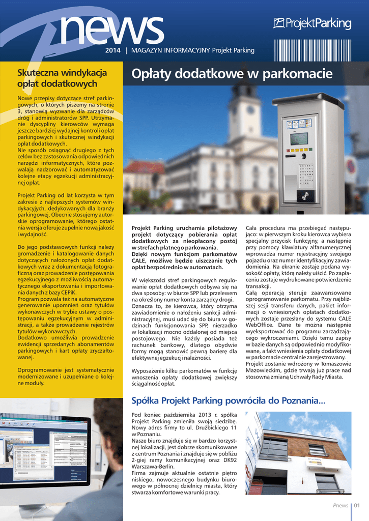 news 2014 | MAGAZYN INFORMACYJNY Projekt Parking Skuteczna windykacja opłat dodatkowych Opłaty dodatkowe w parkomacie Nowe przepisy dotyczące stref parkingowych, o których piszemy na stronie 3, stanowią wyzwanie dla zarządców dróg i administratorów SPP. Utrzymanie dyscypliny kierowców wymaga jeszcze bardziej wydajnej kontroli opłat parkingowych i skutecznej windykacji opłat dodatkowych. Nie sposób osiągnąć drugiego z tych celów bez zastosowania odpowiednich narzędzi informatycznych, które pozwalają nadzorować i automatyzować kolejne etapy egzekucji administracyjnej opłat. Projekt Parking od lat korzysta w tym zakresie z najlepszych systemów windykacyjych, dedykowanych dla branży parkingowej. Obecnie stosujemy autorskie oprogramowanie, którego ostatnia wersja oferuje zupełnie nową jakość i wydajność. Projekt Parking uruchamia pilotażowy projekt dotyczący pobierania opłat dodatkowych za nieopłacony postój w strefach płatnego parkowania. Dzięki nowym funkcjom parkomatów CALE, możliwe będzie uiszczanie tych opłat bezpośrednio w automatach. Do jego podstawowych funkcji należy gromadzenie i katalogowanie danych dotyczących nałożonych opłat dodatkowych wraz z dokumentacją fotograficzną oraz prowadzenie postępowania egzekucyjnego z możliwością automatycznego eksportowania i importowania danych z bazy CEPiK. Program pozwala też na automatyczne generowanie upomnień oraz tytułów wykonawczych w trybie ustawy o postępowaniu egzekucyjnym w administracji, a także prowadzenie rejestrów tytułów wykonawczych. Dodatkowo umożliwia prowadzenie ewidencji sprzedanych abonamentów parkingowych i kart opłaty zryczałtowanej. W większości stref parkingowych regulowanie opłat dodatkowych odbywa się na dwa sposoby: w biurze SPP lub przelewem na określony numer konta zarządcy drogi. Oznacza to, że kierowca, który otrzyma zawiadomienie o nałożeniu sankcji administracyjnej, musi udać się do biura w godzinach funkcjonowania SPP, nierzadko w lokalizacji mocno oddalonej od miejsca postojowego. Nie każdy posiada też rachunek bankowy, dlatego obydwie formy mogą stanowić pewną barierę dla efektywnej egzekucji należności. Oprogramowanie jest systematycznie modernizowane i uzupełniane o kolejne moduły. Wyposażenie kilku parkomatów w funkcję wnoszenia opłaty dodatkowej zwiększy ściągalność opłat. Cała procedura ma przebiegać następująco: w pierwszym kroku kierowca wybiera specjalny przycisk funkcyjny, a następnie przy pomocy klawiatury alfanumerycznej wprowadza numer rejestracyjny swojego pojazdu oraz numer identyfikacyjny zawiadomienia. Na ekranie zostaje podana wysokość opłaty, którą należy uiścić. Po zapłaceniu zostaje wydrukowane potwierdzenie transakcji. Całą operacją steruje zaawansowane oprogramowanie parkomatu. Przy najbliższej sesji transferu danych, pakiet informacji o wniesionych opłatach dodatkowych zostaje przesłany do systemu CALE WebOffice. Dane te można następnie wyeksportować do programu zarządzającego wykroczeniami. Dzięki temu zapisy w bazie danych są odpowiednio modyfikowane, a fakt wniesienia opłaty dodatkowej w parkomacie centralnie zarejestrowany. Projekt zostanie wdrożony w Tomaszowie Mazowieckim, gdzie trwają już prace nad stosowną zmianą Uchwały Rady Miasta. Spółka Projekt Parking powróciła do Poznania... Pod koniec października 2013 r. spółka Projekt Parking zmieniła swoją siedzibę. Nowy adres firmy to ul. Drużbickiego 11 w Poznaniu. Nasze biuro znajduje się w bardzo korzystnej lokalizacji, jest dobrze skomunikowane z centrum Poznania i znajduje się w pobliżu 2-giej ramy komunikacyjnej oraz DK92 Warszawa-Berlin. Firma zajmuje aktualnie ostatnie piętro niskiego, nowoczesnego budynku biurowego w północnej dzielnicy miasta, który stwarza komfortowe warunki pracy. Pnews 01 Pnews - MAGAZYN INFORMACYJNY Projekt Parking - 2014 Nowy oddział Projekt Parking: Strefa parkingowa w Tomaszowie Mazowieckim Pod koniec października 2013 roku firma Projekt Parking rozpoczęła administrowanie Strefą Płatnego Parkowania w Tomaszowie Mazowieckim. W ramach zamówienia publicznego, przez prawie 4 kolejne lata nasze przedsiębiorstwo będzie zajmowało się kompleksową obsługą SPP, a więc m.in. kontrolą wnoszenia opłat, prowadzeniem biura strefy i utrzymaniem sprawności technicznej urządzeń parkingowych. Obszar SPP obejmuje ok. 1500 miejsc postojowych, wyznaczonych na drogach gminnych i powiatowych, a do ich obsługi zainstalowano 69 parkomatów oraz udostępniono system moBILET. Tomaszów Mazowiecki położony jest w centralnej Polsce, 50 km na południowy wschód od Łodzi. Niegdyś bardzo ważny ośrodek przemysłu włókienniczego jest dziś miastem o usługowo-handlowym charakterze. Deficyt miejsc postojowych w śródmieściu Tomaszowa i problemy z parkowaniem skłoniły Radę Miejską do podjęcia uchwały o wprowadzeniu opłat parkingowych. W ogłoszonym przez Miasto i Powiat Tomaszowski przetargu na zorganizowanie SPP wyłoniono spółkę Projekt Parking, która posiada doświadczenie w realizacji kilkudziesięciu takich usług. teren i wykonała oznakowanie SPP. Do pobierania opłat dostarczono i zamontowano zasilane energią słoneczną parkomaty CALE CWT Compact, które dzięki klawiaturze alfanumerycznej umożliwiają wydruk numeru rejestracyjnego na bilecie, co skutecznie zapobiega próbom nadużycia i “handlu” biletami. Wszystkie urządzenia pracują w sieci zarządzanej zdalnie przez aplikację CWO, dostarczając na bieżąco wszystkie informacei statystyczne i serwisowe. Opłaty za faktyczny czas postoju można natomiast wygodnie wnosić przez komórkę, korzystając z systemu moBILET. namentowe i pobierane opłaty dodatkowe. Pracownicy biura SPP prowadzą bazę wykroczeń z dokumentacją fotograficzną, która stanowi podstawę dla postępowań windykacyjnych. Przeszkolone służby kontrolne wyposażono w pełne, profesjonalne umundurowanie, 