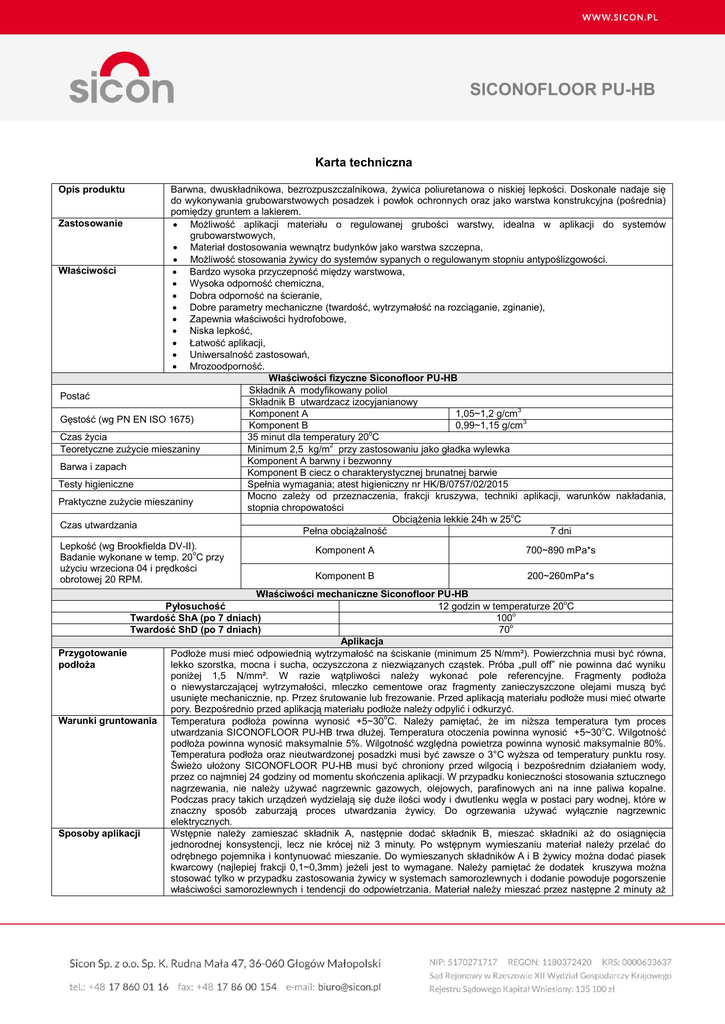 SICONOFLOOR PU-HB Karta techniczna Barwna, dwuskładnikowa, bezrozpuszczalnikowa, żywica poliuretanowa o niskiej lepkości. Doskonale nadaje się do wykonywania grubowarstwowych posadzek i powłok ochronnych oraz jako warstwa konstrukcyjna (pośrednia) pomiędzy gruntem a lakierem. Zastosowanie Możliwość aplikacji materiału o regulowanej grubości warstwy, idealna w aplikacji do systemów grubowarstwowych, Materiał dostosowania wewnątrz budynków jako warstwa szczepna, Możliwość stosowania żywicy do systemów sypanych o regulowanym stopniu antypoślizgowości. Właściwości Bardzo wysoka przyczepność między warstwowa, Wysoka odporność chemiczna, Dobra odporność na ścieranie, Dobre parametry mechaniczne (twardość, wytrzymałość na rozciąganie, zginanie), Zapewnia właściwości hydrofobowe, Niska lepkość, Łatwość aplikacji, Uniwersalność zastosowań, Mrozoodporność. Właściwości fizyczne Siconofloor PU-HB Składnik A modyfikowany poliol Postać Składnik B utwardzacz izocyjanianowy Komponent A 1,05~1,2 g/cm3 Gęstość (wg PN EN ISO 1675) Komponent B 0,99~1,15 g/cm3 Czas życia 35 minut dla temperatury 20oC Teoretyczne zużycie mieszaniny Minimum 2,5 kg/m2 przy zastosowaniu jako gładka wylewka Komponent A barwny i bezwonny Barwa i zapach Komponent B ciecz o charakterystycznej brunatnej barwie Testy higieniczne Spełnia wymagania; atest higieniczny nr HK/B/0757/02/2015 Mocno zależy od przeznaczenia, frakcji kruszywa, techniki aplikacji, warunków nakładania, Praktyczne zużycie mieszaniny stopnia chropowatości Obciążenia lekkie 24h w 25oC Czas utwardzania Pełna obciążalność 7 dni Opis produktu Lepkość (wg Brookfielda DV-II). Badanie wykonane w temp. 20oC przy użyciu wrzeciona 04 i prędkości obrotowej 20 RPM. Komponent A 700~890 mPa*s Komponent B 200~260mPa*s Właściwości mechaniczne Siconofloor PU-HB Pyłosuchość 12 godzin w temperaturze 20oC Twardość ShA (po 7 dniach) 100o Twardość ShD (po 7 dniach) 70o Aplikacja Przygotowanie Podłoże musi mieć odpowiednią wytrzymałość na ściskanie (minimum 25 N/mm²). Powierzchnia musi być równa, podłoża lekko szorstka, mocna i sucha, oczyszczona z niezwiązanych cząstek. Próba „pull off” nie powinna dać wyniku poniżej 1,5 N/mm². W razie wątpliwości należy wykonać pole referencyjne. Fragmenty podłoża o niewystarczającej wytrzymałości, mleczko cementowe oraz fragmenty zanieczyszczone olejami muszą być usunięte mechanicznie, np. Przez śrutowanie lub frezowanie. Przed aplikacją materiału podłoże musi mieć otwarte pory. Bezpośrednio przed aplikacją materiału podłoże należy odpylić i odkurzyć. Warunki gruntowania Temperatura podłoża powinna wynosić +5~30oC. Należy pamiętać, że im niższa temperatura tym proces utwardzania SICONOFLOOR PU-HB trwa dłużej. Temperatura otoczenia powinna wynosić +5~30oC. Wilgotność podłoża powinna wynosić maksymalnie 5%. Wilgotność względna powietrza powinna wynosić maksymalnie 80%. Temperatura podłoża oraz nieutwardzonej posadzki musi być zawsze o 3°C wyższa od temperatury punktu rosy. Świeżo ułożony SICONOFLOOR PU-HB musi być chroniony przed wilgocią i bezpośrednim działaniem wody, przez co najmniej 24 godziny od momentu skończenia aplikacji. W przypadku konieczności stosowania sztucznego nagrzewania, nie należy używać nagrzewnic gazowych, olejowych, parafinowych ani na inne paliwa kopalne. Podczas pracy takich urządzeń wydzielają się duże ilości wody i dwutlenku węgla w postaci pary wodnej, które w znaczny sposób zaburzają proces utwardzania żywicy. Do ogrzewania używać wyłącznie nagrzewnic elektrycznych. Sposoby aplikacji Wstępnie należy zamieszać składnik A, następnie dodać składnik B, mieszać składniki aż do osiągnięcia jednorodnej konsystencji, lecz nie krócej niż 3 minuty. Po wstępnym wymieszaniu materiał należy przelać do odrębnego pojemnika i kontynuować mieszanie. Do wymieszanych składników A i B żywicy można dodać piasek kwarcowy (najlepiej frakcji 0,1~0,3mm) jeżeli jest to wymagane. Należy pamiętać że dodatek kruszywa można stosować tylko w przypadku zastosowania żywicy w systemach samorozlewnych i dodanie powoduje pogorszenie właściwości samorozlewnych i tendencji do odpowietrzania. Materiał należy mieszać przez następne 2 minuty aż SICONOFLOOR PU-HB System samorozlewny System sypany (antypoślizgowy, do stosowania wewnątrz) Warunki przechowywania komponentów zestawu Warunki BHP Uwagi końcowe do uzyskania jednorodnej mieszaniny. Proporcje mieszania Komponentu A i Komponentu B są podane na opakowaniach i nie wolno ich zmieniać. Zmiana proporcji skutkuje otrzymaniem produktu o właściwościach odbiegających od deklarowanych przez Producenta. Zbyt długie mieszanie może spowodować napowietrzenie żywicy i dlatego należy go unikać. Do mieszania żywicy należy używać wolnoobrotowego mieszadła elektrycznego (300 ~ 400 obrotów na minutę) lub innego odpowiedniego sprzętu. Do żywicy nie wolno dolewać żadnych substancji obcych takich jak rozpuszczalniki. Na utwardzonym i zagruntowanym podłożu (grunt SICONOFLOOR GF-E) należy rozprowadzić SICONOFLOOR PU-HB na żądaną grubość za pomocą pacy lub rakli na specjalnych zębach. Tak rozprowadzoną żywicę należy odpowietrzyć za pomocą wałka z kolcami. Obciążenia lekkie możliwe są po 24 godzinach od momentu skończenia aplikacji ostatniej warstwy. Po skończonej pracy narzędzia należy od razu po użyciu umyć acetonem bądź ksylenem. Utwardzony lub związany materiał można usunąć tylko mechanicznie. Na utwardzone, zagruntowane i posypane podłoże nanosimy odpowiednio wymieszaną żywicę za pomocą metalowej pacy do momentu równomiernego rozprowadzenia żywicy na żądanej powierzchni. Tak rozprowadzony materiał należy posypać kruszywem o żądanej frakcji do pełnego zasypania żywicy (niewidoczne barwne plamy po materiale SICONOFLOOR PU-H
