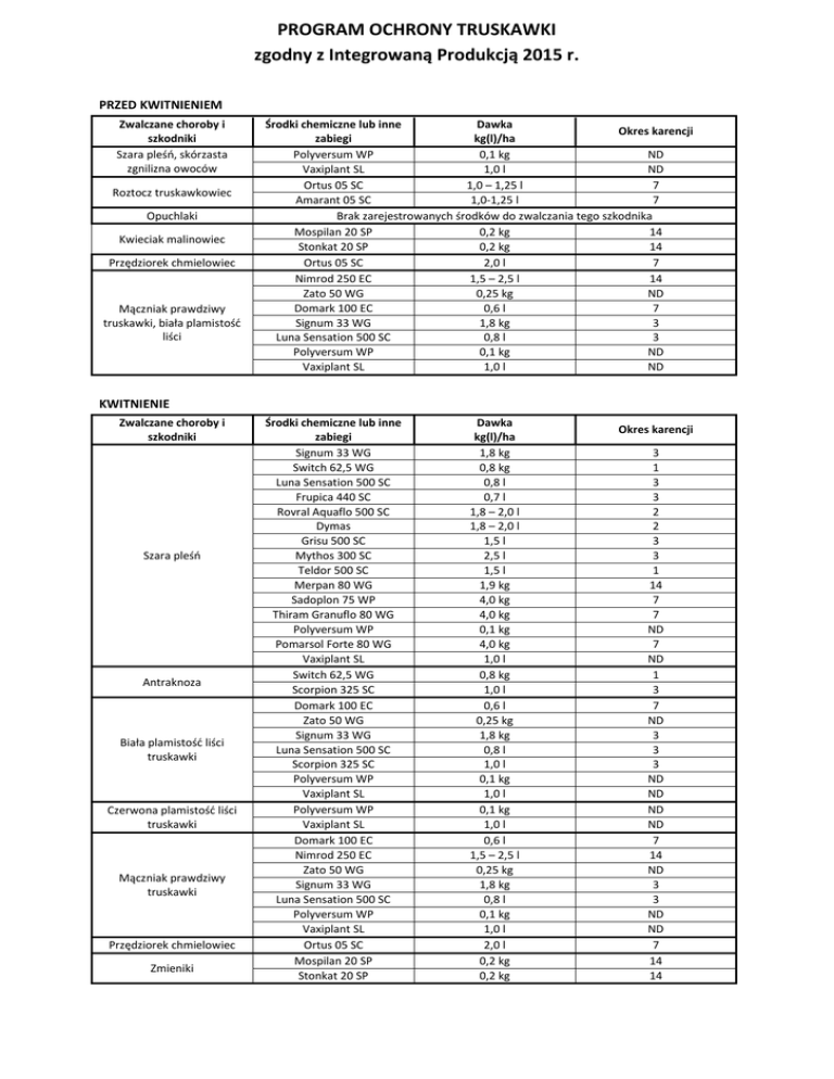 PROGRAM OCHRONY TRUSKAWKI zgodny z Integrowaną Produkcją 2015 r. PRZED KWITNIENIEM Zwalczane choroby i szkodniki Szara pleśń, skórzasta zgnilizna owoców Roztocz truskawkowiec Opuchlaki Kwieciak malinowiec Przędziorek chmielowiec Mączniak prawdziwy truskawki, biała plamistość liści Środki chemiczne lub inne Dawka Okres karencji zabiegi kg(l)/ha Polyversum WP 0,1 kg ND Vaxiplant SL 1,0 l ND Ortus 05 SC 1,0 – 1,25 l 7 Amarant 05 SC 1,0-1,25 l 7 Brak zarejestrowanych środków do zwalczania tego szkodnika Mospilan 20 SP 0,2 kg 14 Stonkat 20 SP 0,2 kg 14 Ortus 05 SC 2,0 l 7 Nimrod 250 EC 1,5 – 2,5 l 14 Zato 50 WG 0,25 kg ND Domark 100 EC 0,6 l 7 Signum 33 WG 1,8 kg 3 Luna Sensation 500 SC 0,8 l 3 Polyversum WP 0,1 kg ND Vaxiplant SL 1,0 l ND KWITNIENIE Zwalczane choroby i szkodniki Szara pleśń Antraknoza Biała plamistość liści truskawki Czerwona plamistość liści truskawki Mączniak prawdziwy truskawki Przędziorek chmielowiec Zmieniki Środki chemiczne lub inne zabiegi Signum 33 WG Switch 62,5 WG Luna Sensation 500 SC Frupica 440 SC Rovral Aquaflo 500 SC Dymas Grisu 500 SC Mythos 300 SC Teldor 500 SC Merpan 80 WG Sadoplon 75 WP Thiram Granuflo 80 WG Polyversum WP Pomarsol Forte 80 WG Vaxiplant SL Switch 62,5 WG Scorpion 325 SC Domark 100 EC Zato 50 WG Signum 33 WG Luna Sensation 500 SC Scorpion 325 SC Polyversum WP Vaxiplant SL Polyversum WP Vaxiplant SL Domark 100 EC Nimrod 250 EC Zato 50 WG Signum 33 WG Luna Sensation 500 SC Polyversum WP Vaxiplant SL Ortus 05 SC Mospilan 20 SP Stonkat 20 SP Dawka kg(l)/ha 1,8 kg 0,8 kg 0,8 l 0,7 l 1,8 – 2,0 l 1,8 – 2,0 l 1,5 l 2,5 l 1,5 l 1,9 kg 4,0 kg 4,0 kg 0,1 kg 4,0 kg 1,0 l 0,8 kg 1,0 l 0,6 l 0,25 kg 1,8 kg 0,8 l 1,0 l 0,1 kg 1,0 l 0,1 kg 1,0 l 0,6 l 1,5 – 2,5 l 0,25 kg 1,8 kg 0,8 l 0,1 kg 1,0 l 2,0 l 0,2 kg 0,2 kg Okres karencji 3 1 3 3 2 2 3 3 1 14 7 7 ND 7 ND 1 3 7 ND 3 3 3 ND ND ND ND 7 14 ND 3 3 ND ND 7 14 14 PO ZBIORZE OWOCÓW Zwalczane choroby i szkodniki Szara pleśń Biała plamistość liści truskawki Mączniak prawdziwy truskawki Roztocz truskawkowiec Przędziorek chmielowiec Chrząszcze opuchlaków Środki chemiczne lub inne zabiegi Dawka kg(l)/ha Okres karencji Pomarsol Forte 80 WG Sadoplon 75 WP Thiram Granuflo 80 WG Vaxiplant SL Domark 100 EC Zato 50 WG Vaxiplant SL Nimrod 250 EC Domark 100 EC Zato 50 WG Vaxiplant SL Ortus 05 SC Amarant 05 SC Ortus 05 SC Mospilan 20 SP Stark 20 SP Stonkat 20 SP 4,0 kg 4,0 kg 4,0 kg 1,0 l 0,6 l 0,25 kg 1,0 l 1,5 – 2,5 l 0,6 l 0,25 kg 1,0 l 1,0 – 1,25 l 1,0 – 1,25 l 2,0 l 0,3 kg 0,3 kg 0,3 kg 7 7 7 ND 7 ND ND 14 7 ND ND 7 7 7 14 ND 14
