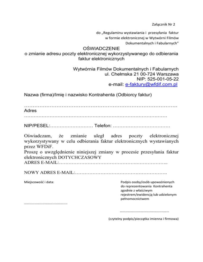 Załącznik Nr 2 do „Regulaminu wystawiania i przesyłania faktur w formie elektronicznej w Wytwórni Filmów Dokumentalnych i Fabularnych” OŚWIADCZENIE o zmianie adresu poczty elektronicznej wykorzystywanego do odbierania faktur elektronicznych Wytwórnia Filmów Dokumentalnych i Fabularnych ul. Chełmska 21 00-724 Warszawa NIP: 525-001-05-22 e-mail: [email protected] Nazwa (firma)/Imię i nazwisko Kontrahenta (Odbiorcy faktur) ……………………………………………………………………………… Adres ……………………………………………………………………………… NIP/PESEL:……………………… Telefon: ……………………………… Oświadczam, że zmianie uległ adres poczty elektronicznej wykorzystywany w celu odbierania faktur elektronicznych wystawianych przez WFDiF. Proszę o uwzględnienie niniejszej zmiany w procesie przesyłania faktur elektronicznych DOTYCHCZASOWY ADRES E-MAIL:………………………………………….……………….. NOWY ADRES E-MAIL:…………………………………………………. Miejscowość i data: Podpis osoby/osób upoważnionych do reprezentowania Kontrahenta zgodnie z właściwym rejestrem/ewidencją lub udzielonym pełnomocnictwem ………………………………………….. ………………………………………………… (czytelny podpis/pieczątka imienna i firmowa)