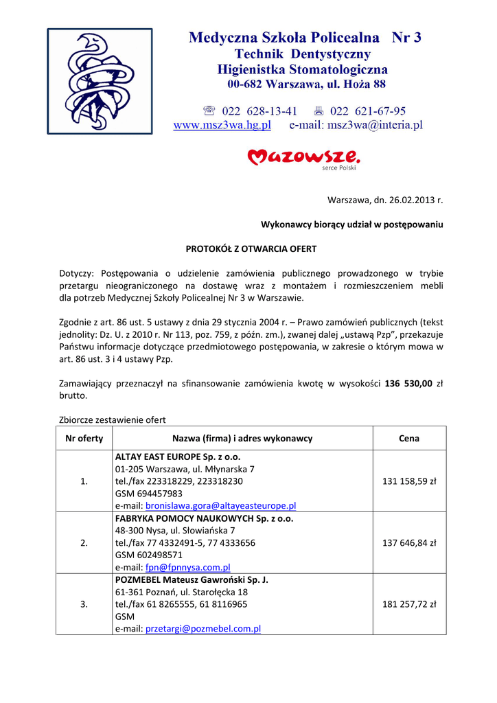 Warszawa, dn. 26.02.2013 r. Wykonawcy biorący udział w postępowaniu PROTOKÓŁ Z OTWARCIA OFERT Dotyczy: Postępowania o udzielenie zamówienia publicznego prowadzonego w trybie przetargu nieograniczonego na dostawę wraz z montażem i rozmieszczeniem mebli dla potrzeb Medycznej Szkoły Policealnej Nr 3 w Warszawie. Zgodnie z art. 86 ust. 5 ustawy z dnia 29 stycznia 2004 r. – Prawo zamówień publicznych (tekst jednolity: Dz. U. z 2010 r. Nr 113, poz. 759, z późn. zm.), zwanej dalej „ustawą Pzp”, przekazuje Państwu informacje dotyczące przedmiotowego postępowania, w zakresie o którym mowa w art. 86 ust. 3 i 4 ustawy Pzp. Zamawiający przeznaczył na sfinansowanie zamówienia kwotę w wysokości 136 530,00 zł brutto. Zbiorcze zestawienie ofert Nr oferty 1. 2. 3. Nazwa (firma) i adres wykonawcy ALTAY EAST EUROPE Sp. z o.o. 01-205 Warszawa, ul. Młynarska 7 tel./fax 223318229, 223318230 GSM 694457983 e-mail: [email protected] FABRYKA POMOCY NAUKOWYCH Sp. z o.o. 48-300 Nysa, ul. Słowiańska 7 tel./fax 77 4332491-5, 77 4333656 GSM 602498571 e-mail: [email protected] POZMEBEL Mateusz Gawroński Sp. J. 61-361 Poznań, ul. Starołęcka 18 tel./fax 61 8265555, 61 8116965 GSM e-mail: [email protected] Cena 131 158,59 zł 137 646,84 zł 181 257,72 zł Nr oferty 4. 5. 6. 7. 8. 9. 10. 11. 12. Nazwa (firma) i adres wykonawcy Przedsiębiorstwo Produkcyjno-Usługowo-Handlowe “Pro-Kall-Hand” Sp. z o.o. 00-517 Warszawa, ul. Marszałkowska 80 tel./fax 34 3181040, 34 3181213 GSM e-mail: [email protected] F.H.U. ANEX Wiesław Stanuszek 33-100 Tarnów, ul. Braci Żmudów 35B tel./fax 14 6224881 GSM 604844784 e-mail: [email protected] ALNAG Barbara Wróbel 30-102 Kraków, ul. Syrokomli 10/15 tel./fax 12 2702689 GSM 501106827 e-mail: [email protected] SEPAR-MEBLE mgr inż. Arkadiusz Piechowski 10-404 Olsztyn, ul. Lubelska 3 tel./fax 89 5344399 GSM e-mail: [email protected] CEZAS-GLOB Sp. z o.o. 10-419 Olsztyn, ul. Żelazna 2 tel./fax 89 5334265, 89 5335427 GSM 503196598 e-mail: [email protected] COBRABID-PWD Sp. z o.o. 02-134 Warszawa, ul. 1-go Sierpnia 32 tel./fax 22 8468763 GSM 505145206 e-mail: [email protected] STALDREW M. Czwarnok, G. Woźniak-Głażewska Sp. J. 05-311 Dębe Wielkie, Ostrów-Kania 21A tel./fax 22 8392826, 22 8393863 GSM e-mail: [email protected] Przedsiębiorstwo Zaopatrzenia Szkół “CEZAS” Sp. z o.o. 20-704 Lublin, ul. Morgowa 1 tel./fax 81 5258693 GSM 693100025 e-mail: [email protected] Przedsiębiorstwo Zaopatrzenia Szkół „CEZAS” Sp. z o.o. 25 -562 Kielce, ul. Peryferyjna 12 tel./fax 41 3315172, 41 3312379 GSM 509722052 e-mail: [email protected] Cena 135 939,60 zł 143 172,00 zł 191 000,00 zł 153 562,00 zł 131 384,91 zł 120 312,04 zł 131 376,30 zł 162 723,24 zł 123 248,46 zł Nr oferty 13. 14. 15. 16. 17. 18. Nazwa (firma) i adres wykonawcy Przedsiębiorstwo Zaopatrzenia Szkół „CEZAS” Sp. z o.o. 15-751 Białystok, Aleja Solidarności 15 tel./fax 85 6628920, 85 6628923 GSM 668852573 e-mail: [email protected] Przedsiębiorstwo Handlowo-Produkcyjne AKMA Zbigniew Podstawski 33-132 Niedomice, ul. Długa 43 tel./fax 14 6458777, 14 6458778 GSM 512286210 e-mail: [email protected] ZPH LUMAR Jacek Ogórkiewicz 85-374 Bydgoszcz, ul. Wierzbowa 3 tel./fax 52 3220812, 52 3287633 GSM 502479619 e-mail: [email protected] WIDE SERVICE COMPANY (WISECOM) Sławosz Ryszka 43-308 Bielsko-Biała, ul. Wadowicka 11/28 tel./fax 33 8221888, 33 8221889 GSM 883769869 e-mail: [email protected] METALBIT Andrzej Kończyk 78-460 Barwice, ul. Zwycięzców 26 tel./fax 94 3732656 GSM 886136148 e-mail: [email protected] JARD Sp. z o.o. 00-488 Warszawa, ul. Al. Na Skarpie 21/11 tel./fax 22 6692195, 22 6691971 GSM 601327756 e-mail: [email protected] Cena 143 371,26 zł 109 937,40 zł 139 730,37 zł 120 079,98 zł 148 239,87 zł 149 981,28 zł Zgodnie z art. 27 ust. 2 ustawy Pzp proszę o niezwłoczne potwierdzenie faktu otrzymania niniejszego zawiadomienia. (Podpis zamawiającego lub osoby upoważnionej)