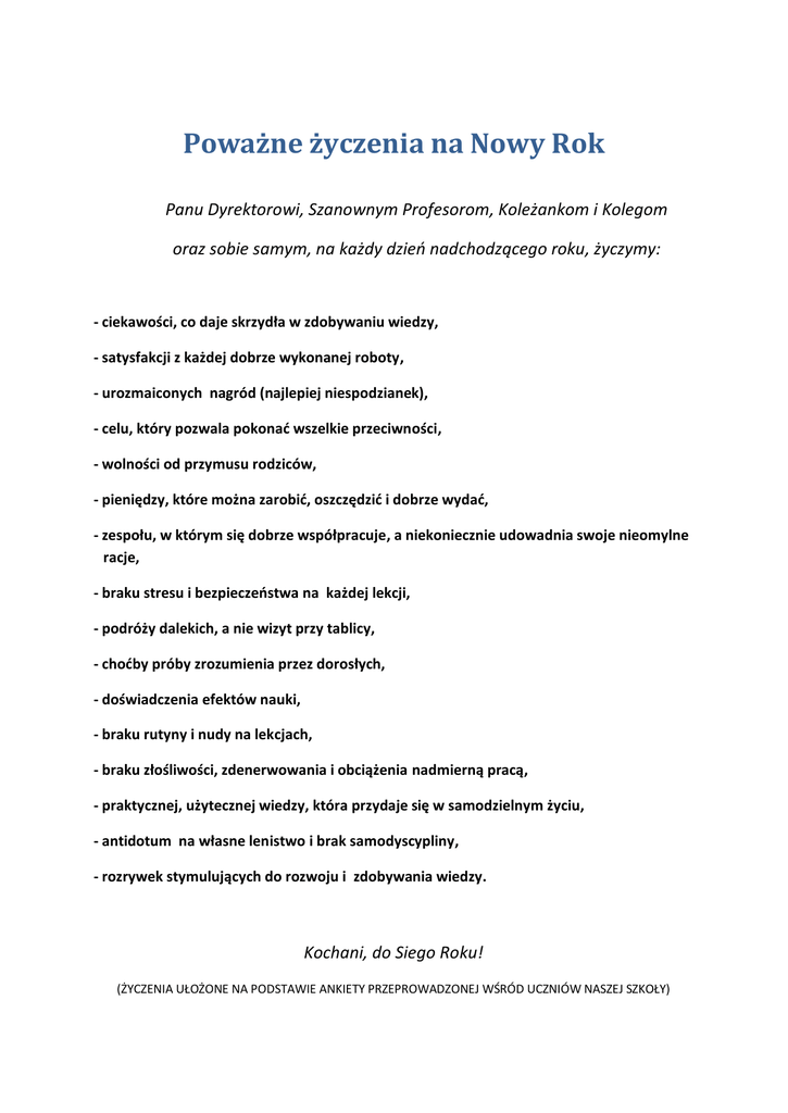 Poważne życzenia na Nowy Rok Panu Dyrektorowi, Szanownym Profesorom, Koleżankom i Kolegom oraz sobie samym, na każdy dzień nadchodzącego roku, życzymy: - ciekawości, co daje skrzydła w zdobywaniu wiedzy, - satysfakcji z każdej dobrze wykonanej roboty, - urozmaiconych nagród (najlepiej niespodzianek), - celu, który pozwala pokonać wszelkie przeciwności, - wolności od przymusu rodziców, - pieniędzy, które można zarobić, oszczędzić i dobrze wydać, - zespołu, w którym się dobrze współpracuje, a niekoniecznie udowadnia swoje nieomylne racje, - braku stresu i bezpieczeństwa na każdej lekcji, - podróży dalekich, a nie wizyt przy tablicy, - choćby próby zrozumienia przez dorosłych, - doświadczenia efektów nauki, - braku rutyny i nudy na lekcjach, - braku złośliwości, zdenerwowania i obciążenia nadmierną pracą, - praktycznej, użytecznej wiedzy, która przydaje się w samodzielnym życiu, - antidotum na własne lenistwo i brak samodyscypliny, - rozrywek stymulujących do rozwoju i zdobywania wiedzy. Kochani, do Siego Roku! (ŻYCZENIA UŁOŻONE NA PODSTAWIE ANKIETY PRZEPROWADZONEJ WŚRÓD UCZNIÓW NASZEJ SZKOŁY)