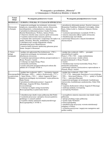 Wymagania z przedmiotu „Historia” w Gimnazjum w Dziadowej Kłodzie w klasie III Temat lekcji Wymagania podstawowe Uczeń: Wymagania ponadpodstawowe Uczeń: ROZDZIAŁ 1: EUROPA I POLSKA W CZASACH OŚWIECENIA 1. Oświecenie w Europie • poprawnie posługuje się terminami: oświecenie, empiryzm, racjonalizm, deizm, ateizm, klasycyzm, encyklopedyści, wolnomularstwo, masoneria • przedstawia dokonania postaci: Izaaka Newtona, Karola Monteskiusza, Woltera, Jamesa Watta • właściwie określa ramy czasowe epoki oświecenia • wyjaśnia zastosowanie maszyny parowej • wymienia idee oświecenia i rozpoznaje ich wpływ na naukę, literaturę, filozofię, architekturę i sztukę • charakteryzuje zasadę trójpodziału władzy sformułowaną przez Monteskiusza • omawia hasła równości społecznej głoszone przez Jeana–Jacques’a Rousseau • przedstawia dokonania postaci: Karola Linneusza, Benjamina Franklina, Edmunda Cartwrighta, Johna Kaya, Johna Locke’a, Andersa Celsjusza, Denisa Diderota • wymienia najważniejsze wynalazki XVIII w. • omawia znaczenie odkryć epoki oświecenia • charakteryzuje styl rokoko • porównuje klasycyzm z innymi kierunkami artystycznymi 2. Nowe potęgi europejski e • podaje rok ogłoszenia Prus królestwem –1701 r. • poprawnie posługuje się terminami: junkrzy, absolutyzm oświecony • wymienia najważniejsze reformy przeprowadzone w Rosji, Prusach i Austrii • wskazuje na mapie Rosję, Prusy i monarchię austriacką • ocenia znaczenie przeprowadzonych reform dla układu sił w Europie XVIII w. • podaje lata wydarzeń: 1689 r. – początek samodzielnych rządów Piotra I, 1756–1763 – wojna siedmioletnia • omawia przyczyny i skutki reform przeprowadzonych w Rosji, Prusach i Austrii • charakteryzuje rozwój terytorialny Rosji, Prus i monarchii austriackiej • porównuje reformy oświeceniowe wprowadzone w Prusach, Rosji i Austrii 3. • podaje lata wydarzeń: 1697 r. – koronacja Augusta Rzeczpospolita II Mocnego, 1699 r. – pokój w Karłowicach, 1717 r. za panowania – Sejm Niemy, 1763 r. – śmierć Augusta III Sasa • Wettinów poprawnie posługuje się terminami: wojna północna, Sejm Niemy • przedstawia dokonania postaci: Augusta II Mocnego, Augusta III Sasa, Stanisława Leszczyńskiego • wskazuje na mapie zasięg terytorialny Rzeczypospolitej za panowania Sasów • charakteryzuje skutki wojny północnej dla Polski • wymienia przyczyny i przejawy kryzysu państwa polskiego w czasach saskich • wyjaśnia zmiany położenia międzynarodowego Rzeczypospolitej w XVIII w. • podaje lata wydarzeń: 1704–1709 i 1733–1736 – panowanie Stanisława Leszczyńskiego, 1709 r. – bitwa pod Połtawą, 1721 r. – pokój w Nystad, 1736 r. – sejm pacyfikacyjny • poprawnie posługuje się terminami: konfederacja warszawska, konfederacja sandomierska, Order Orła Białego • wyjaśnia okoliczności elekcji Augusta II Mocnego • analizuje politykę wewnętrzną i zewnętrzną Wettinów • szczegółowo omawia znaczenie oraz skutki wojny północnej • opisuje przebieg wojny północnej • ocenia rządy Wettinów w Rzeczypospolitej • charakteryzuje przyczyny wzrostu nietolerancji religijnej w Polsce • wymienia pozytywne i negatywne następstwa unii polsko-saskiej 4. Ostatni król elekcyjny • podaje lata wydarzeń: 1764 r. – koronacja Stanisława Augusta Poniatowskiego, 1772 r. – pierwszy rozbiór Polski • poprawnie posługuje się terminami: Familia, konfederacja barska, sejm rozbiorowy, Rada Nieustająca • przedstawia rolę postaci: Tadeusza Rejtana, Mikołaja Repnina • omawia okoliczności elekcji Stanisława Augusta Poniatowskiego • wskazuje na mapie zmiany terytorialne po pierwszym rozbiorze Polski • wymienia przyczyny i skutki pierwszego rozbioru Tajemnice sprzed wieków – Co przedstawia „Kołacz królewski”? Wymagania ponadprogramowe Uczeń: • charakteryzuje stanowisko państw europejskich wobec pierwszego rozbioru Polski • wyjaśnia, dlaczego I rozbiór Polski naruszył równowagę sił w Europie • tłumaczy genezę porównania pierwszego rozbioru Polski do królewskiego ciasta • opisuje rycinę Noela Le Mire’a „Kołacz królewski” i Johannesa Nilsona „Położenie Królestwa Polskiego w roku 1773” • określa cel powstawania kolejnych, naśladowczych wersji „Kołacza królewskiego" • wyjaśnia propagandową rolę rycin oraz działania państw zaborczych, mające na celu zafałszowanie prawdy historycznej 5. Oświecenie • podaje lata wydarzeń: 1765 r. – utworzenie Szkoły w Rycerskiej, 1773 r. – powołanie Komisji Edukacji Rzeczypospolit Narodowej • poprawnie posługuje się terminami: ej Collegium Nobilium, Szkoła Rycerska, Komisja Edukacji Narodowej, Towarzystwo do Ksiąg Elementarnych, oświecenie stanisławowskie • przedstawia dokonania postaci: Stanisława Konarskiego, Stanisława Leszczyńskiego, Ignacego Krasickiego, Stanisława Staszica, Hugona Kołłątaja, Bernarda Bellotta zwanego Canalettem, Dominika Merliniego • charakteryzuje projekty reform ustrojowych Stanisława Konarskiego i Stanisława Leszczyńskiego • dostrzega przejawy ożywienia w gospodarce i kulturze czasów saskich • wymienia okoliczności powstania, główne zadania i osiągnięcia Komisji Edukacji Narodowej • rozpoznaje charakterystyczne cechy polskiego oświecenia • ocenia wkład Stanisława Augusta Poniatowskiego w rozwój polskiego oświecenia • podaje rok zawiązania konfederacji barskiej –1768 r. • poprawnie posługuje się terminami: konfederacja słucka, konfederacja toruńska, konfederacja radomska, prawa kardynalne, ryngraf, innowierca • przedstawia rolę postaci: Maurycego Beniowskiego, Kajetana Sołtyka, Józefa Andrzeja Załuskiego, Wacława Rzewuskiego, Józefa Pułaskiego, Michała Krasińskiego • omawia reformy sejmu konwokacyjnego • podaje lata wydarzeń: 1740 r. – utworzenie Collegium Nobilium, 1747 r. – otwarcie Biblio