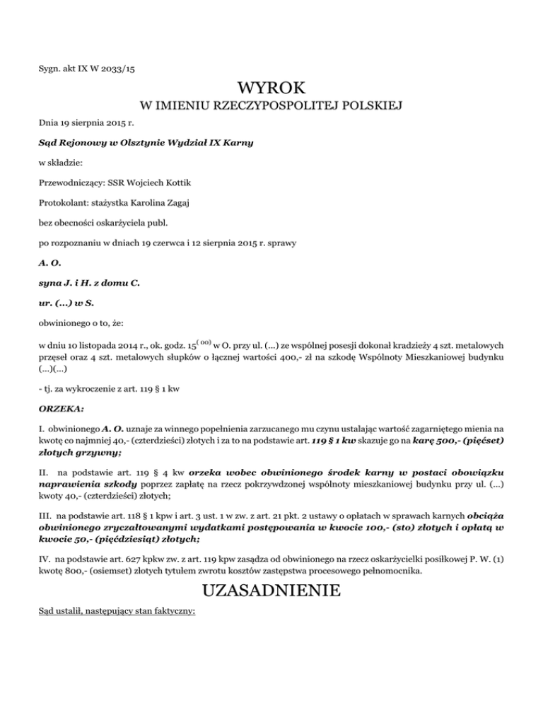 Sygn. akt IX W 2033/15 WYROK W IMIENIU RZECZYPOSPOLITEJ POLSKIEJ Dnia 19 sierpnia 2015 r. Sąd Rejonowy w Olsztynie Wydział IX Karny w składzie: Przewodniczący: SSR Wojciech Kottik Protokolant: stażystka Karolina Zagaj bez obecności oskarżyciela publ. po rozpoznaniu w dniach 19 czerwca i 12 sierpnia 2015 r. sprawy A. O. syna J. i H. z domu C. ur. (...) w S. obwinionego o to, że: w dniu 10 listopada 2014 r., ok. godz. 15( 00) w O. przy ul. (...) ze wspólnej posesji dokonał kradzieży 4 szt. metalowych przęseł oraz 4 szt. metalowych słupków o łącznej wartości 400,- zł na szkodę Wspólnoty Mieszkaniowej budynku (...)(...) - tj. za wykroczenie z art. 119 § 1 kw ORZEKA: I. obwinionego A. O. uznaje za winnego popełnienia zarzucanego mu czynu ustalając wartość zagarniętego mienia na kwotę co najmniej 40,- (czterdzieści) złotych i za to na podstawie art. 119 § 1 kw skazuje go na karę 500,- (pięćset) złotych grzywny; II. na podstawie art. 119 § 4 kw orzeka wobec obwinionego środek karny w postaci obowiązku naprawienia szkody poprzez zapłatę na rzecz pokrzywdzonej wspólnoty mieszkaniowej budynku przy ul. (...) kwoty 40,- (czterdzieści) złotych; III. na podstawie art. 118 § 1 kpw i art. 3 ust. 1 w zw. z art. 21 pkt. 2 ustawy o opłatach w sprawach karnych obciąża obwinionego zryczałtowanymi wydatkami postępowania w kwocie 100,- (sto) złotych i opłatą w kwocie 50,- (pięćdziesiąt) złotych; IV. na podstawie art. 627 kpkw zw. z art. 119 kpw zasądza od obwinionego na rzecz oskarżycielki posiłkowej P. W. (1) kwotę 800,- (osiemset) złotych tytułem zwrotu kosztów zastępstwa procesowego pełnomocnika. UZASADNIENIE Sąd ustalił, następujący stan faktyczny: Obwiniony A. O. mieszka w O.. Pracuje w (...) jako (...) (...). Osiąga miesięczny dochód około(...) złotych. Jest żonaty, na utrzymaniu posiada dwójkę nastoletnich dzieci. W przeszłości nie był karany za wykroczenia. Obwiniony wraz z rodziną zajmuje mieszkanie na parterze kamienicy przy ul. (...) w O.. W budynku znajdują się jeszcze dwa inne mieszkania. Lokale na piętrze zajmują P. W. (1) wraz z mężem oraz państwo K.. Do budynku przynależy ogród o powierzchni około 8 arów. Mieszkańcy tworzą wspólnotę mieszkaniową, przy czym właścicielem mieszkania zajmowanego przez rodzinę K. jest Gmina O.. Wszyscy mieszkańcy są współwłaścicielami ogrodu przylegającego do posesji. Jedynie ustnie ustalono podział posesji pomiędzy współwłaścielami. Formalnie nie wydzielono udziałów w gruncie. W ogrodzie na części wspólnej ustawione było ogrodzenie z siatki w metalowych przęsłach oraz słupków metalowych użytkowane przez K. K. (2) i jej rodzinę. Ogrodzenie to zostało ustawione jeszcze przed wprowadzeniem się K. K. około 23 lata temu. Ogrodzenie użytkowała K. K. wieszając na nim m. in. swoje rzeczy. Dbała także o to ogrodzenie, częściowo w miarę możliwości odnawiała je i malowała. Pomiędzy mieszkańcami kamienicy istnieje poważny, zadawniony konflikt dotyczący nieporozumień związanych z użytkowaniem części wspólnych nieruchomości. Efektem tego były także sprawy prowadzone przed tutejszym Wydziałem. W lutym 2014 r. obwiniony na rocznym zebraniu wspólnoty złożył wniosek o rozbiórkę płotu ustawionego na posesji, który w jego ocenie ograniczał mu dostęp do części wspólnej nieruchomości. Pozostali członkowie wspólnoty państwo W. oraz państwo K. nie wyrazili zgody na rozbiórkę płotu. Obwiniony kierował pisma do zarządcy nieruchomości oraz właściciela lokalu zajmowanego przez K. K. czyli Gminy O. domagając się rozebrania płotu. Otrzymał informację, iż decyzję o rozbiórce płotu mogą podjąć jedynie członkowie Wspólnoty jako że stanowi on jej współwłasność. Z uwagi na brak porozumienia z pozostałymi mieszkańcami obwiniony w dniu 10 listopada 2014 r. około godz. 15:00 zdemontował cztery przęsła metalowe płotu wraz ze słupkami. Po czym zwiózł je na skup złomu, gdzie otrzymał za nie kwotę około 40 złotych. Pieniędzy otrzymanych ze sprzedaży płotu nie przekazał na rzecz Wspólnoty, rozdysponował je według własnego uznania. (dowód: dokumentacja zdjęciowa k. 6-7, k. 40, notatka urzędowa k. 10, pismo obwinionego k. 12, k. 15, k. 44, k. 46, pismo Prezydenta O. k. 13, k. 45, k. 47, mapa k. 14, k. 41, pismo (...) w O. k. 16, k. 17, k. 42, pismo K. K. k. 43, k. 48, wyjaśnienia obwinionego k. 49-49v., zeznania P. J. k. 49v., zeznania P. W. k. 50, zeznania K. K. k. 56-56v.) A. O. został obwiniony o popełnienie wykroczenia z art. 119 § 1 kw. W toku przeprowadzonego postępowania obwiniony wprawdzie przyznał się do rozebrania płotu na posesji przy ul. (...) jednocześnie kategorycznie zaprzeczył aby swoim działaniem wyczerpał znamiona wykroczenia z art. 119 § 1 kw. Wyjaśnił, że płot ustawiony był na części wspólnej nieruchomości i w znacznym stopniu ograniczał mu odstęp do części wspólnej. Ponadto płot był w złym stanie technicznym, nadawał się jedynie na złom. Obwiniony zaznaczył, że usunął jedynie 33,5 % płotu, czyli należącą do niego część wynikającą z udziałów we współwłasności. Pozostałą część płotu pozostawił nienaruszoną. Obwiniony podkreślił, że już wcześniej składał wnioski o demontaż tego ogrodzenia. W jego ocenie jeśli nikt z obecnych mieszkańców nie budował przedmiotowego ogrodzenia to nie jest jego właścicielem i nigdy nim nie był. Sąd zważył, co następuje: Wyjaśnienia obwinionego zasługują na podzielenie jedynie w części, w której przyznał się on do demontażu płotu i sprzedaży jego elementów bowiem korespondują one z pozostałym materiałem dowodowym zgromadzonym w niniejszej sprawie. W ocenie Sądu nie sposób jednak podzielić przedstawionej przez obwinionego interpretacji obowiązujących przepisów dotyczących współwłasności. Wyjaśnienia obwinionego dotyczące tych kwestii są