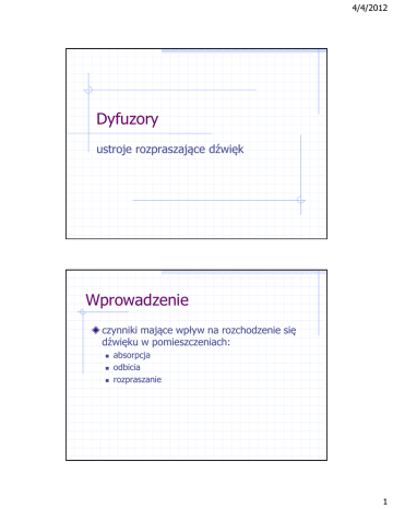 4/4/2012 Dyfuzory ustroje rozpraszające dźwięk Wprowadzenie czynniki mające wpływ na rozchodzenie się dźwięku w pomieszczeniach: absorpcja odbicia rozpraszanie 1 4/4/2012 Historia dawniej wykorzystywane rzeźby i ornamenty zbyt selektywna odp. częstotliwościowa wysokie koszty w wielu XX-wiecznych pomieszczeniach wykorzystano jedynie duże płaskie powierzchnie mające na celu odpowiednie skierowanie dźwięku, przy minimalnym rozproszeniu dźwięku w latach 70-tych XX. wieku Schroeder publikuje założenia metody pozwalającej na projektowanie dyfuzorów quadric residue (QRD) primitive root Wprowadzenie idealny dyfuzor płaska charakterystyka w funkcji częstotliwości nie podbarwia dźwięku nie tworzy się filtr grzebieniowy niezmienna charakterystyka w funkcji kąta odbicia 0º -90º 90º dyspersja czasowa 2 4/4/2012 Rozpraszanie zasada Huygensa punkty o tej samej fazie Rozpraszanie zmiany (przesunięcie) fazy fali odbitej wykorzystanie absorbera – zmiany amplitudy fal 3 4/4/2012 Rodzaje dyfuzorów dyfuzor płaszczyznowy (1D) powierzchnia o typowo anizotropowych właściwościach zmiany fazy lub amplitudy zachodzą tylko w jednym kierunku fala wynikowa ma kształt półwalca dyfuzor sferyczny (2D) powierzchnia o właściwościach izotropowych rozpraszają dźwięk wszechkierunkowo energia fali w danym kierunku jest dwukrotnie mniejsza niż w przypadku zastosowania dyfuzora 1D Zastosowania eliminacja echa od ściany tylnej zwiększenie odbić polepszenie słyszalności między muzykami realizacja pomieszczeń LEDE poprawa zrozumiałości mowy (głównie w obiektach sakralnych) poprawa obrazu dźwiękowego w przypadku systemów odsłuchowych 5.1 4 4/4/2012 Dyfuzory (?) Przykład (negatywny) odbicie od półcylindra odpowiedź impulsowa odpowiedź częstotliwościowa 5 4/4/2012 Piramidka – czy to dyfuzor? Zalety dyfuzorów 6 4/4/2012 Zalety dyfuzorów pomieszczenie, w którym boczne ściany, podłoga i sufit zostały wytłumione (nie ma odbić -> RFZ Reflection Free Zone), tylna ściana z dyfuzorem Parametry zdolność rozpraszania jest opisywana przez współczynnik dyfuzyjności – związany z kierunkowością współczynnik rozproszenia – określa aspekt energetyczny 7 4/4/2012 Współczynnik dyfuzji kierunkowy współczynnik dyfuzji miara jednorodności dyfuzji powierzchni dla jednej pozycji źródła mieści się w przedziale (0,1) całkowita dyfuzja -> dθ=1 współczynnik dyfuzji dθ1,2...,n miara jednorodności dyfuzji powierzchni dla więcej niż jednej pozycji źródła współczynnik dyfuzji losowego padania miara jednorodności dyfuzji dla reprezentatywnego zbioru pozycji źródeł w półokręgu dla dyfuzora płaszczyznowego lub w półsferze dla dyfuzora sferycznego Współczynnik rozproszenia określa wielkość energii ulegającej rozproszeniu Mommertz i Vorlander zaproponowali definicję współczynnika rozproszenia jako stosunek wartości energii rozproszonej do wartości całkowitej energii odbitej zakładając, że padający promień ma energię równą E, energia rozproszona będzie wynosić (1-) E natomiast energia odbicia bezpośredniego (1-)(1-)E, gdzie współczynnik absorpcji zaś - współczynnik dyfuzyjności. Całkowita energia odbita (1-)E Espec [(1 ) (1 )(1 )]E 1 (1 ) E Etot gdzie: Espec – energia odbicia bezpośredniego, Etot – całkowita energia odbicia 8 4/4/2012 Metody wyznaczania wsp. rozproszenia metoda pola swobodnego pomiar odpowiedzi impulsowych dla danego kąta elewacji przy zmianach kąta azymutu o 5 stopni uśrednianie dla kilku wartości kąta elewacji stosując metodę okna prostokątnego można wyodrębnić fragmenty odpowiadające za dźwięk bezpośredni oraz odbicia Metody wyznaczania wsp. rozproszenia metoda wykorzystująca komorę bezechową mierzone są impulsowe odpowiedzi pomieszczenia źródło oraz odbiornik znajdują się w ustalonych pozycjach natomiast obracana jest badana powierzchnia. zakładając płaską powierzchnię oraz idealne warunki, kolejne zmierzone odpowiedzi impulsowe są ze sobą silnie skorelowane; badając natomiast silnie nierówne powierzchnie, można zauważyć, że ich korelacja jest coraz mniejsza. 9 4/4/2012 Metody projektowania teoria liczb fraktale teorie telokomunikacyjne (modulacja) TDS (time-delay spectometry) DSP (FFT, transformata Hadamarda) Dyfuzory MLS (Maximum Length Sequence) 4 dn φ – przesunięcie fazy (w radianach) dn – głębokość zagłębienia λ – długość fali założenie: współczynnik odbicia = 1 zagłębienie ma współczynnik odbicia oznaczony„-” płaską powierzchnia ma współczynnik odbicia oznaczony„+” główna wada: wąskopasmowe 10 4/4/2012 Dyfuzory QRD główny wzór: sn n 2 , modN sn – sekwencja głębokości n – kolejny numer zagłębienia (0, 1, 2, 3...) N – liczba pierwsza np. 5, mod(3) = 2 dla N= 17 -> 0, 1, 4, 9, 16, 8, 2, 15, 13, 13, 15, 2, 8, 16, 9, 4, 1, 0, 1, 4, 9, 16, 8, 2, 15... d n sn 0 2N w 0,1370 pasmo: pół oktawy poniżej częstotliwości projektowej do λ>2w Przykłady Dyfuzory QRD (Quadratic Residue) 11 4/4/2012 Przykłady Dyfuzor fraktalny – DIFFRACTAL Przykłady Więcej przykładów: http://www.silentsource.com/index.html 12 4/4/2012 Dyfuzory typu „optimized curved diffusors” Chcąc uzyskać z jednej strony dobre parametry akustyczne, a z drugiej odpowiednie walory estetyczne projektując powierzchnie o arbitralnym kształcie stosuje się również techniki optymalizacji oraz predykcji. Wiąże się to z wykorzystaniem powierzchni zakrzywionych oraz odpowiednim kształtowaniem sklepień sufitów. n py x( y ) s a p cos( ) d 2h p 1 gdzie: 2h – szerokość, x(y) – przemieszczenie w stosunku do płaszczyzny panelu, d - odchylenie, s – centrowanie Dyfuzory typu „optimized curved diffusors” • • • często wykorzystywane w salach koncertowych, spełniają bowiem wymagania estetyczne mogą służyć do niwelowania zjawiska ogniskowania się fal w przypadku wklęsłych sufitów inne zastosowanie: aku