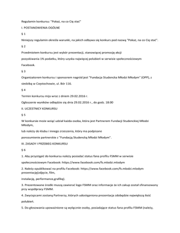 Regulamin konkursu: "Pokaż, na co Cię stać" I. POSTANOWIENIA OGÓLNE §1 Niniejszy regulamin określa warunki, na jakich odbywa się konkurs pod nazwą "Pokaż, na co Cię stać". §2 Przedmiotem konkursu jest wybór prezentacji, stanowiącej promocję akcji pozyskiwania 1% podatku, który uzyska najwięcej polubień w serwisie społecznościowym Facebook. §3 Organizatorem konkursu i sponsorem nagród jest "Fundacja Studencka Młodzi Młodym" (OPP), z siedzibą w Częstochowie, ul. Bór 116. §4 Termin konkursu mija wraz z dniem 29.02.2016 r. Ogłoszenie wyników odbędzie się dnia 29.02.2016 r., do godz. 18:00 II. UCZESTNICY KONKURSU §5 W konkursie może wziąć udział każda osoba, która jest Partnerem Fundacji Studenckiej Młodzi Młodym, lub należy do klubu i innego zrzeszenia, który ma podpisane porozumienie partnerskie z "Fundacją Studencką Młodzi Młodym". III. ZASADY I PRZEBIEG KONKURSU §6 1. Aby przystąpić do konkursu należy posiadać status fana profilu FSMM w serwisie społecznościowym Facebook: https://www.facebook.com/fs.mlodzi.mlodym 2. Należy opublikować na profilu Facebook: https://www.facebook.com/fs.mlodzi.mlodym prezentację(zdjęcie, film, instalację, performance,grafikę). 3. Prezentowane środki muszą zawierać logo FSMM oraz informacje że ich zakup został sfinansowany przy współpracy FSMM. 4. Zwycięzcami zostaną Partnerzy, których udostępniona prezentacja zdobędzie największą ilość polubień. 5. Do głosowania upoważnione są wyłącznie osoby, posiadające status fana profilu FSMM (należy, więc pamiętać o polubieniu strony sponsora: https://www.facebook.com/fs.mlodzi.mlodym) 6. Głosowanie odbywać będzie się do dnia 29 lutego 2016 roku, do godz. 16:00 7. Rozstrzygnięcie konkursu i ogłoszenie wyników zostanie opublikowane w formie posta na profilu FSMM na Facebooku w dniu 06.03, do godz 18:00 IV. NAGRODY §8 W konkursie przewidziano 3 nagrody w formie dofinansowania: - za pierwsze miejsce 700 zł - za drugie 500 zł - za trzecie 300 zł §8 Dofinansowanie zwycięzcy wykorzystać będą mogli na cele, mieszczące się w celach statutowych fundacji §9 Nagroda przekazana będzie w formie opłacenia przedmiotów lub usług, które zostaną określone przez zwycięzców V. POSTANOWIENIA KOŃCOWE § 10 Fundacja zezwala na publikację prezentacji promującego FSMM w serwisie społecznościowym Facebook. § 11 Organizator konkursu zobowiązuje się do przekazania nagród zwycięzcom w w/w wysokości, w formie opłacenia produktów lub usług, mieszczących się w celach statutowych Fundacji W razie pytań prosimy o kontakt: [email protected] tel. 796 094 565