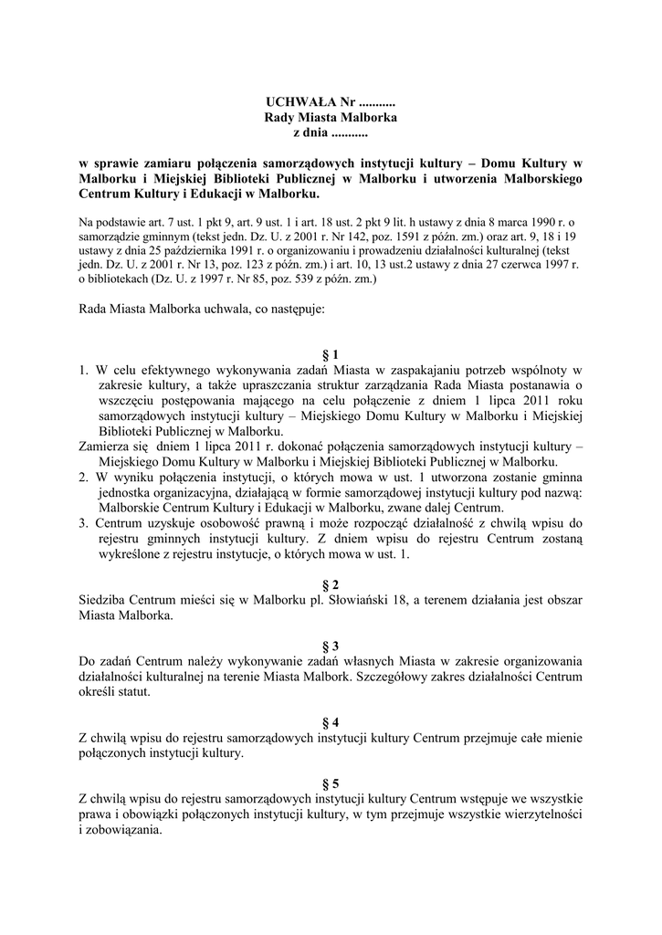 UCHWAŁA Nr ........... Rady Miasta Malborka z dnia ........... w sprawie zamiaru połączenia samorządowych instytucji kultury – Domu Kultury w Malborku i Miejskiej Biblioteki Publicznej w Malborku i utworzenia Malborskiego Centrum Kultury i Edukacji w Malborku. Na podstawie art. 7 ust. 1 pkt 9, art. 9 ust. 1 i art. 18 ust. 2 pkt 9 lit. h ustawy z dnia 8 marca 1990 r. o samorządzie gminnym (tekst jedn. Dz. U. z 2001 r. Nr 142, poz. 1591 z późn. zm.) oraz art. 9, 18 i 19 ustawy z dnia 25 października 1991 r. o organizowaniu i prowadzeniu działalności kulturalnej (tekst jedn. Dz. U. z 2001 r. Nr 13, poz. 123 z późn. zm.) i art. 10, 13 ust.2 ustawy z dnia 27 czerwca 1997 r. o bibliotekach (Dz. U. z 1997 r. Nr 85, poz. 539 z późn. zm.) Rada Miasta Malborka uchwala, co następuje: §1 1. W celu efektywnego wykonywania zadań Miasta w zaspakajaniu potrzeb wspólnoty w zakresie kultury, a także upraszczania struktur zarządzania Rada Miasta postanawia o wszczęciu postępowania mającego na celu połączenie z dniem 1 lipca 2011 roku samorządowych instytucji kultury – Miejskiego Domu Kultury w Malborku i Miejskiej Biblioteki Publicznej w Malborku. Zamierza się dniem 1 lipca 2011 r. dokonać połączenia samorządowych instytucji kultury – Miejskiego Domu Kultury w Malborku i Miejskiej Biblioteki Publicznej w Malborku. 2. W wyniku połączenia instytucji, o których mowa w ust. 1 utworzona zostanie gminna jednostka organizacyjna, działającą w formie samorządowej instytucji kultury pod nazwą: Malborskie Centrum Kultury i Edukacji w Malborku, zwane dalej Centrum. 3. Centrum uzyskuje osobowość prawną i może rozpocząć działalność z chwilą wpisu do rejestru gminnych instytucji kultury. Z dniem wpisu do rejestru Centrum zostaną wykreślone z rejestru instytucje, o których mowa w ust. 1. §2 Siedziba Centrum mieści się w Malborku pl. Słowiański 18, a terenem działania jest obszar Miasta Malborka. §3 Do zadań Centrum należy wykonywanie zadań własnych Miasta w zakresie organizowania działalności kulturalnej na terenie Miasta Malbork. Szczegółowy zakres działalności Centrum określi statut. §4 Z chwilą wpisu do rejestru samorządowych instytucji kultury Centrum przejmuje całe mienie połączonych instytucji kultury. §5 Z chwilą wpisu do rejestru samorządowych instytucji kultury Centrum wstępuje we wszystkie prawa i obowiązki połączonych instytucji kultury, w tym przejmuje wszystkie wierzytelności i zobowiązania. §6 Pracownicy połączonych instytucji kultury staną się z dniem 1 lipca 2011 roku pracownikami Centrum, a Centrum przejmuje wszystkie prawa i obowiązki wynikające ze stosunków pracy. §7 Działalność Centrum będzie finansowana z dotacji udzielanej corocznie z budżetu Miasta. Ponadto Centrum może uzyskiwać środki finansowe i składniki majątkowe z: wpływów z własnej działalności, dotacji z budżetu państwa, wpływów z najmu i dzierżawy składników majątku, spadków, zapisów i darowizn od osób fizycznych i prawnych oraz innych źródeł. §8 Zamiar połączenia instytucji kultury w jedną jednostkę organizacyjną zostaje podany do publicznej wiadomości. §9 Wykonanie uchwały powierza się Burmistrzowi Miasta Malborka. § 10 Uchwała wchodzi w życie z dniem podjęcia. Przewodniczący Rady Miasta Malborka Arkadiusz Mroczkowski Uzasadnienie: Zamiar utworzenie Malborskiego Centrum Kultury i Edukacji na bazie Miejskiego Domu Kultury i Miejskiej Biblioteki Publicznej wiąże się z poszerzeniem zadań, jakie w zakresie kultury będą miały miejsce po odbudowie tz. Szkoły Łacińskiej w Malborku. Odbudowany obiekt pomieści wiele nowych funkcji edukacyjno kulturalnych. W obiekcie tym znajdzie się również medioteka, która przede wszystkim udostępniać będzie zbiory działu młodzieżowego miejskiej biblioteki. Zaprojektowana sala konferencyjno - widowiskowa umożliwi organizację różnych imprez, spotkań w tym z pisarzami, poetami. Wiele działań tak Domu Kultury jak i Biblioteki opartych jest na współpracy ze szkołami i przedszkolami. Centrum dysponujące lepszymi zasobami materialnymi i organizacyjnymi powinno, wykorzystując dotychczasowe doświadczenia, uatrakcyjnić i zintensyfikować tę współpracę. Docelowo przewiduje się włączyć do działalności Centrum zadania realizowane przez Młodzieżowy Dom Kultury w Malborku. Wynikająca z tego komasacja sił i środków powinna wpłynąć na efektywniejsze działanie oraz wyższy poziom usług, zajęć pozaszkolnych dla dzieci i młodzieży i imprez kulturalnych. Jedną z przesłanek utworzenia Centrum jest racjonalizacja wydatków ponoszonych przez Miasto na kulturę. Połączenie jednostek kultury a w przyszłości przejęcie zadań Młodzieżowego Domu Kultury spowoduje zmniejszenia kosztów administracyjnych. Nastąpi skomasowanie służby finansowo – księgowej, obsługi sprzętu, urządzeń itp.