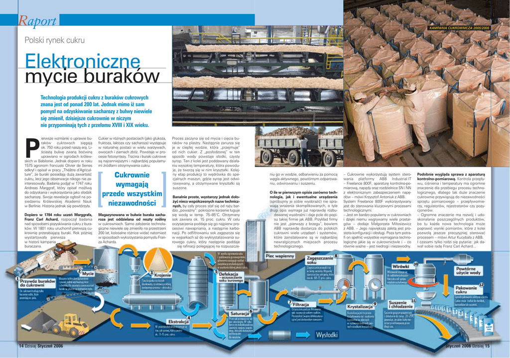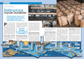 Raport KAMPANIA CUKROWNICZA 2005/2006 Polski rynek cukru Elektroniczne mycie buraków Technologia produkcji cukru z buraków cukrowych znana jest od ponad 200 lat. Jednak mimo i˝ sam pomys∏ na odzyskiwanie sacharozy z bulwy niewiele si´ zmieni∏, dzisiejsze cukrownie w niczym nie przypominajà tych z prze∏omu XVIII i XIX wieku. ierwsze wzmianki o uprawie buraków cukrowych si´gajà ok. 750 roku przed naszà erà. LiÊciastà bulw´ zwanà boçwinà uprawiano w ogrodach królewskich w Babilonie. Jednak dopiero w roku 1575 agronom francuski Olivier de Serres odkry∏ i opisa∏ w pracy „Théâtre d’Agriculture”, ˝e buraki posiadajà du˝à zawartoÊç cukru, lecz jego obserwacje nikogo nie zainteresowa∏y. Badania podjà∏ w 1747 roku Andreas Marggraf, który opisa∏ mo˝liwà do odzyskania i wykorzystania jako s∏odzik sacharoz´. Swoje rewelacje og∏osi∏ na posiedzeniu Królewskiej Akademii Nauk w Berlinie. Historia jednak si´ powtórzy∏a. Cukier w ró˝nych postaciach (jako glukoza, fruktoza, laktoza czy sacharoza) wyst´puje w naturalnej postaci w wielu warzywach, owocach i ziarnach zbó˝. Powstaje w procesie fotosyntezy. Trzcina i buraki cukrowe sà najcenniejszymi i najbardziej popularnymi êród∏ami otrzymywania cukru. Dopiero w 1784 roku uczeń Marggrafa, Franz Carl Achard, rozpoczà∏ badania nad sposobami pozyskiwania cukru z buraków. W 1801 roku uruchomi∏ pierwszà cukrowni´ przerabiajàcà buraki. Rok póêniej wystartowa∏a pierwsza w historii kampania buraczana. Magazynowana w bulwie buraka sacharoza jest oddzielana od reszty rośliny w cukrowniach. Samo za∏o˝enie technologiczne niewiele si´ zmieni∏o na przestrzeni 200 lat, kolosalne ró˝nice widaç natomiast w sposobach wykorzystania pomys∏u Franza Acharda. P Cukrownie wymagajà przede wszystkim niezawodnoÊci Proces zaczyna si´ od mycia i ci´cia buraków na plastry. Nast´pnie zanurza si´ je w ciep∏ej wodzie, która „przejmuje” od nich cukier. Z „pos∏odzonej” w ten sposób wody powstaje s∏odki, czysty syrop. Ten z kolei jest poddawany dzia∏aniu wysokiej temperatury, która powoduje, ˝e tworzà si´ w nim kryszta∏ki. Kolejny etap produkcji to w´drówka do specjalnych maszyn, gdzie syrop jest odwirowywany, a otrzymywane kryszta∏ki sà suszone. Banalnie proste, wystarczy jednak dołożyć nieco współczesnych nazw technicznych, by ca∏y proces sta∏ si´ od razu bardzo „powa˝ny”: pokrojone korzenie ∏uguje si´ wodà w temp. 75–85°C. Otrzymany sok zawiera ok. 15 proc. cukru. W celu oczyszczenia poddaje si´ go najpierw procesowi nawapniania, a nast´pnie karbonacji. Po odfiltrowaniu sok zag´szcza si´ w wyparkach a˝ do wykrystalizowania surowego cukru, który nast´pnie poddaje si´ rafinacji polegajàcej na rozpuszcze- niu go w wodzie, odbarwieniu za pomocà w´gla aktywnego, powtórnym odparowaniu, odwirowaniu i suszeniu. O ile w pierwszym opisie zarówno technologia, jak i ewentualne urządzenia (spróbujmy je sobie wyobraziç) nie sprawiajà wra˝enia skomplikowanych, o tyle drugi opis wymaga ju˝ naprawd´ rozbudowanej wyobraêni i daje pole do popisu takiej firmie jak ABB. Przyk∏ad firmy nie jest „pierwszy z brzegu”, bowiem ABB naprawd´ dostarcza do polskich cukrowni wiele urzàdzeƒ i systemów, które zainstalowane sà w najbardziej newralgicznych miejscach procesu technologicznego. – Cukrownie wykorzystujà system sterowania platformy ABB Industrial IT – Freelance 800F, aparatur´ kontrolno-pomiarowà, nap´dy oraz rozdzielnice SN i NN z elektronicznym zabezpieczeniem nap´dów – mówi Krzysztof Antoniuk z ABB. System Freelance 800F wykorzystywany jest do sterowania kluczowymi procesami technologicznymi. – Jest on bardzo popularny w cukrowniach i dzi´ki niemu wygrywamy wiele przetargów – dodaje Ma∏gorzata Mi∏osiewicz z ABB. – Jego najwi´kszà zaletà jest prostota konfiguracji i obs∏ugi. Poza tym potrafi on spe∏niç wszystkie wymagania technologiczne jakie sà w cukrownictwie i – co równie wa˝ne – jest niedrogi i niezawodny. Podobnie wygląda sprawa z aparaturą kontrolno-pomiarową. Kontrola przep∏ywu, ciÊnienia i temperatury ma ogromne znaczenie dla przebiegu procesu technologicznego, dlatego tak du˝e znaczenie cukrownie przywiàzujà do niezawodnoÊci sprz´tu pomiarowego – przep∏ywomierzy, regulatorów, rejestratorów czy pozycjonerów. – Ogromne znaczenie ma rozwój i udoskonalanie poszczególnych produktów, bo tu ka˝da nowa technologia mo˝e poprawiç wyniki pomiarów, które z kolei pozwolà jeszcze precyzyjniej sterowaç procesem – mówi Artur Kucyba∏a z ABB. I czasami tylko rodzi si´ pytanie: jak dawa∏ sobie rad´ Franz Carl Achard...