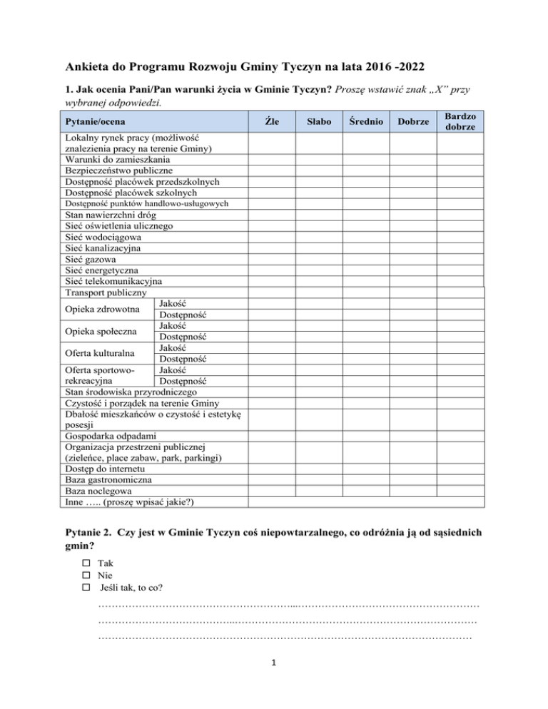 Ankieta do Programu Rozwoju Gminy Tyczyn na lata 2016 -2022 1. Jak ocenia Pani/Pan warunki życia w Gminie Tyczyn? Proszę wstawić znak „X” przy wybranej odpowiedzi. Pytanie/ocena Źle Słabo Średnio Dobrze Bardzo dobrze Lokalny rynek pracy (możliwość znalezienia pracy na terenie Gminy) Warunki do zamieszkania Bezpieczeństwo publiczne Dostępność placówek przedszkolnych Dostępność placówek szkolnych Dostępność punktów handlowo-usługowych Stan nawierzchni dróg Sieć oświetlenia ulicznego Sieć wodociągowa Sieć kanalizacyjna Sieć gazowa Sieć energetyczna Sieć telekomunikacyjna Transport publiczny Jakość Opieka zdrowotna Dostępność Jakość Opieka społeczna Dostępność Jakość Oferta kulturalna Dostępność Oferta sportowoJakość rekreacyjna Dostępność Stan środowiska przyrodniczego Czystość i porządek na terenie Gminy Dbałość mieszkańców o czystość i estetykę posesji Gospodarka odpadami Organizacja przestrzeni publicznej (zieleńce, place zabaw, park, parkingi) Dostęp do internetu Baza gastronomiczna Baza noclegowa Inne ….. (proszę wpisać jakie?) Pytanie 2. Czy jest w Gminie Tyczyn coś niepowtarzalnego, co odróżnia ją od sąsiednich gmin? Tak Nie Jeśli tak, to co? …………………………………………………...……………………………………………… …………………………………..……………………………………………………………… ………………………………………………………………………………………………… 1 Pytanie 3. Jak często spotyka się Pani/Pan z poniżej określonymi problemami społecznogospodarczymi na terenie Gminy Tyczyn? Proszę wstawić znak „X” przy wybranej odpowiedzi. Problem/częstość Nigdy Rzadko Przecięt -nie Często Bardzo często Bezrobocie Ubóstwo Przemoc Bezdomność Uzależnienia (alkoholizm, narkomania i in.) Przestępczość Trudności w dostępie do usług medycznych Niskie poczucie bezpieczeństwa publicznego Niezadowalająca oferta oświatowa Niezadowalająca oferta kulturalna Niezadowalająca oferta sportowa Niezadowalająca pomoc społeczna Niezadowalający stan infrastruktury drogowej Niewystarczająca infrastruktura wodociągowa Niewystarczająca infrastruktura kanalizacyjna Niewystarczająca infrastruktura gazowa Niewystarczająca baza wypoczynk.rekreacyjna Słaba integracja społeczności lokalnej Mała aktywność organizacji społecznych Emigracja młodych ludzi do większych miast Starzejące się społeczeństwo gminy Niska świadomość ekologiczna mieszkańców Trudności budżetowe Inne ….., jakie? Pytanie 4. Proszę wskazać trzy miejsca/obiekty, które Pani/Pana zdaniem są największą atrakcją gminy Tyczyn: 1. …………………………………………………………………………………………………………… 2. …………………………………………………………………………………………………………… 3. …………………………………………………………………………………………………………… Pytanie 5. Proszę wskazać trzy miejsca/obiekty, które Pani/Pana zdaniem są najmniej atrakcyjne w gminie Tyczyn (np. miejsca zaniedbane, niebezpieczne etc.): 1. …………………………………………………………………………………………………………… 2. …………………………………………………………………………………………………………… 3. …………………………………………………………………………………………………………… 2 6. Które z poniższych obszarów powinny stanowić priorytet dla Gminy Tyczyn w perspektywie lat 2016-2022, w skali od 1 – zbędna, do 5 - bardzo ważna. Proszę zaznaczyć znakiem „X” wybraną ocenę. Obszar/ocena Remonty i budowa dróg Oświetlenie uliczne Chodniki i ścieżki rowerowe Poprawa bezpieczeństwa publicznego Rozbudowa i modernizacja sieci wodociągowej Rozbudowa i modernizacja sieci kanalizacyjnej Aktywne wspieranie lokalnych przedsiębiorców Tworzenie warunków do rozwoju budownictwa socjalnego i komunalnego Rewitalizacja zabytkowego rynku w Tyczynie Kontynuacja budowy łącznika między gimnazjum i halą sportową w Tyczynie Budowa/modernizacja budynków użyteczności publicznej (sale gimnastyczne, domy ludowe itp.) Budowa/rozbudowa obiektów sportowo-rekreacyjnych Szersze wspieranie działań kulturalnych, artystycznych i promocja gminy Podniesienie jakości i dostępności edukacji Poprawa estetyki gminy i inwestycje w ochronę przyrody Inwestycje w odnawialne źródła energii Zwiększanie pomocy socjalnej dla najuboższych Zwiększenie standardu i jakości usług społecznych/zdrowotnych Wspieranie gospodarki społecznej i przedsięwzięć społecznych Rozwój e-usług publicznych w instytucjach gminnych Inne (wskazać jakie): 1 2 3 4 5 7. Proszę wymienić 5 priorytetowych inwestycji, które Pani/Pana zdaniem należy zrealizować na terenie gminy Tyczyn w latach 2016 - 2022: 1. .………………………………………………………………………………………………………… 2. .………………………………………………………………………………………………………… 3. .………………………………………………………………………………………………………… 4. .………………………………………………………………………………………………………… 5. .………………………………………………………………………………………………………… 3 Pytanie 8. Co w Pani/ Pana miejscowości (sołectwie) trzeba zrobić w pierwszej kolejności, w latach 2016 – 2022? Prosimy wskazać miejscowość (sołectwo) oraz wymienić maksymalnie 3 inwestycje. 1. ………………………………………