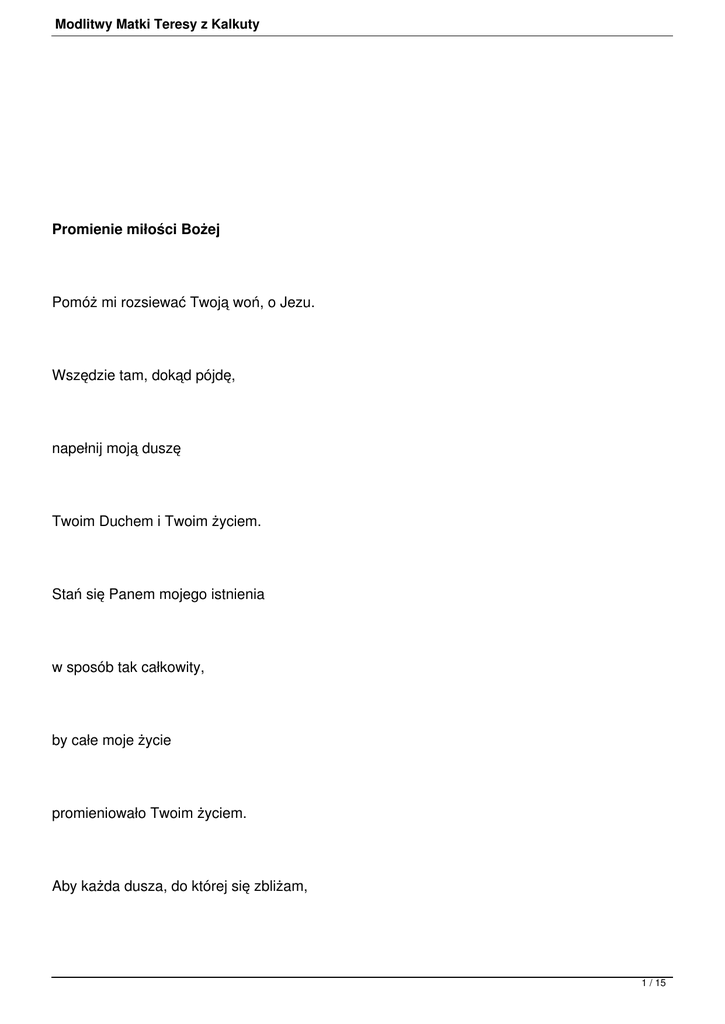 Modlitwy Matki Teresy z Kalkuty Promienie miłości Bożej Pomóż mi rozsiewać Twoją woń, o Jezu. Wszędzie tam, dokąd pójdę, napełnij moją duszę Twoim Duchem i Twoim życiem. Stań się Panem mojego istnienia w sposób tak całkowity, by całe moje życie promieniowało Twoim życiem. Aby każda dusza, do której się zbliżam, 1 / 15 Modlitwy Matki Teresy z Kalkuty mogła odczuwać Twoją obecność we mnie. Aby patrząc na mnie, nie widziała mnie, ale Ciebie we mnie. Pozostań we mnie. Dzięki temu będę jaśnieć Twoim blaskiem i będę mogła stać się światłem dla innych. Wyczuwałam bicie Twego serca Znalazłam Ciebie w wielu miejscach, Panie. Wyczuwałam bicie Twego serca w doskonałej ciszy pól, 2 / 15 Modlitwy Matki Teresy z Kalkuty w ciemnym tabernakulum Twojej pustej katedry, w jedności serc i umysłów wspólnoty osób, które Cię kochają. Znalazłam Ciebie w radości, w której Cię szukam i często znajduję. Ale zawsze znajduję Cię w cierpieniu. Cierpienie jest niczym uderzenie dzwonu, wzywającego oblubienicę Boga do modlitwy. Panie, znalazłam Cię w straszliwym ogromie cierpienia bliźnich. Widziałam Ciebie we wzniosłej akceptacji i w niewytłumaczalnej radości osób, 3 / 15 Modlitwy Matki Teresy z Kalkuty których życie nękane jest bólem. Ale nie udało mi się znaleźć Ciebie w moich małych bólach i w moich banalnych przykrościach. Pozwoliłam bezowocnie przemijać dramatowi Twojej męki odkupieńczej w moim utrudzeniu. A radosna witalność Twojego zmartwychwstania stłumiona jest szarzyzną mojego litowania się nad sobą. Panie, ja wierzę. Ale Ty wspomóż moją wiarę. 4 / 15 Modlitwy Matki Teresy z Kalkuty W chwili uczciwości Panie, gdy sądzę, że moje serce po brzegi wypełnione jest miłością, i gdy zauważam w chwili uczciwości, że kocham siebie w osobie kochanej, uwolnij mnie od samej siebie. Panie, gdy wydaje mi się, że dałam wszystko to, co mam do dania i gdy zauważam w chwili uczciwości, że to ja otrzymuję, uwolnij mnie od samej siebie. 5 / 15 Modlitwy Matki Teresy z Kalkuty Panie, gdy uwierzyłam, że jestem biedna, i gdy zauważam w chwili uczciwości, że bogata jestem w pychę i zazdrość, uwolnij mnie od samej siebie. Panie, gdy królestwa tego świata uznaję fałszywie za Królestwo niebieskie, spraw, bym znajdowała szczęście i pociechę 6 / 15 Modlitwy Matki Teresy z Kalkuty jedynie w Tobie. Naucz mnie miłości Panie, naucz mnie mówić, nie jak miedź brzęcząca albo cymbał brzmiący, ale z miłością. Spraw, bym potrafiła rozumieć, i obdarz mnie wiarą przenoszącą góry miłością. Naucz mnie tej miłości, która jest zawsze cierpliwa i zawsze uprzejma, 7 / 15 Modlitwy Matki Teresy z Kalkuty nigdy zazdrosna, zarozumiała, egoistyczna albo drażliwa; miłości, która znajduje radość w prawdzie, która zawsze jest gotowa do przebaczania, do wierzenia, do zaufania i do okazywania cierpliwości. W końcu, gdy wszystkie rzeczy przemijające rozpadną się i wszystko stanie się jasne, spraw, bym mogła być słabym, ale trwałym odbiciem Twojej doskonałej miłości. 8 / 15 Modlitwy Matki Teresy z Kalkuty Otwórz nasze oczy Panie, otwórz nasze oczy, abyśmy w naszych braciach i siostrach Ciebie rozpoznali. Panie, otwórz nasze uszy, abyśmy usłyszeli plącz i wołanie głodnych, zmarzniętych, przerażonych i zgnębionych. Panie, otwórz nasze serca, abyśmy potrafili kochać siebie 9 / 15 Modlitwy Matki Teresy z Kalkuty tak jak Ty nas kochasz. O Boże, daj nam, proszę, dar z wszystkich, jakie znamy, najcenniejszy: serce przepełnione miłością do Chrystusa. Amen. Chcesz moich rąk? Panie, czy chcesz moich rąk, by spędzić ten dzień pomagając biednym i chorym, którzy ich potrzebują? 10 / 15 Modlitwy Matki Teresy z Kalkuty Panie, daję Ci dzisiaj moje ręce. Panie, czy potrzebujesz moich nóg, aby spędzić ten dzień odwiedzając tych, którzy potrzebują przyjaciela? Panie, dzisiaj oddaję Ci moje nogi. Panie, czy chcesz mego głosu, aby spędzić ten dzień na rozmowie z tymi, którzy potrzebują słów miłości? Panie, dzisiaj daję Ci mój głos. 11 / 15 Modlitwy Matki Teresy z Kalkuty Panie, czy potrzebujesz mojego serca, aby spędzić ten dzień kochając każdego człowieka tylko dlatego, że jest człowiekiem? Panie, dzisiaj daję Ci moje serce. Poślij mi kogoś spragnionego miłości Panie, gdy jestem głodna, przyślij mi kogoś, kto potrzebuje pożywienia; gdy chce mi się pić, przyślij mi kogoś spragnionego; gdy jest mi zimno, przyślij mi kogoś do ogrzania; 12 / 15 Modlitwy Matki Teresy z Kalkuty gdy odczuwam przykrości, ofiaruj mi kogoś do pocieszania; gdy mój krzyż staje się ciężki, pozwól mi dzielić krzyż innej osoby; gdy jestem biedna, skieruj mnie do kogoś, kto jest w potrzebie; gdy nie mam czasu, daj mi kogoś, kogo mogłabym wesprzeć przez chwilę; gdy jestem upokorzona, spraw, bym miała kogoś, kogo mogłabym pochwalić; gdy jestem zniechęcona, przyślij mi kogoś, komu mogłabym dodać otuchy; 13 / 15 Modlitwy Matki Teresy z Kalkuty gdy potrzebuję zrozumienia u innych, daj mi kogoś, kto czeka na moją wyrozumiałość; gdy potrzebuję, by ktoś zajął się mną, przyślij mi kogoś, kim ja mogłabym się zająć; gdy myślę tylko o sobie samej, zwróć moją uwagę na kogoś innego. Uczyń nas, Panie, godnymi służenia naszym braciom, którzy na całym świecie żyją i umierają biedni i wygłodniali. Daj im dzisiaj, posługując się naszymi rękoma, ich chleb powszedni. 14 / 15 Modlitwy Matki Teresy z Kalkuty Daj im za pośrednictwem naszej wyrozumiałej miłości pokój i radość. 15 / 15