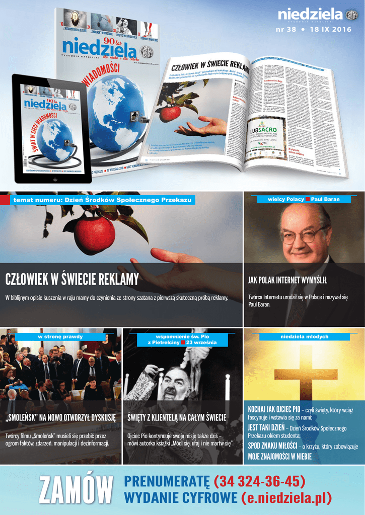 niedziela T Y G O D nr 38 temat numeru: Dzień Środków Społecznego Przekazu CZŁOWIEK W ŚWIECIE REKLAMY wspomnienie św. Pio z Pietrelciny 23 września „SMOLEŃSK” NA NOWO OTWORZYŁ DYSKUSJĘ ŚWIĘTY Z KLIENTELĄ NA CAŁYM ŚWIECIE Twórcy filmu „Smoleńsk” musieli się przebić przez ogrom faktów, zdarzeń, manipulacji i dezinformacji. Ojciec Pio kontynuuje swoją misję także dziś – mówi autorka książki „Módl się, ufaj i nie martw się”. ZAMÓW I wielcy Polacy K K A T O L I C K I 18 IX 2016 Paul Baran JAK POLAK INTERNET WYMYŚLIŁ W biblijnym opisie kuszenia w raju mamy do czynienia ze strony szatana z pierwszą skuteczną próbą reklamy. w stronę prawdy N Twórca Internetu urodził się w Polsce i nazywał się Paul Baran. niedziela mlodych KOCHAJ JAK OJCIEC PIO – czyli święty, który wciąż fascynuje i wstawia się za nami; JEST TAKI DZIEŃ – Dzień Środków Społecznego Przekazu okiem studenta; SPOD ZNAKU MIŁOŚCI – o krzyżu, który zobowiązuje MOJE ZNAJOMOŚCI W NIEBIE PRENUMERATĘ (34 324-36-45) WYDANIE CYFROWE (e.niedziela.pl) Zapraszamy do lektury 38. numeru „Niedzieli” na 18 września 2016 r. Proponujemy m.in. artykuły: Temat numeru: Dzień Środków Społecznego Przekazu Człowiek w świecie reklamy W biblijnym opisie kuszenia w raju mamy do czynienia ze strony szatana z pierwszą skuteczną próbą reklamy. Jamnik pod szafą Każdy numer „Niedzieli” wydany w czasach PRL oznaczał potyczkę z cenzurą. Jak Polak Internet wymyślił Twórca Internetu urodził się w Polsce i nazywał się Paul Baran. „Smoleńsk” na nowo otworzył dyskusję Twórcy filmu „Smoleńsk” musieli się przebić przez ogrom faktów, zdarzeń, manipulacji i dezinformacji. Święty z klientelą na całym świecie Ojciec Pio kontynuuje swoją misję także dziś – mówi autorka książki „Módl się, ufaj i nie martw się”. Wyprawy po piękno i dobro Moim tlenem są piękno i sacrum – mówi Monika Rogozińska, dziennikarka i alpinistka, podróżniczka, która zjeździła pół świata. Coś się stało z Brytyjczykami Dlaczego od czasu Brexitu fala antyimigranckich zachowań w Wielkiej Brytanii narasta? W „Niedzieli Młodych”: * KOCHAJ JAK OJCIEC PIO – czyli święty, który wciąż fascynuje i wstawia się za nami; * MOJE ZNAJOMOŚCI W NIEBIE – świadectwo przyjaźni ze Świętym z Pietrelciny; * JEST TAKI DZIEŃ – Dzień Środków Społecznego Przekazu okiem studenta; * SPOD ZNAKU MIŁOŚCI – o krzyżu, który zobowiązuje.