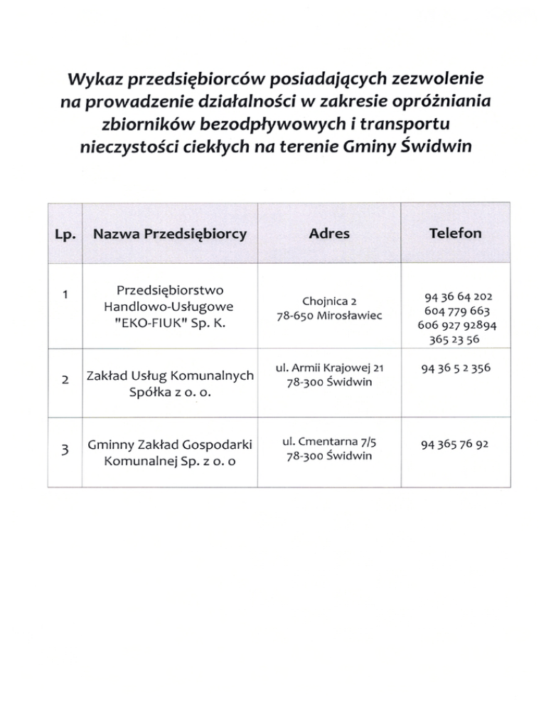 Wykaz przedsiębiorców posiadajqcych zezwolenie na prowadzenie działalności w zakresie opróżniania zbiorników bezodpływowych i transportu widwin nieczystości ciekłych na terenie Gminy ~ Lp. Nazwa Przedsi ę biorcy Przedsi ę biorstwo Handlowo-Usługowe EKO-FIUK" Sp. K. Adres Telefon Chojnica 2 78-650 Mirosławiec 943664 202 604 779 663 606 927 92894 3652356 „ Zakład Usług Komunalnych Spółka z o. o. Gminny Zakład Gospodarki Komunalnej Sp. z o. o ul. Armii Krajowej 21 78-300 Świdwin 943652356 ul. Cmentarna 7/5 78-300 Swidwin 9436576 9 2