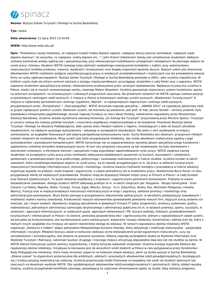 Nazwa: Wyższa Szkoła Turystyki i Ekologii w Suchej Beskidzkiej Typ: nauka Data utworzenia: 11 lipca 2013 13:34:49 WWW: http://www.wste.edu.pl/ Opis: "Powiedzmy naszej młodzieży, że najlepsze książki trzeba dopiero napisać, najlepsze obrazy jeszcze namalować, najlepsze rządy dopiero stworzyć i że wszystko, co najlepsze, zrobią dopiero oni..." / John Erskin/ Założeniem Szkoły jest umożliwienie studentom zdobycia zarówno konkretnej wiedzy ogólnej jak i specjalistycznej, przy równoczesnym kształtowaniu umiejętności niezbędnych do płynnego wejścia na rynek pracy i biznesu. Studenci WSTiE rozwijają tutaj zdolności swobodnego nawiązywania kontaktów z ludźmi, przy wykorzystaniu nowoczesnych środków przekazu, inwencji, wyobraźni i kreatywności oraz biegłej znajomości języków obcych. Naszym celem jest stworzenie Absolwentom WSTiE możliwości podjęcia satysfakcjonującej pracy w wiodących przedsiębiorstwach i instytucjach czy też prowadzenia własnej firmy na rynku ogólnoeuropejskim. Wyższa Szkoła Turystyki i Ekologii w Suchej Beskidzkiej powstała w 2001r. jako uczelnia niepubliczna. W krótkim czasie stała się silnym centrum edukacji o zasięgu międzynarodowym, przyciągając studentów z całej Polski oraz z zagranicy. WSTiE zapewnia studentom specjalistyczną wiedzę i doświadczenie przekazywane przez uznanych wykładowców. Najlepsza turystyczna uczelnia w Polsce, mieści się w murach renesansowego zamku, zwanego Małym Wawelem. Uczelnia gwarantuje nowoczesny system kształcenia, oparty na wzorcach europejskich, na innowacyjnych i ciekawych programach nauczania. Na przestrzeni ostatnich lat WSTiE zajmuje czołowe pozycje w prestiżowych rankingach szkół wyższych: 2 miejsce w Polsce w branżowym rankingu uczelni wyższych „Wiadomości Turystycznych” 6 miejsce w najbardziej opiniotwórczym rankingu tygodnika „Wprost”. w najważniejszym tegorocznym rankingu szkół wyższych, przygotowanym przez „Perspektywy” i „Rzeczpospolitą”, WSTiE otrzymała nagrodę specjalną – „AWANS 2012” za największy jakościowy skok w grupie najlepszych polskich uczelni. Rektorem uczelni, od momentu jej powstania, jest prof. dr hab. Janusz Sondel – ceniony prawnik, były wykładowca Uniwersytetu Jagiellońskiego, laureat nagrody Fundacji na rzecz Nauki Polskiej, wielokrotnie nagradzany przez Ministerstwo Edukacji Narodowej. Uczelnia została wyróżniona odznaką honorową „Za Zasługi dla Turystyki” przyznawaną przez Ministra Sportu i Turystyki w uznaniu zasług dla rozwoju polskiej turystyki i umacnianiu współpracy międzynarodowej w tej dziedzinie. Powstanie Wyższej Szkoły Turystyki i Ekologii na obszarze Podbabiogórza, dało szansę wielu młodym ludziom z regionu, mieszkającym z dala od dużych ośrodków akademickich, na zdobycie wyższego wykształcenia – edukację w europejskich standardach. Dla wielu z nich studiowanie w miejscu zamieszkania, ze względów finansowych jest jedyną perspektywą kontynuowania nauki. Sucha Beskidzka jest idealnym, przyjaznym młodym ludziom miejscem do studiowania. Misją uczelni jest takie przygotowanie młodzieży, aby każdy absolwent znalazł pracę zgodną z jego wykształceniem i posiadanymi kompetencjami. WSTiE koncentruje się na zagwarantowaniu wysokiej jakości specjalistycznego kształcenia i zapewnieniu unikalnej atmosfery towarzyszącej nauce. W tym celu programy nauczania są tak modelowane, by były skorelowane z otoczeniem rynkowym, a oferowane kierunki i specjalności mają wyprzedzać zapotrzebowanie rynku pracy. WSTiE zwiększa szanse studentów na europejskim rynku pracy przez możliwość zdobywania dodatkowych uprawnień na kursach, warsztatach i szkoleniach, spotkaniach z przedstawicielami życia publicznego, politycznego i naukowego realizowanych w trakcie studiów. Uczelnia kształci w takich zawodach, które umożliwiają łatwiejsze wejście na rynek pracy. Są to zawody przygotowujące m.in. do pracy w sektorze turystycznym, nowoczesnych technologii informatycznych, promocji i marketingu. Uczelnia stwarza możliwość kontaktu z pracodawcą w trakcie edukacji, organizuje wyjazdy na praktyki, staże krajowe i zagraniczne, a często pośredniczy też w znalezieniu pracy. Akademickie Biuro Karier co roku przygotowuje ofertę od najlepszych pracodawców. Studenci mają do dyspozycji kilkaset miejsc pracy w firmach w Polsce i w całej Europie oraz Stanach Zjednoczonych. To wynik aktywnej współpracy z krajowymi i zagranicznymi partnerami biznesowymi. Praktyka to ważne doświadczenie zawodowe, dlatego studenci WSTiE odbywają praktyki m.in. w takich miejscach jak: Hiszpania - Wyspy Kanaryjskie - Gran Canaria i La Palma, Majorka, Malta, Tunezja, Turcja, Egipt, Włochy, Grecja - m.in. Zakynthos, Rodos, Kos, Wschodni Peloponez, Irlandia, Niemcy, Francja oraz w międzynarodowych koncernach informatycznych w kraju i zagranicą, sektorze promocji i marketingu oraz administracyjno-państwowym. Biuro Karier pomaga w przygotowaniu dokumentów aplikacyjnych, w określeniu predyspozycji zawodowych i możliwości wyboru kariery zawodowej. Kreatywność naszych absolwentów spowodowała powstanie nowych firm, dających pracę zarówno ich twórcom, jak i innym osobom. Absolwenci znajdują zatrudnienie w globalnych firmach IT (jako: programiści, analitycy systemowi, graficy, webmasterzy), jednostkach administracji samorządu terytorialnego i administracji publicznej (m.in. w działach promocji, sportu, turystyki), w serwisach i agencjach informacyjnych, w redakcjach gazet, agencjach reklamowych i PR, biurach podróży, hotelach, przedsiębiorstwach turystycznych i rekreacyjnych w Polsce i na świecie, prowadzą gospodarstwa eko- i agroturystyczne. Jednym z najważniejszych zadań uczelni, od początku jej funkcjonowania, jest wyrównywanie szans edukacyjnych; wspieranie rozwoju młodzieży niezamożnej i zdolnej oraz tej, która z różnych innych względów ma mniejszy od swo