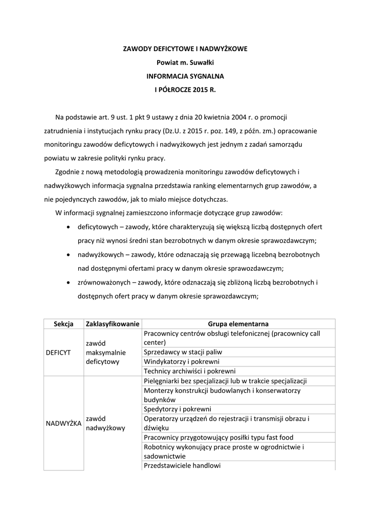 ZAWODY DEFICYTOWE I NADWYŻKOWE Powiat m. Suwałki INFORMACJA SYGNALNA I PÓŁROCZE 2015 R. Na podstawie art. 9 ust. 1 pkt 9 ustawy z dnia 20 kwietnia 2004 r. o promocji zatrudnienia i instytucjach rynku pracy (Dz.U. z 2015 r. poz. 149, z późn. zm.) opracowanie monitoringu zawodów deficytowych i nadwyżkowych jest jednym z zadań samorządu powiatu w zakresie polityki rynku pracy. Zgodnie z nową metodologią prowadzenia monitoringu zawodów deficytowych i nadwyżkowych informacja sygnalna przedstawia ranking elementarnych grup zawodów, a nie pojedynczych zawodów, jak to miało miejsce dotychczas. W informacji sygnalnej zamieszczono informacje dotyczące grup zawodów: deficytowych – zawody, które charakteryzują się większą liczbą dostępnych ofert pracy niż wynosi średni stan bezrobotnych w danym okresie sprawozdawczym; nadwyżkowych – zawody, które odznaczają się przewagą liczebną bezrobotnych nad dostępnymi ofertami pracy w danym okresie sprawozdawczym; zrównoważonych – zawody, które odznaczają się zbliżoną liczbą bezrobotnych i dostępnych ofert pracy w danym okresie sprawozdawczym; Sekcja Zaklasyfikowanie DEFICYT zawód maksymalnie deficytowy NADWYŻKA zawód nadwyżkowy Grupa elementarna Pracownicy centrów obsługi telefonicznej (pracownicy call center) Sprzedawcy w stacji paliw Windykatorzy i pokrewni Technicy archiwiści i pokrewni Pielęgniarki bez specjalizacji lub w trakcie specjalizacji Monterzy konstrukcji budowlanych i konserwatorzy budynków Spedytorzy i pokrewni Operatorzy urządzeń do rejestracji i transmisji obrazu i dźwięku Pracownicy przygotowujący posiłki typu fast food Robotnicy wykonujący prace proste w ogrodnictwie i sadownictwie Przedstawiciele handlowi zawód maksymalnie nadwyżkowy Technicy medyczni i dentystyczni Specjaliści do spraw rozwoju systemów informatycznych Ranking zawodów na każdym poziomie sprawozdawczości – kraju, województwa lub powiatu – można pobrać ze strony: http://mz.praca.gov.pl.