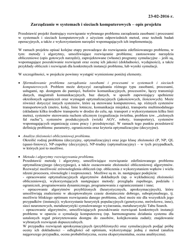 23-02-2016 r. Zarządzanie w systemach i sieciach komputerowych – opis projektu Przedstawić projekt ilustrujący rozwiązanie wybranego problemu zarządzania zasobami i procesami w systemach i sieciach komputerowych z użyciem odpowiednich metod, oraz technik badań operacyjnych, a także z wykorzystaniem narzędzi wspomagających ich implementację. W ramach projektu opisać kolejne etapy prowadzące do rozwiązania zdefiniowanego problemu, w tym: metody i algorytmy, umożliwiające rozwiązanie problemu; zastosowane narzędzia obliczeniowe (opis gotowych narzędzi), zaprojektowane (własne) programy symulacyjne – jeśli są, wspomagające poszukiwanie rozwiązań oraz ocenę ich jakości (dokładności, wydajności), a także przykłady obliczeń i rozwiązań dla konkretnych instancji problemu, lub wyniki symulacji. W szczególności, w projekcie powinny wystąpić wymienione poniżej elementy. Sformułowanie problemu zarządzania zasobami i procesami w systemach i sieciach komputerowych. Problem może dotyczyć zarządzania różnego typu zasobami, procesami, usługami, np. dostępem do pamięci, buforów komunikacyjnych, procesorów, łączy transmisji danych, magistrali komunikacyjnych, baz danych, w sposób zapewniający spełnienie określonych ograniczeń oraz wymagań optymalizacyjnych (jakościowych, ilościowych). Może również dotyczyć innych systemów, które są sterowane komputerowo, np. różnych systemów transportowych (metro, kolej, linie lotnicze, komunikacja miejska), transportu multimodalnego (składanie kilku środków transportu w drodze do celu, np. transport z wykorzystaniem kilku linii metra), systemów sterowania ruchem ulicznym (sygnalizacja świetlna, problem tzw. „zielonych fal ruchu”), systemów produkcyjnych (wózki AGV, roboty, transportery), systemów wspomagających organizację czasu pracy i przedsięwzięć. W ramach tego punktu przedstawić definicję problemu: parametry, ograniczenia oraz kryteria optymalizacyjne (decyzyjne). Analiza złożoności obliczeniowej problemu. Określić rodzaj problemu (decyzyjny, optymalizacyjny) oraz jego klasę złożoności (P, NP, QL (quasi-liniowy), NP-zupełny (decyzyjny), NP-trudny (optymalizacyjny) – w tych przypadkach, w których jest to możliwe. Metoda i algorytmy rozwiązywania problemu. Przedstawić metodę i algorytmy, umożliwiające rozwiązanie zdefiniowanego problemu optymalizacyjnego (decyzyjnego), a także oszacowanie złożoności obliczeniowej algorytmów. Rozważyć możliwość zrównoleglenia obliczeń (np. obliczenia z wykorzystaniem wątków i wielu rdzeni procesora, równoległe i rozproszone). Możliwe są m. in. następujące podejścia: - opracowanie optymalizacyjnych algorytmów dokładnych (np. o wykładniczej złożoności obliczeniowej), wykorzystujących następujące metody: przeglądu zupełnego, podziału i ograniczeń, programowania dynamicznego, programowania z ograniczeniami i inne; - opracowanie algorytmów przybliżonych (heurystycznych, aproksymacyjnych), które umożliwiają znalezienie w akceptowalnym czasie dostatecznie dobrego, suboptymalnego, tj. możliwie bliskiego optimum rozwiązania danego problemu, choć może nie dla wszystkich jego przypadków (instancji); wykorzystanie heurystyk populacyjnych (genetyczne, mrówkowe, inne), sieci neuronowych, metaheurystyki symulowanego wyżarzania, metaheurystyki Tabu Search. - opracowanie algorytmów, umożliwiających poszukiwanie rozwiązań konkretnych instancji problemu w oparciu o symulację komputerową (np. harmonogramu działania systemu dla ustalonych reguł priorytetowania dostępu do zasobów, kolejkowania zadań); znajdowanie wybranych rozwiązań dopuszczalnych. W przypadku rozwiązań aproksymacyjnych (przybliżonych) oraz symulacyjnych podjąć próbę oceny ich dokładności – odległości od optimum, wykorzystując jedną z metod (analiza najgorszego przypadku, ocena probabilistyczna, ocena eksperymentalna, ocena analityczna). Implementacja opracowanych metod i algorytmów. Przedstawić implementację programową (programowo/sprzętową) opracowanych algorytmów (np. układy elektroniczne, obliczenia równoległe z wykorzystaniem rdzeni procesora, procesorów kart graficznych, FPGA, obliczenia rozproszone). Do implementacji algorytmów można wykorzystać wybrane narzędzia, technologie, języki programowania (np. C++, Java), środowiska obliczeniowe i symulacyjne (np. ILOG, Mozart, Matlab, Simio, Enterprise Dynamics, Visual Components, i inne), a także własne, dedykowane programy. Testowanie poprawności i ocena jakości rozwiązań. Przedstawić przykłady obliczeniowe ilustrujące działanie opracowanych metod i algorytmów dla wybranych instancji problemu. Zweryfikować poprawność rozwiązań, wyznaczyć wpływ wybranych parametrów na ustalone kryteria oceny jakościowej i ilościowej, optymalność i wydajność rozwiązań. Przykładowe problemy Zastosowanie metod optymalizacji, metod przetwarzania współbieżnego (wątki, procesy), równoległego (procesory równoległe) i obliczeń rozproszonych do rozwiązywania wybranych problemów kombinatorycznych (optymalizacyjnych, decyzyjnych) związanych z zarządzaniem zasobami i procesami w systemach, i sieciach komputerowych. Problem fragmentacji i alokacji danych w rozproszonych bazach danych. Problemy szeregowania zadań na jednym procesorze. Problemy szeregowania zadań na równoległych procesorach. Problemy przepływowe szeregowania zadań. Problemy gniazdowe szeregowania zadań. Problemy szeregowania cyklicznego. Problemy szeregowania cyklicznego w warunkach występowania konfliktów zasobowych, np. zarządzanie współbieżnymi procesami cyklicznymi, współdzielącymi zasoby. Problemy szeregowania cyklicznego w systemach wyzwalanych czasem (TTA). Problem zarządzania ruchem ulicznym, sterowania sygnalizacją świetlną, np. problem „zielonych fal ruchu”. Zarządzanie systemami transportu multimodalnego (metro, linie lotnicze