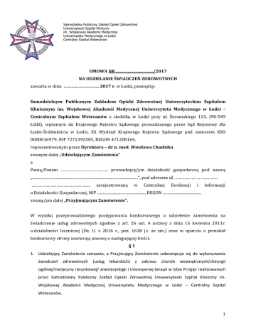 Samodzielny Publiczny Zakład Opieki Zdrowotnej Uniwersytecki Szpital Kliniczny im. Wojskowej Akademii Medycznej Uniwersytetu Medycznego w Łodzi Centralny Szpital Weteranów UMOWA NR ................................../2017 NA UDZIELANIE ŚWIADCZEŃ ZDROWOTNYCH zawarta w dniu ……………………….. 2017 r. w Łodzi, pomiędzy: Samodzielnym Publicznym Zakładem Opieki Zdrowotnej Uniwersyteckim Szpitalem Klinicznym im. Wojskowej Akademii Medycznej Uniwersytetu Medycznego w Łodzi – Centralnym Szpitalem Weteranów z siedzibą w Łodzi przy ul. Żeromskiego 113, (90-549 Łódź), wpisanym do Krajowego Rejestru Sądowego prowadzonego przez Sąd Rejonowy dla Łodzi-Śródmieścia w Łodzi, XX Wydział Krajowego Rejestru Sądowego pod numerem KRS 0000016979, NIP 7272392503, REGON 471208164, reprezentowanym przez Dyrektora – dr n. med. Wiesława Chudzika zwanym dalej „Udzielającym Zamówienia” a Panią/Panem …………………………………. prowadzącą/ym działalność gospodarczą pod nazwą „.............................................................................................................”, pod adresem ul. ……………………………… ………………………………………….. zarejestrowaną w Centralnej Ewidencji i Informacji o Działalności Gospodarczej, NIP ................................................., REGON ......................................, zwaną/ym dalej „Przyjmującym Zamówienie”. W wyniku przeprowadzonego postępowania konkursowego o udzielenie zamówienia na świadczenie usług zdrowotnych zgodnie z art. 26 ust. 4 ustawy z dnia 15 kwietnia 2011r. o działalności leczniczej (Dz. U. z 2016 r., poz. 1638 j.t. ze zm.) oraz w oparciu o protokół konkursowy strony zawierają umowę o następującej treści: §1 1. Udzielający Zamówienia zamawia, a Przyjmujący Zamówienie zobowiązuje się do wykonywania świadczeń zdrowotnych (usług lekarskich) z zakresu chorób wewnętrznych/chirurgii ogólnej/medycyny ratunkowej/ anestezjologii i intensywnej terapii w Izbie Przyjęć realizowanych przez Samodzielny Publiczny Zakład Opieki Zdrowotnej Uniwersytecki Szpital Kliniczny im. Wojskowej Akademii Medycznej Uniwersytetu Medycznego w Łodzi – Centralny Szpital Weteranów. 1 2. Usługi lekarskie, o których mowa w ust. 1, obejmują w szczególności: 1) Wykonywanie całodobowych specjalistycznych świadczeń zdrowotnych w zakresie chorób wewnętrznych na rzecz wszystkich potrzebujących pomocy medycznej w dni powszednie i świąteczne w Samodzielnym Publicznym Zakładzie Opieki Zdrowotnej Uniwersyteckim Szpitalu Klinicznym im. Wojskowej Akademii Medycznej Uniwersytetu Medycznego w Łodzi – Centralnym Szpitalu Weteranów a) wykonywanie niezbędnych badań diagnostycznych, b) całodobową opiekę medyczną, c) monitorowanie procesu leczenia, d) zachowanie bezpieczeństwa oraz procedur i standardów pracy przyjętych w Uniwersyteckim Szpitalu Klinicznym im. Wojskowej Akademii Medycznej Centralnym Szpitalem Weteranów, e) udzielanie konsultacji w innych Klinikach/Oddziałach i Izbach Przyjęć/SORach będących w strukturze organizacyjnej Udzielającego Zamówienia oraz korzystanie z konsultacji specjalistów zatrudnionych przez Udzielającego Zamówienia lub (w szczególnie uzasadnionych przypadkach) osób lub jednostek ochrony zdrowia, z którymi Udzielający Zamówienia ma zawarte umowy na takie konsultacje, f) za porozumieniem Stron możliwe jest świadczenie usług przez Przyjmującego Zamówienie w innej jednostce organizacyjnej Udzielającego Zamówienia. g) podejmowania i wykonywania medycznych czynności ratunkowych u każdej osoby znajdującej się w stanie zagrożenia zdrowotnego zgodnie z obowiązującymi standardami medycznego postępowania w stanach zagrożenia życia, h) kontrolowanie, utrzymanie w pełnej sprawności i stałej gotowości do natychmiastowego użycia sprzętu i aparatury medycznej, i) prowadzenia dokumentacji medycznej zgodnie z obowiązującymi przepisami oraz standardami ustalonymi przez Udzielającego Zamówienia, j) przestrzegania praw pacjenta oraz zasad etyki, k) wydawanie zleceń, l) przestrzeganie zasad postępowania lekarskiego w stanach bezpośredniego zagrożenia życia pacjenta, w szczególności w przypadkach: zawału serca, zatoru płuc, udaru mózgu, obrzęku płuc itp., m) właściwa kwalifikacja chorych do Klinik/Oddziałów Udzielającego Zamówienia, n) dokonywanie oceny badań radiologicznych, o) wykonywania konsultacji lekarskich z zakresu chorób wewnętrznych w innych klinikach i oddziałach w tym zabiegowych w celu ewentualnej kwalifikacji do zabiegów operacyjnych. 3. Przyjmujący Zamówienie oświadcza, że posiada: 2 a. kwalifikacje określone w Ustawie z dnia 5 grudnia 1996 roku o zawodach lekarza i lekarza dentysty (Dz. U. z 2015 r., poz. 464, t.j. ze zm.), b. prawo wykonywania zawodu na terenie Rzeczypospolitej Polskiej. c. Przyjmujący Zamówienie obowiązki wynikające z niniejszej umowy będzie wykonywał osobiście z zastrzeżeniem § 4 ust. 3 niniejszej umowy. d. Przyjmujący Zamówienie oświadcza, że zgodnie z jego wiedzą nie zostało wszczęte ani nie toczy się w krajach Unii Europejskiej oraz państwach trzecich postępowanie o pozbawienie go prawa do wykonywania zawodu ani nie został on w żadnym kraju Unii Europejskiej oraz państwach trzecich pozbawiony prawa do wykonywania zawodu prawomocnym orzeczeniem sądu lub ostateczną decyzją właściwych organów. §2 1. Przyjmujący Zamówienie w czasie wykonywania świadczeń wskazanych w niniejszej umowie korzysta bezpłatnie z bazy lokalowej, aparatury i sprzętu medycznego będącego własnością Udzielającego Zamówienia. Zasady odpowiedzialności za powierzony sprzęt, wyposażenie i bazę lokalową określa załącznik nr 1 do umowy. 2. Miejscem wykonywania zamówienia jest Uniwersytecki Szpital Kliniczny im. Wojskowej Akademii Medycznej – Centralny Szpital Weteranów w Łodzi oraz inne m
