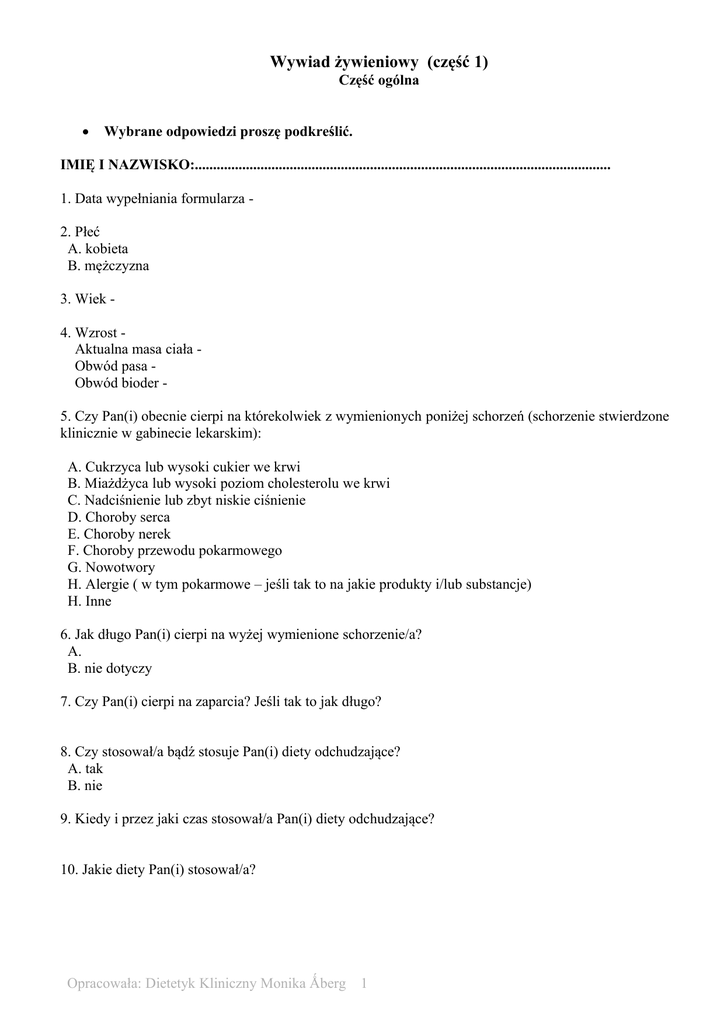 Wywiad żywieniowy (część 1) Część ogólna Wybrane odpowiedzi proszę podkreślić. IMIĘ I NAZWISKO:.................................................................................................................. 1. Data wypełniania formularza 2. Płeć A. kobieta B. mężczyzna 3. Wiek 4. Wzrost Aktualna masa ciała Obwód pasa Obwód bioder 5. Czy Pan(i) obecnie cierpi na którekolwiek z wymienionych poniżej schorzeń (schorzenie stwierdzone klinicznie w gabinecie lekarskim): A. Cukrzyca lub wysoki cukier we krwi B. Miażdżyca lub wysoki poziom cholesterolu we krwi C. Nadciśnienie lub zbyt niskie ciśnienie D. Choroby serca E. Choroby nerek F. Choroby przewodu pokarmowego G. Nowotwory H. Alergie ( w tym pokarmowe – jeśli tak to na jakie produkty i/lub substancje) H. Inne 6. Jak długo Pan(i) cierpi na wyżej wymienione schorzenie/a? A. B. nie dotyczy 7. Czy Pan(i) cierpi na zaparcia? Jeśli tak to jak długo? 8. Czy stosował/a bądź stosuje Pan(i) diety odchudzające? A. tak B. nie 9. Kiedy i przez jaki czas stosował/a Pan(i) diety odchudzające? 10. Jakie diety Pan(i) stosował/a? Opracowała: Dietetyk Kliniczny Monika Ǻberg 1 Część żywieniowa i palenie papierosów 1. Jak często spożywa Pan(i) alkohol? A. codziennie B. kilka razy w tygodniu C. kilka razy w miesiącu D. kilka razy w roku E. nigdy 2. Jakie napoje alkoholowe Pan(i) spożywa? A. Piwo B. Wino C. Wódki D. Drinki 3. Jakie stosuje Pan(i) tłuszcze do potraw? (do każdego produktu proszę przyporządkować literę z tabelki obok) KanapkiSmażenieSałatkiGotowanieDuszenieSosy- A. masło B. smalec C. majonez D. olej roślinny E. margaryna F. śmietana G. oliwa z oliwek H. bez tłuszczu 4. Czy obecnie pali Pan(i) regularnie (min. 1 papierosa dziennie)? A. tak B. nie 5. Czy kiedykolwiek palił(a) Pan(i) regularnie? A. tak B. nie 6. Ile zwykle dziennie Pan(i) pali lub palił(a)? A. pytanie mnie nie dotyczy B. do 5 papierosów dziennie C. ok. ½ paczki dziennie D. ok. 1 paczki dziennie E. ok. 1,5 paczki dziennie F. ok. 2 paczek dziennie Opracowała: Dietetyk Kliniczny Monika Ǻberg 2 Wywiad żywieniowy (część 2) Posiłek – zestaw produktów lub czasem jeden produkt (np. mleko) spożywany w zasadzie codziennie, o tej samej porze lub kilku porach w zależności od charakteru pracy (np. obiady między 12 – 13 przy pracy popołudniowej, a miedzy 15 -16 przy pracy na zmianie porannej). Dojadanie – dorywcze, okazjonalne spożycie produktu lub zestawu produktów o różnych porach, przeważnie w niewielkich ilościach. 1. Proszę podać liczbę posiłków, jaką jada Pan(i) najczęściej w ciągu dnia: A. 1 B. 2 C. 3 D. 4 E. 5 F. 6 i więcej Czy jada Pan(i) zazwyczaj: 11. I śniadania? A. tak B. nie C. bardzo różnie 12. II śniadania? A. tak B. nie C. bardzo różnie 13. obiady? A. tak B. nie C. bardzo różnie 14. podwieczorki? A. tak B. nie C. bardzo różnie 15. kolacje? A. tak B. nie C. bardzo różnie 16. posiłki po kolacyjne? A. tak B. nie C. bardzo różnie Opracowała: Dietetyk Kliniczny Monika Ǻberg 3 O jakiej porze jada Pan(i) najczęściej, następujące posiłki ( w miejscu wykropkowanym proszę wpisać przybliżoną godzinę – jeśli nie dotyczy proszę wpisać poziomą kreskę) 17. I śniadania? ……………….. 18. II śniadania? ……………….. 19. Obiady? ……………….. 20. Podwieczorki? ……………….. 21. Kolacje? ……………….. 22. Posiłki po kolacyjne? ……………….. 23. Jak długie są przerwy miedzy zwykle jadanymi posiłkami? A. mniej niż 2 godziny B. od 2 do 3 godzin C. od 3 do 4 godzin D. od 4 do 5 godzin E. 5 godzin i więcej Jakie produkty jadł Pan(i) w ciągu ostatniego tygodnia? 24. mleko, napoje mleczne … 25. sery twarogowe … 26. sery dojrzewające (żółte), topione … 27. jaja … 28. wędliny … 29. parówki … 30. boczek … 31. mięso, drób … 32. ryby … 33. pieczywo razowe (ciemne) … 34. kasze … 35. pieczywo jasne … Opracowała: Dietetyk Kliniczny Monika Ǻberg A. codziennie B. 5 - 6 razy w tygodniu C. 3 – 4 razy w tygodniu D. 1 – 2 razy w tygodniu E. ani razu 4 36. kluski, makarony … 37. warzywa i owoce surowe … 38. orzechy … 39. warzywa i owoce gotowane … 40. ziemniaki … 41. masło … 42. oleje roślinne … 43. smalec … 44. margaryna … 45. słodycze (cukierki, batony, czekolada ,chipsy itd.) … A. codziennie B. 5 - 6 razy w tygodniu C. 3 – 4 razy w tygodniu D. 1 – 2 razy w tygodniu E. ani razu 46. Czy pije Pan(i) herbatę ? Jeśli tak, to jak często? A. tak … B. nie 47. Czy pije Pan(i) kawę? Jeśli tak, to jak często? A. tak… B. nie 48. Czy słodzi Pan(i) wyżej wymienione napoje? Jeśli tak to ile łyżeczek? A. tak… B. nie 49. Jakie napoje oprócz kawy i herbaty Pan(i) pije? A. woda B. soki i nektary C. napoje gazowane typu cola D. żadne z powyższych 50. Czy jada Pan(i) poza domem? A. codziennie B. często C. od czasu do czasu D. nigdy 51. Czy jada Pan(i) produkty typu Fast-food? A. codziennie B. często C. od czasu do czasu D. nigdy 52. Ile godzin przed snem je Pan(i) zazwyczaj ostatni posiłek w ciągu dnia? A. 2 godziny i więcej Opracowała: Dietetyk Kliniczny Monika Ǻberg 5 B. od 1 do 2 godzin C. mniej niż jedna godzina D. nie umiem określić - bardzo różnie 53. Ile razy w ciągu dnia dojada Pan(i) między posiłkami? A. 4 i więcej razy B. 3 razy C. 2 razy D. 1 raz E. nie dojadam wcale 54. Co wchodzi w skład dojadań? A. tylko owoce B. tylko słodycze C. owoce i słodycze D. tylko kanapki E. kanapki i owoce F. kanapki i słodycze G. kanapki, owoce i słodycze H. inne produkty I. pytanie mnie nie dotyczy 55. Czy uważa Pan(i) swoje obecne żywienie za wystarczające ilościowo? A. tak B. nie 56. Czy uważa Pan(i) swoje obecne żywnie za zdrowe? A. tak B. nie 57. Jakie produkty spożywcze Pan(i) lubi? 58. Jakich produktów Pan(i) nie lubi? 59. Produkty na które jest Pan(i) uczulony(a)? Opracowała: Dietetyk Kliniczny Monika Ǻberg 6
