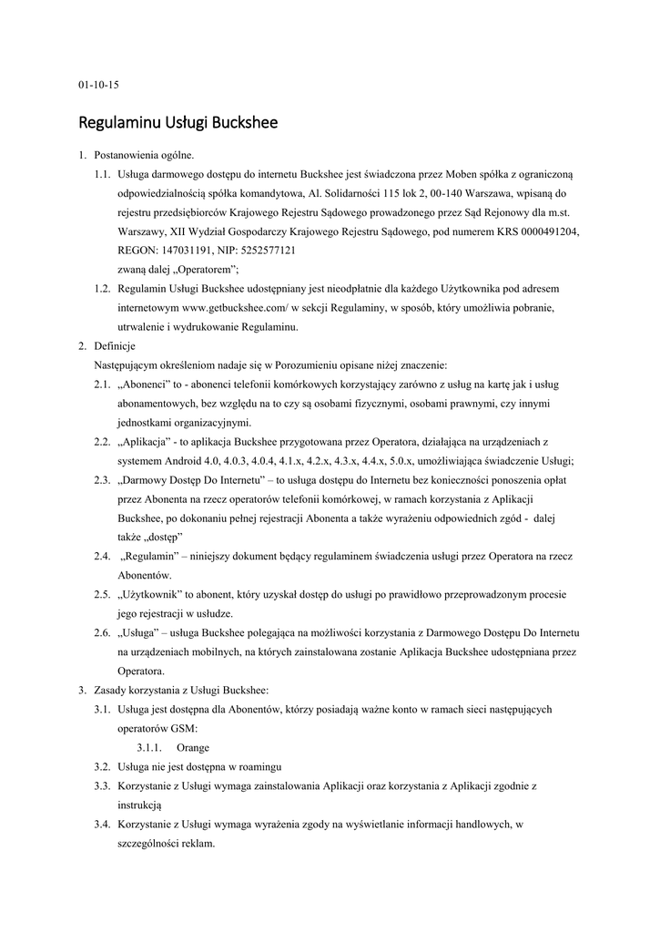 01-10-15 Regulaminu Usługi Buckshee 1. Postanowienia ogólne. 1.1. Usługa darmowego dostępu do internetu Buckshee jest świadczona przez Moben spółka z ograniczoną odpowiedzialnością spółka komandytowa, Al. Solidarności 115 lok 2, 00-140 Warszawa, wpisaną do rejestru przedsiębiorców Krajowego Rejestru Sądowego prowadzonego przez Sąd Rejonowy dla m.st. Warszawy, XII Wydział Gospodarczy Krajowego Rejestru Sądowego, pod numerem KRS 0000491204, REGON: 147031191, NIP: 5252577121 zwaną dalej „Operatorem”; 1.2. Regulamin Usługi Buckshee udostępniany jest nieodpłatnie dla każdego Użytkownika pod adresem internetowym www.getbuckshee.com/ w sekcji Regulaminy, w sposób, który umożliwia pobranie, utrwalenie i wydrukowanie Regulaminu. 2. Definicje Następującym określeniom nadaje się w Porozumieniu opisane niżej znaczenie: 2.1. „Abonenci” to - abonenci telefonii komórkowych korzystający zarówno z usług na kartę jak i usług abonamentowych, bez względu na to czy są osobami fizycznymi, osobami prawnymi, czy innymi jednostkami organizacyjnymi. 2.2. „Aplikacja” - to aplikacja Buckshee przygotowana przez Operatora, działająca na urządzeniach z systemem Android 4.0, 4.0.3, 4.0.4, 4.1.x, 4.2.x, 4.3.x, 4.4.x, 5.0.x, umożliwiająca świadczenie Usługi; 2.3. „Darmowy Dostęp Do Internetu” – to usługa dostępu do Internetu bez konieczności ponoszenia opłat przez Abonenta na rzecz operatorów telefonii komórkowej, w ramach korzystania z Aplikacji Buckshee, po dokonaniu pełnej rejestracji Abonenta a także wyrażeniu odpowiednich zgód - dalej także „dostęp” 2.4. „Regulamin” – niniejszy dokument będący regulaminem świadczenia usługi przez Operatora na rzecz Abonentów. 2.5. „Użytkownik” to abonent, który uzyskał dostęp do usługi po prawidłowo przeprowadzonym procesie jego rejestracji w usłudze. 2.6. „Usługa” – usługa Buckshee polegająca na możliwości korzystania z Darmowego Dostępu Do Internetu na urządzeniach mobilnych, na których zainstalowana zostanie Aplikacja Buckshee udostępniana przez Operatora. 3. Zasady korzystania z Usługi Buckshee: 3.1. Usługa jest dostępna dla Abonentów, którzy posiadają ważne konto w ramach sieci następujących operatorów GSM: 3.1.1. Orange 3.2. Usługa nie jest dostępna w roamingu 3.3. Korzystanie z Usługi wymaga zainstalowania Aplikacji oraz korzystania z Aplikacji zgodnie z instrukcją 3.4. Korzystanie z Usługi wymaga wyrażenia zgody na wyświetlanie informacji handlowych, w szczególności reklam. 3.5. Z chwilą zatwierdzenia rejestracji przez Abonenta zgodnie z punktem 5.3.4. zostaje zawarta umowa z Operatorem na korzystanie z Aplikacji. 3.6. Abonent może w każdej chwili zakończyć korzystanie z Usługi lub Aplikacji, bez konieczności ponoszenia jakichkolwiek opłat. 3.7. Zakończenie korzystania z Usługi może nastąpić przez faktyczne zaprzestanie korzystania lub przez odinstalowanie Aplikacji. 3.8. Odinstalowanie Aplikacji następuje według procedury stosowanej w urządzeniu, z którego korzysta Abonent. 4. Konsumenckie prawo odstąpienia. 4.1. Abonent, który jest konsumentem w rozumieniu art. 221 k.c., czyli korzysta z Usługi w celu niezwiązanym bezpośrednio z działalnością gospodarczą, może odstąpić od umowy dotyczącej korzystania z Usługi w terminie 14 dni od jej zawarcia. 4.2. Odstąpienia od umowy Abonent dokonuje przez przesłanie oświadczenia o odstąpieniu od Umowy na piśmie lub drogą elektroniczną na adres Operatora, lub adres e-mail [email protected] 4.3. Operator udostępnia wzór odstąpienia od umowy na stronie www.getbuckshee.com/ w sekcji Regulaminy, w sposób, który umożliwia pobranie, utrwalenie i wydrukowanie. 4.4. Ustawowe prawo odstąpienia od umowy nie przysługuje Abonenatowi, co do którego Operator rozpoczął świadczenie Usługi za jego wyraźną zgodą, o czym został on poinformowany zgodnie z przepisami prawa. 4.5. Niezależnie od prawa odstąpienia, o którym mowa wyżej, Abonent ma możliwość zakończenia korzystania z Usługi lub Aplikacji w każdym czasie, zgodnie z treścią punktu 3 powyżej. 5. Instalacja Aplikacji. 5.1. Aplikacja jest darmowa dla Abonenta, co oznacza, że pobranie, zainstalowanie i korzystanie z Aplikacji nie wymaga opłaty ze strony Abonenta. 5.2. Pobieranie Aplikacji ze strony internetowej może spowodować obciążenie Abonenta płatnością za przesyłanie danych zgodnie z zasadami stosowanymi przez operatora GSM sieci, z której korzysta Abonent. 5.3. Do pełnego uruchomienia Aplikacji konieczne jest: 5.3.1 wyrażenie zgodny na przetwarzanie danych lokalizacyjnych 5.3.2 wyrażenia zgody na otrzymywanie informacji handlowych lub marketing bezpośredni przy użyciu telekomunikacyjnego urządzenia końcowego, w ramach korzystania z Aplikacji. 6. Warunki techniczne Usługi Darmowego Dostępu do Internetu 6.1. Po zainstalowaniu aplikacji użytkownik moze wybrac z Menu głownego opcje ‘ON’. Po kilku sekundach kolor ikony aplikacji znajdujacy się w pasku statusu na górze ekranu zmieni sie z szarego na czerwony oraz pojawi się znaczek kluczyka (symbol VPN). Od tego momentu korzystanie z dostępu do mobilnego Internetu jest bezplatne dla użytkownika. 6.2. Wybranie z Menu głównego opcji ‘OFF’ powoduje powrot do korzystania z płatnego dostępu do mobilnego Internetu. 6.3. W przypadku wybrania opcji ‘ON’ i podłączenia do sieci WiFi aplikacja przełącza sie w stan czuwania, co oznacza, że korzystanie z Internetu nie jest warunkowane dostarczaniem dodatkowych treści reklamowych. Po zaniku lub rozłączeniu z siecią Wi-Fi aplikacja automatycznie przywróci usługę bezpłatnego korzystania z mobilnego Internetu 6.4. Abonent nie ponosi opłat związanych z przesyłem danych tylko w przypadku, gdy w swoim urządzeniu posiada zainstalowaną Aplikacje, oraz skutecznie uruchomioną opcję „ON”. Skuteczne uruchomienie oznacza, że cały przesył danych z urządzen