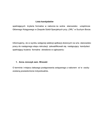 Lista kandydatów spełniających kryteria formalne w naborze na wolne stanowisko urzędnicze Głównego Księgowego w Zespole Szkół Specjalnych przy „ORL” w Suchym Borze. Informujemy, Ŝe w wyniku wstępnej selekcji aplikacji złoŜonych na w/w. stanowisko pracy do następnego etapu rekrutacji zakwalifikowali się następujący kandydaci spełniający kryteria formalne określone w ogłoszeniu: 1. Anna Jonczyk zam. Wrzoski O terminie i miejscu dalszego postępowania związanego z naborem w/ w osoby zostaną powiadomione indywidualnie.