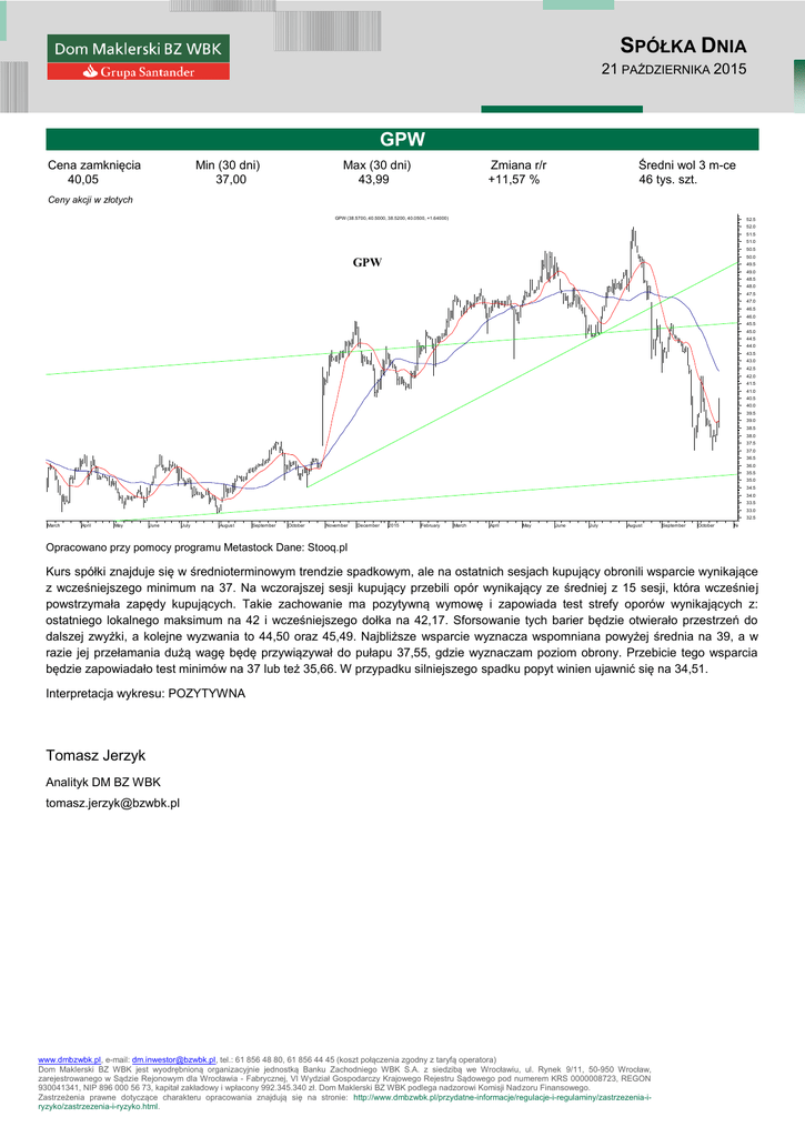 SPÓŁKA DNIA 21 PAŹDZIERNIKA 2015 GPW Cena zamknięcia 40,05 Min (30 dni) 37,00 Max (30 dni) 43,99 Średni wol 3 m-ce 46 tys. szt. Zmiana r/r +11,57 % Ceny akcji w złotych GPW (38.5700, 40.5000, 38.5200, 40.0500, +1.64000) 52.5 52.0 51.5 51.0 50.5 50.0 GPW 49.5 49.0 48.5 48.0 47.5 47.0 46.5 46.0 45.5 45.0 44.5 44.0 43.5 43.0 42.5 42.0 41.5 41.0 40.5 40.0 39.5 39.0 38.5 38.0 37.5 37.0 36.5 36.0 35.5 35.0 34.5 34.0 33.5 33.0 32.5 March April May June July August September October November December 2015 February March April May June July August September October November Opracowano przy pomocy programu Metastock Dane: Stooq.pl Kurs spółki znajduje się w średnioterminowym trendzie spadkowym, ale na ostatnich sesjach kupujący obronili wsparcie wynikające z wcześniejszego minimum na 37. Na wczorajszej sesji kupujący przebili opór wynikający ze średniej z 15 sesji, która wcześniej powstrzymała zapędy kupujących. Takie zachowanie ma pozytywną wymowę i zapowiada test strefy oporów wynikających z: ostatniego lokalnego maksimum na 42 i wcześniejszego dołka na 42,17. Sforsowanie tych barier będzie otwierało przestrzeń do dalszej zwyżki, a kolejne wyzwania to 44,50 oraz 45,49. Najbliższe wsparcie wyznacza wspomniana powyżej średnia na 39, a w razie jej przełamania dużą wagę będę przywiązywał do pułapu 37,55, gdzie wyznaczam poziom obrony. Przebicie tego wsparcia będzie zapowiadało test minimów na 37 lub też 35,66. W przypadku silniejszego spadku popyt winien ujawnić się na 34,51. Interpretacja wykresu: POZYTYWNA Tomasz Jerzyk Analityk DM BZ WBK [email protected] www.dmbzwbk.pl, e-mail: [email protected], tel.: 61 856 48 80, 61 856 44 45 (koszt połączenia zgodny z taryfą operatora) Dom Maklerski BZ WBK jest wyodrębnioną organizacyjnie jednostką Banku Zachodniego WBK S.A. z siedzibą we Wrocławiu, ul. Rynek 9/11, 50-950 Wrocław, zarejestrowanego w Sądzie Rejonowym dla Wrocławia - Fabrycznej, VI Wydział Gospodarczy Krajowego Rejestru Sądowego pod numerem KRS 0000008723, REGON 930041341, NIP 896 000 56 73, kapitał zakładowy i wpłacony 992.345.340 zł. Dom Maklerski BZ WBK podlega nadzorowi Komisji Nadzoru Finansowego. Zastrzeżenia prawne dotyczące charakteru opracowania znajdują się na stronie: http://www.dmbzwbk.pl/przydatne-informacje/regulacje-i-regulaminy/zastrzezenia-iryzyko/zastrzezenia-i-ryzyko.html.