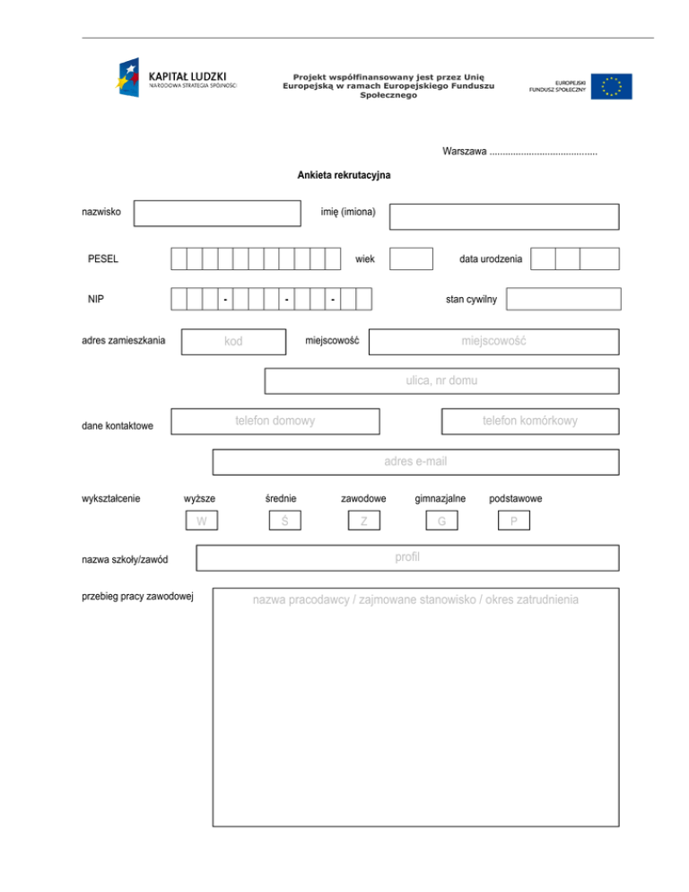 Projekt współfinansowany jest przez Unię Europejską w ramach Europejskiego Funduszu Społecznego Warszawa ......................................... Ankieta rekrutacyjna nazwisko imię (imiona) PESEL wiek - NIP - kod adres zamieszkania data urodzenia - stan cywilny miejscowość miejscowość ulica, nr domu telefon domowy dane kontaktowe telefon komórkowy adres e-mail wykształcenie wyższe W nazwa szkoły/zawód przebieg pracy zawodowej średnie Ś zawodowe gimnazjalne podstawowe Z G P profil nazwa pracodawcy / zajmowane stanowisko / okres zatrudnienia Projekt współfinansowany jest przez Unię Europejską w ramach Europejskiego Funduszu Społecznego Rodzaj niepełnosprawności / grupa Stała czasowa (do dnia … ) Grupa I stopień znaczny Grupa II stopień umiarkowany Grupa III stopień lekki przyjęcie do projektu tak nr orzeczenia nie uwagi Wyrażam zgodę na przetwarzanie moich danych do celów projektu „Równi na rynku pracy – lokalny program aktywizacji zawodowej osób niepełnosprawnych”, zgodnie z ustawą z dnia 29 sierpnia 1997r. o ochronie danych osobowych (Dz.U. z 2002r. Nr 101, poz. 926 z późn. zm.) ……………………………………………………. ……………………………………………………. ……………………………………………………. ................................................ (podpis uczestnika projektu) ………….......................................................... (podpisy komisji)