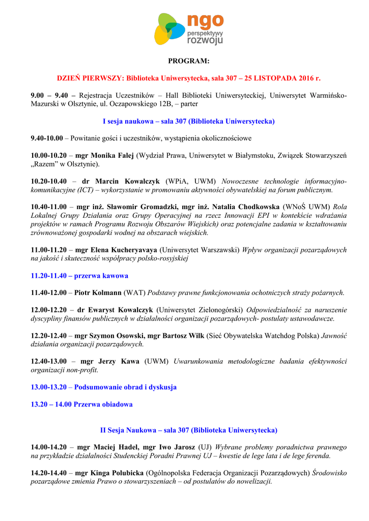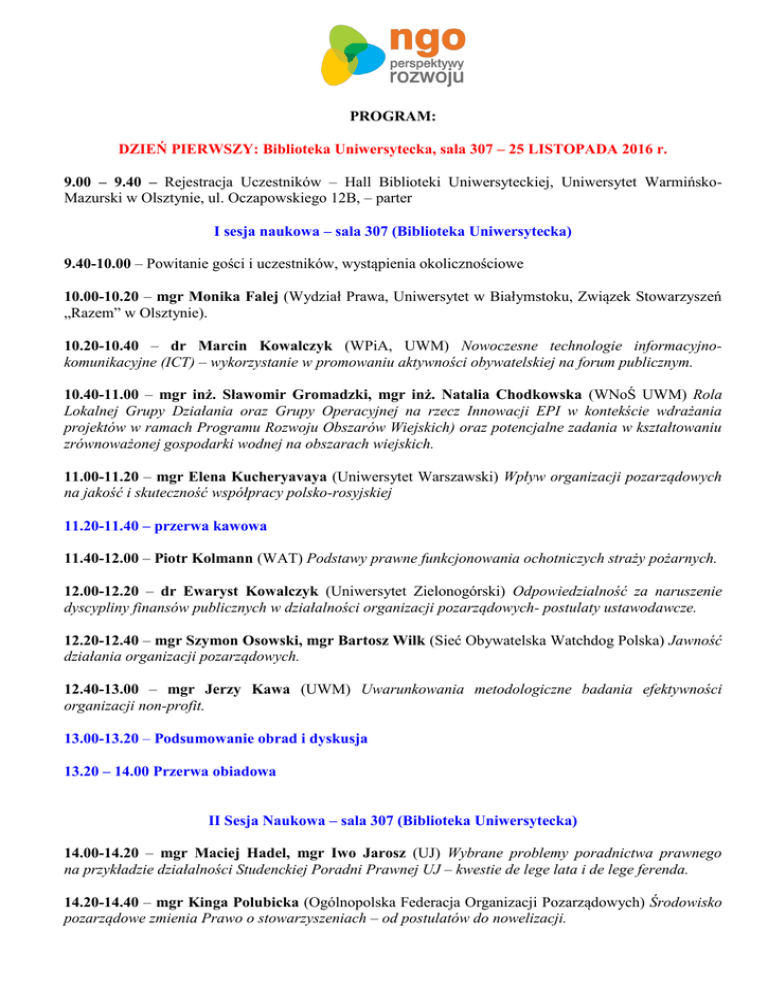 PROGRAM: DZIEŃ PIERWSZY: Biblioteka Uniwersytecka, sala 307 – 25 LISTOPADA 2016 r. 9.00 – 9.40 – Rejestracja Uczestników – Hall Biblioteki Uniwersyteckiej, Uniwersytet WarmińskoMazurski w Olsztynie, ul. Oczapowskiego 12B, – parter I sesja naukowa – sala 307 (Biblioteka Uniwersytecka) 9.40-10.00 – Powitanie gości i uczestników, wystąpienia okolicznościowe 10.00-10.20 – mgr Monika Falej (Wydział Prawa, Uniwersytet w Białymstoku, Związek Stowarzyszeń „Razem” w Olsztynie). 10.20-10.40 – dr Marcin Kowalczyk (WPiA, UWM) Nowoczesne technologie informacyjnokomunikacyjne (ICT) – wykorzystanie w promowaniu aktywności obywatelskiej na forum publicznym. 10.40-11.00 – mgr inż. Sławomir Gromadzki, mgr inż. Natalia Chodkowska (WNoŚ UWM) Rola Lokalnej Grupy Działania oraz Grupy Operacyjnej na rzecz Innowacji EPI w kontekście wdrażania projektów w ramach Programu Rozwoju Obszarów Wiejskich) oraz potencjalne zadania w kształtowaniu zrównoważonej gospodarki wodnej na obszarach wiejskich. 11.00-11.20 – mgr Elena Kucheryavaya (Uniwersytet Warszawski) Wpływ organizacji pozarządowych na jakość i skuteczność współpracy polsko-rosyjskiej 11.20-11.40 – przerwa kawowa 11.40-12.00 – Piotr Kolmann (WAT) Podstawy prawne funkcjonowania ochotniczych straży pożarnych. 12.00-12.20 – dr Ewaryst Kowalczyk (Uniwersytet Zielonogórski) Odpowiedzialność za naruszenie dyscypliny finansów publicznych w działalności organizacji pozarządowych- postulaty ustawodawcze. 12.20-12.40 – mgr Szymon Osowski, mgr Bartosz Wilk (Sieć Obywatelska Watchdog Polska) Jawność działania organizacji pozarządowych. 12.40-13.00 – mgr Jerzy Kawa (UWM) Uwarunkowania metodologiczne badania efektywności organizacji non-profit. 13.00-13.20 – Podsumowanie obrad i dyskusja 13.20 – 14.00 Przerwa obiadowa II Sesja Naukowa – sala 307 (Biblioteka Uniwersytecka) 14.00-14.20 – mgr Maciej Hadel, mgr Iwo Jarosz (UJ) Wybrane problemy poradnictwa prawnego na przykładzie działalności Studenckiej Poradni Prawnej UJ – kwestie de lege lata i de lege ferenda. 14.20-14.40 – mgr Kinga Polubicka (Ogólnopolska Federacja Organizacji Pozarządowych) Środowisko pozarządowe zmienia Prawo o stowarzyszeniach – od postulatów do nowelizacji. 14.40-15.00 – mgr Przemysław Żak (Fundacja Instytut Myśli Obywatelskiej im. Stańczyka/Żak i Wspólnicy Biuro Prawne Sp. z o.o) Zasada reprezentacji stowarzyszeń z szczególnym uwzględnieniem art. 11 ust. 4. 15.00-15.20 – mgr Stella Kamińska, dr hab. Ireneusz Sołtyszewski (WPiA UWM) Udział organizacji pozarządowych w procesie poszukiwania ludzi zaginionych. 15.20-15.40 – Podsumowanie obrad i dyskusja 16.00-18.00 Wycieczka – zwiedzanie Olsztyna DZIEŃ DRUGI: Biblioteka Uniwersytecka, sala 307 – 26 LISTOPADA 2016 r. 9.00 – 9.40 – Rejestracja Uczestników – Hall Biblioteki Uniwersyteckiej, Uniwersytet WarmińskoMazurski w Olsztynie, ul. Oczapowskiego 12B, – parter III Sesja naukowa – sala 307 (Biblioteka Uniwersytecka) 9.40-10.00 – dr Michał Hejbudzki (WPiA UWM) Rola organizacji pozarządowych w realizowaniu o nieodpłatnej pomocy prawnej. 10.20-10.40 – mgr Magdalena Wilk-Białek (Urząd Miasta i Gminy w Miechowie) Współpraca samorządów z organizacjami pozarządowymi – dobre praktyki. 10.40-11.00 – mgr Anita Tkocz (Uniwersytet Ekonomiczny we Wrocławiu) Znaczenie współdziałania w działalności organizacji należących do trzeciego sektora. 11.00-11.20 – dr Jerzy Akińcza (WPiA UWM) Roszczenia o zapłatę z tytułu świadczenia usług opiekuńczych. Rozważania nad potrzebą zmian ustawy o pomocy społecznej. 11.20-11.40 – przerwa kawowa 11.40-12.00 – mgr Zofia Eleonora Szon (UWM) Fundacja Nowa Kultura na Warmii jako przykład organizacji pozarządowej – doświadczenie i perspektywy. 12.00-12.20 – Karolina Rzeczkowska, Przemysław Grześko (WPiA UWM) Organizacje pozarządowe na terenach wiejskich. 12.20-12.40 – Milena Gwara (UWM) Działalność wolontariatu. Voluntary activities. 12.40-13.00 – Daria Maria Śliwińska Organizacje pozarządowe typu feministycznego. 13.00-13.20 – Magdalena Pietrzykowska Postulaty na rzecz stosowania klauzul społecznych w zamówieniach publicznych. 13.20-13.40 – Dyskusja i zakończenie obrad 13.40 – obiad Termin nadsyłania tekstów do publikacji w monografii: 30 listopada 2016 r. Wymogi redakcyjne w zakładce „Wymogi redakcyjne” http://www.uwm.edu.pl/kbipp/konferencja/?page_id=21