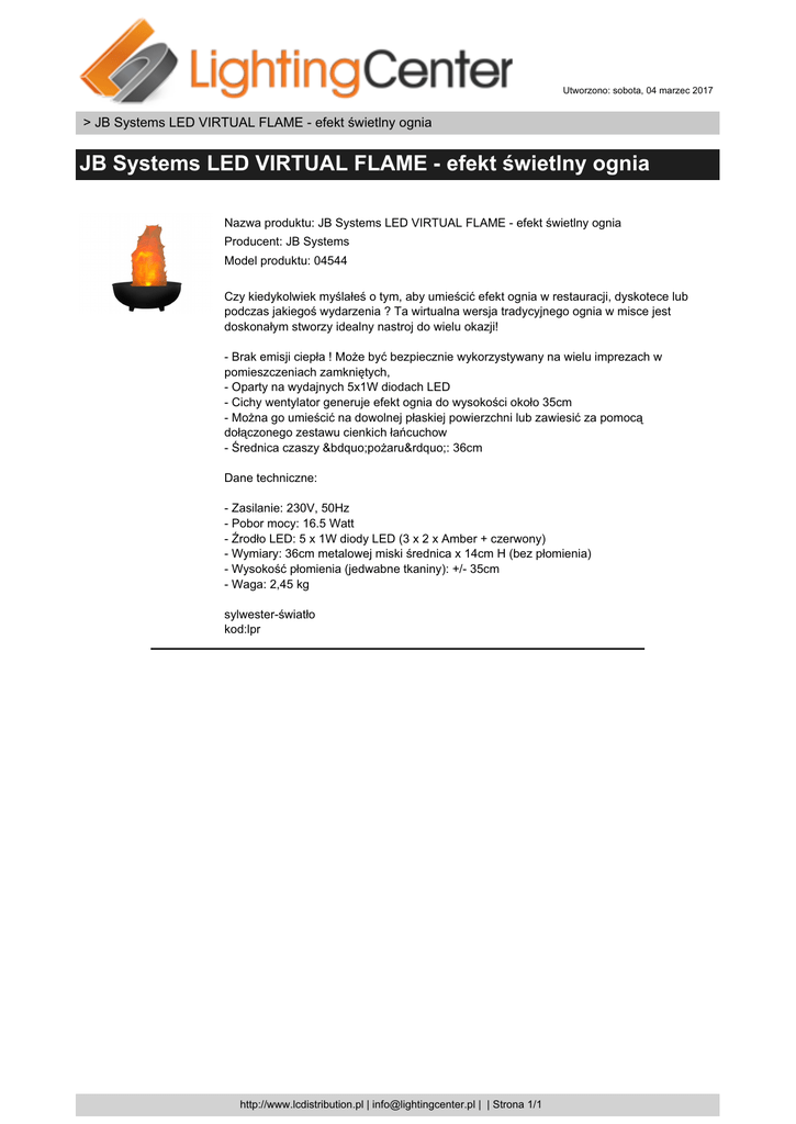 Utworzono: sobota, 04 marzec 2017 > JB Systems LED VIRTUAL FLAME - efekt świetlny ognia JB Systems LED VIRTUAL FLAME - efekt świetlny ognia Nazwa produktu: JB Systems LED VIRTUAL FLAME - efekt świetlny ognia Producent: JB Systems Model produktu: 04544 Czy kiedykolwiek myślałeś o tym, aby umieścić efekt ognia w restauracji, dyskotece lub podczas jakiegoś wydarzenia ? Ta wirtualna wersja tradycyjnego ognia w misce jest doskonałym stworzy idealny nastroj do wielu okazji! - Brak emisji ciepła ! Może być bezpiecznie wykorzystywany na wielu imprezach w pomieszczeniach zamkniętych, - Oparty na wydajnych 5x1W diodach LED - Cichy wentylator generuje efekt ognia do wysokości około 35cm - Można go umieścić na dowolnej płaskiej powierzchni lub zawiesić za pomocą dołączonego zestawu cienkich łańcuchow - Średnica czaszy „pożaru”: 36cm Dane techniczne: - Zasilanie: 230V, 50Hz - Pobor mocy: 16.5 Watt - Źrodło LED: 5 x 1W diody LED (3 x 2 x Amber + czerwony) - Wymiary: 36cm metalowej miski średnica x 14cm H (bez płomienia) - Wysokość płomienia (jedwabne tkaniny): +/- 35cm - Waga: 2,45 kg sylwester-światło kod:lpr http://www.lcdistribution.pl | [email protected] | | Strona 1/1