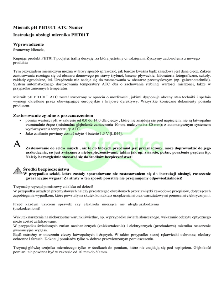 Miernik pH PHT01T ATC Numer Instrukcja obs ugi miernika PHT01T Wprowadzenie Szanowny kliencie, Kupuj c produkt PHT01T podj produktu trafn decyzj , za któr jeste my ci wdzi czni. yczymy zadowolenia z nowego Tym przyrz dem mierniczym mo na w atwy sposób sprawdzi , jak bardzo kwa na b zasadowa jest dana ciecz. Zakres zastosowania rozci ga si od obszaru domowego po stawy (rybne), baseny p ywackie, laboratoria fotograficzne, szko y, zak ady ogrodnicze, itd. Urz dzenie nie nadaje si do zastosowania w obszarze przemys owym (np. galwanotechniki). System automatycznego dostosowania temperatury ATC dba o zachowania stabilnej warto ci mierzonej, tak e w przypadku zmiennych temperatur. Miernik pH PHT01T ATC zosta stworzony w oparciu o mo liwo ci, jakimi dysponuje obecny stan techniki i spe nia wymogi okre lone przez obowi zuj ce europejskie i krajowe dyrektywy. Wszystkie konieczne dokumenty posiada producent. Zastosowanie zgodne z przeznaczeniem • • A pomiar warto ci pH w zakresie od 0,0 do 14,0 dla cieczy , które nie znajduj si pod napi ciem, nie s atwopalne ewentualnie ce (minimalna g boko zamoczenia 10mm, maksymalna 80 mm); z automatycznym systemem wyrównywania temperatury ATC. Jako zasilanie powinny zosta u yte 4 baterie 1.5 V [LR44]. Zastosowanie do celów innych , ni te do których przedmiot jest przeznaczony, mo e doprowadzi do jego uszkodzenia, co jest zwi zane z niebezpiecze stwami, takim jak np. zwarcie, po ar, pora enie pr dem itp. Nale y bezwzgl dnie stosowa si do rodków bezpiecze stwa! rodki bezpiecze stwa W przypadku szkód, które zosta y spowodowane nie zastosowaniem si do instrukcji obs ugi, roszczenie gwarancyjne wygasa! Za straty w ten sposób powsta e nie przejmujemy odpowiedzialno ci! Trzyma przyrz d pomiarowy z daleka od dzieci! W przypadku urz dze przemys owych nale y przestrzega okre lonych przez zwi zki zawodowe przepisów, dotycz cych zapobiegania wypadkom, które powsta y na skutek kontaktu z urz dzeniami oraz warsztatowymi pomocami elektrycznymi. Przed ka dym u yciem sprawd (uszkodzeniom)! czy elektroda mierz ca nie uleg a uszkodzeniu Wskutek nara enia na niekorzystne warunki wietlne, np. w przypadku wiat a s onecznego, wskazanie odczytu optycznego mo e zosta zafa szowane. W przypadku wiadomych zmian mechanicznych (zniekszta cenie) i elektrycznych (przebudowa) miernika roszczenie gwarancyjne wygasa. ostro ny w otoczeniu cieczy atwopalnych i cych. W takim przypadku stosuj r kawiczki ochronne, okulary ochronne i fartuch. Dokonuj pomiarów tylko w dobrze przewietrzonym pomieszczeniu. Trzymaj g ówk czujnika mierniczego tylko w rodkach do pomiaru, które nie znajduj si pod napi ciem. G boko pomiaru nie powinna by w zakresie od 10 mm do 80 mm. Zakres dostawy • • miernik pH PHT01T ATC roztwory do kalibracji o pH 4.0; 7,00; 9.18 (w postaci proszkowej – wymagaj rozcie czenia wod destylowan ) • skrzynka do przechowywania i instrukcja obs ugi • Wk adanie baterii - wymiana baterii: Aby PHT01T ATC funkcjonowa bez zarzutu, musi zosta wyposa ony w baterie: 4 x LR44. Kiedy wska nik znika, musisz wymieni baterie. Post puj w nast puj cy sposób: • odkr szufladk na baterie w górnej cz ci przyrz du PHT01T ATC. • wymie stare baterie na nowe baterie tego samego typu i zakr pokrywk . A Uwaga! Nie u ywaj PHT01T ACT kiedy jest otwarty. Nie pozostawiaj zu ytych baterii w PHT01T ATC, poniewa same niewylewne baterie mog korodowa , a przez to mog zosta uwolnione substancje chemiczne, które mog zaszkodzi twojemu zdrowiu i zniszczy wk adk na baterie. Pami taj o tym, e zu yte baterie zaliczane s do szkodliwych odpadów i powinny w trosce o rodowisko zosta utylizowane. Twoje zu yte baterie mog zosta bezp atnie oddane do stacji zbornych w Twojej gminie, w naszej firmie lub wsz dzie tam gdzie sprzedaje si baterie i akumulatory. Uruchomienie, kalibracja, mierzenie • • • cz/ wy cz miernik PHT01T ATC naciskaj c przycisk ON/ OFF. Zdejmij okr y kapturek ochronny elektrody do pomiaru pH. Przygotuj roztwory buforowe (ka da torebk nale y otworzy i rozcie czy w 250ml destylowanej wody w czystym pojemniku). Przep ucz elektrod do pomiaru pH w wodzie destylowanej (tak e przed i po ka dym u yciu/ pomiarze) i wytrzyj j do sucha. Je eli elektroda jest sucha nale y zanurzy j na 10 minut w wodzie destylowanej i dopiero wtedy rozpocz proces kalibracji. • cz przyrz d (ON/OFF). Zanurz ko cówk przyrz du w roztworze buforowym pH6.8 (poziom roztworu minimum 10mm). Naci nij przycisk CAL na 3 sekundy, a pojawi si na wy wietlaczu tekst „CAL”. Zwolnij przycisk – przyrz d automatycznie zidentyfikuje rodzaj bufora i na wy wietlaczu pojawi si warto 6.8pH. W przypadku gdy temperatura otoczenia ró ni si od 25 stopni C, uwzgl dniona zostanie poprawka zgodnie z tabel umieszczon na opakowaniu roztworu buforowego. Wynik kalibracji zostanie zapisany w w pami ci przyrz du gdy pojawi si na wy wietlaczu napis „SA” (trwa to oko o 2 sekund). Nast pnie po 1 sekundzie przyrz d samoczynnie powróci do trybu pomiarowego. Na wy wietlaczu powinien pokaza si napis „END”. Nie wyjmowa sondy dopóki nie pojawi si napis „END”! • Nast pnie te same kroki nale y wykona dla pozosta ych roztworów buforowych: 4.01pH i 9.19pH. Przy ka dej zmianie roztworu elektrod nale y przep uka w wodzie destylowanej i wytrze do sucha papierow chusteczk ! • Je eli po naci ni ciu przycisku CAL pojawia si zaraz napis END, oznacza to, e roztwór kalibracyjny jest nie wie y czyli, za d ugo by przechowywany w postaci rozcie czonej. POMIAR: . • Wyp uka elektrod do pomiaru pH w wodzie destylowanej i wytrze do sucha papierow chusteczk . • Zanurz elektrod do pomiaru pH w mierzonej cieczy i potrzymaj przez chwil . Minimalne zanurzenie to 10mm. Maksymalne 35mm. Bezpo rednio po ustabilizowaniu si wy wietlacza mo na odczyta warto pH badanej cieczy. System automatycznego wyrównywania temperatury (ATC) pozwala w przypadkach ro nych temperatur cieczy uzyska dok adne pomiary. • • • • • Aby zagwarantowa sobie funkcjonalno mi