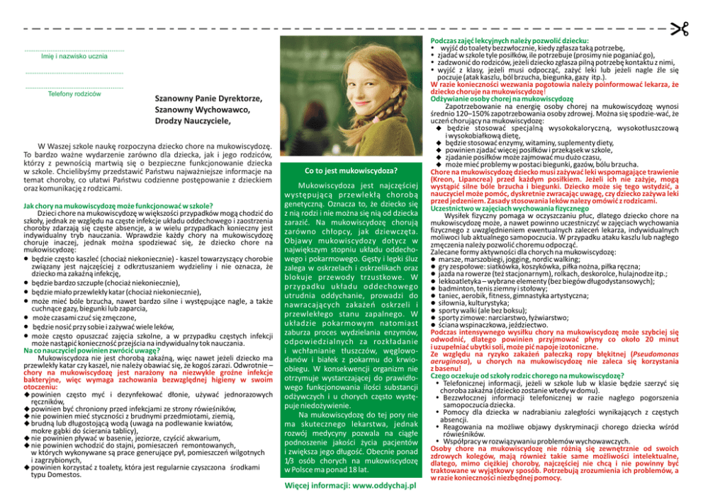 ...................................................... Imiê i nazwisko ucznia ..................................................... ..................................................... Telefony rodziców Szanowny Panie Dyrektorze, Szanowny Wychowawco, Drodzy Nauczyciele, W Waszej szkole naukê rozpoczyna dziecko chore na mukowiscydozê. To bardzo wa¿ne wydarzenie zarówno dla dziecka, jak i jego rodziców, którzy z pewnoœci¹ martwi¹ siê o bezpieczne funkcjonowanie dziecka w szkole. Chcielibyœmy przedstawiæ Pañstwu najwa¿niejsze informacje na temat choroby, co u³atwi Pañstwu codzienne postêpowanie z dzieckiem oraz komunikacjê z rodzicami. Jak chory na mukowiscydozê mo¿e funkcjonowaæ w szkole? Dzieci chore na mukowiscydozê w wiêkszoœci przypadków mog¹ chodziæ do szko³y, jednak ze wzglêdu na czêste infekcje uk³adu oddechowego i zaostrzenia choroby zdarzaj¹ siê czêste absencje, a w wielu przypadkach konieczny jest indywidualny tryb nauczania. Wprawdzie ka¿dy chory na mukowiscydozê choruje inaczej, jednak mo¿na spodziewaæ siê, ¿e dziecko chore na mukowiscydozê: · bêdzie czêsto kaszleæ (chocia¿ niekoniecznie) - kaszel towarzysz¹cy chorobie zwi¹zany jest najczêœciej z odkrztuszaniem wydzieliny i nie oznacza, ¿e dziecko ma zakaŸn¹ infekcjê, · bêdzie bardzo szczup³e (chocia¿ niekoniecznie), · bêdzie mia³o przewlek³y katar (chocia¿ niekoniecznie), · mo¿e mieæ bóle brzucha, nawet bardzo silne i wystêpuj¹ce nagle, a tak¿e cuchn¹ce gazy, biegunki lub zaparcia, · mo¿e czasami czuæ siê zmêczone, · bêdzie nosiæ przy sobie i za¿ywaæ wiele leków, · mo¿e czêsto opuszczaæ zajêcia szkolne, a w przypadku czêstych infekcji mo¿e nast¹piæ koniecznoœæ przejœcia na indywidualny tok nauczania. Na co nauczyciel powinien zwróciæ uwagê? Mukowiscydoza nie jest chorob¹ zakaŸn¹, wiêc nawet je¿eli dziecko ma przewlek³y katar czy kaszel, nie nale¿y obawiaæ siê, ¿e kogoœ zarazi. Odwrotnie – chory na mukowiscydozê jest nara¿ony na niezwykle groŸne infekcje bakteryjne, wiêc wymaga zachowania bezwzglêdnej higieny w swoim otoczeniu: u powinien czêsto myæ i dezynfekowaæ d³onie, u¿ywaæ jednorazowych rêczników, u powinien byæ chroniony przed infekcjami ze strony rówieœników, u nie powinien mieæ stycznoœci z brudnymi przedmiotami, ziemi¹, u brudn¹ lub d³ugostoj¹c¹ wod¹ (uwaga na podlewanie kwiatów, mokre g¹bki do œcierania tablicy), u nie powinien p³ywaæ w basenie, jeziorze, czyœciæ akwarium, u nie powinien wchodziæ do stajni, pomieszczeñ remontowanych, w których wykonywane s¹ prace generuj¹ce py³, pomieszczeñ wilgotnych i zagrzybionych, u powinien korzystaæ z toalety, która jest regularnie czyszczona œrodkami typu Domestos. Co to jest mukowiscydoza? Mukowiscydoza jest najczêœciej wystêpuj¹c¹ przewlek³¹ chorob¹ genetyczn¹. Oznacza to, ¿e dziecko siê z ni¹ rodzi i nie mo¿na siê ni¹ od dziecka zaraziæ. Na mukowiscydozê choruj¹ zarówno ch³opcy, jak dziewczêta. Objawy mukowiscydozy dotycz w najwiêkszym stopniu uk³adu oddechowego i pokarmowego. Gêsty i lepki œluz zalega w oskrzelach i oskrzelikach oraz blokuje przewody trzustkowe. W przypadku uk³adu oddechowego utrudnia oddychanie, prowadzi do nawracaj¹cych zaka¿eñ oskrzeli i przewlek³ego stanu zapalnego. W uk³adzie pokarmowym natomiast zaburza proces wydzielania enzymów, odpowiedzialnych za rozk³adanie i wch³anianie t³uszczów, wêglowodanów i bia³ek z pokarmu do krwioobiegu. W konsekwencji organizm nie otrzymuje wystarczaj¹cej do prawid³owego funkcjonowania iloœci substancji od¿ywczych i u chorych czêsto wystêpuje niedo¿ywienie. Na mukowiscydozê do tej pory nie ma skutecznego lekarstwa, jednak rozwój medycyny pozwala na ci¹g³e podnoszenie jakoœci ¿ycia pacjentów i zwiêksza jego d³ugoœæ. Obecnie ponad 1/3 osób chorych na mukowiscydozê w Polsce ma ponad 18 lat. Wiêcej informacji: www.oddychaj.pl Podczas zajêæ lekcyjnych nale¿y pozwoliæ dziecku: wyjœæ do toalety bezzw³ocznie, kiedy zg³asza tak¹ potrzebê, zjadaæ w szkole tyle posi³ków, ile potrzebuje (prosimy nie poganiaæ go), zadzwoniæ do rodziców, je¿eli dziecko zg³asza piln¹ potrzebê kontaktu z nimi, wyjœæ z klasy, je¿eli musi odpocz¹æ, za¿yæ leki lub je¿eli nagle Ÿle siê poczuje (atak kaszlu, ból brzucha, biegunka, gazy itp.). W razie koniecznoœci wezwania pogotowia nale¿y poinformowaæ lekarza, ¿e dziecko choruje na mukowiscydozê! Od¿ywianie osoby chorej na mukowiscydozê Zapotrzebowanie na energiê osoby chorej na mukowiscydozê wynosi œrednio 120–150% zapotrzebowania osoby zdrowej. Mo¿na siê spodzie-waæ, ¿e uczeñ choruj¹cy na mukowiscydozê: u bêdzie stosowaæ specjaln¹ wysokokaloryczn¹, wysokot³uszczow¹ i wysokobia³kow¹ dietê, u bêdzie stosowaæ enzymy, witaminy, suplementy diety, u powinien zjadaæ wiêcej posi³ków i przek¹sek w szkole, u zjadanie posi³ków mo¿e zajmowaæ mu du¿o czasu, u mo¿e mieæ problemy w postaci biegunki, gazów, bólu brzucha. Chore na mukowiscydozê dziecko musi za¿ywaæ leki wspomagaj¹ce trawienie (Kreon, Lipancrea) przed ka¿dym posi³kiem. Je¿eli ich nie za¿yje, mog¹ wyst¹piæ silne bóle brzucha i biegunki. Dziecko mo¿e siê tego wstydziæ, a nauczyciel mo¿e pomóc, dyskretnie zwracaj¹c uwagê, czy dziecko za¿ywa leki przed jedzeniem. Zasady stosowania leków nalezy omówiæ z rodzicami. Uczestnictwo w zajêciach wychowania fizycznego Wysi³ek fizyczny pomaga w oczyszczaniu p³uc, dlatego dziecko chore na mukowiscydozê mo¿e, a nawet powinno uczestniczyæ w zajêciach wychowania fizycznego z uwzglêdnieniem ewentualnych zaleceñ lekarza, indywidualnych moliwoci lub aktualnego samopoczucia. W przypadku ataku kaszlu lub nag³ego zmêczenia nale¿y pozwoliæ choremu odpocz¹æ. Zalecane formy aktywnoœci dla chorych na mukowiscydozê: l marsze, marszobiegi, jogging, nordic walking; l gry zespo³owe: siatkówka, koszykówka, pi³k
