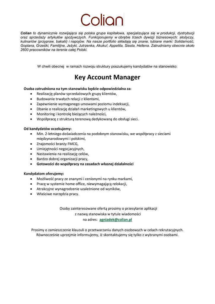 Colian to dynamicznie rozwijająca się polska grupa kapitałowa, specjalizująca się w produkcji, dystrybucji oraz sprzedaży artykułów spożywczych. Funkcjonujemy w obrębie trzech dywizji biznesowych: słodyczy, kulinariów (przypraw, bakalii) i napojów. Na nasze portfolio składają się znane, lubiane marki: Solidarność, Goplana, Grześki, Familijne, Jeżyki, Jutrzenka, Akuku!, Appetita, Siesta, Hellena. Zatrudniamy obecnie około 2600 pracowników na terenie całej Polski. W chwili obecnej w ramach rozwoju struktury poszukujemy kandydatów na stanowisko: Key Account Manager Osoba zatrudniona na tym stanowisku będzie odpowiedzialna za: Realizację planów sprzedażowych grupy klientów, Budowanie trwałych relacji z klientami, Zapewnienie wymaganego umowami poziomu indeksacji, Dbanie o realizację działań marketingowych u klientów, Monitoring i kontrolę bieżących należności, Współpracę z strukturą terenową dedykowaną do obsługi sieci. Od kandydatów oczekujemy: Min. 2-letniego doświadczenia na podobnym stanowisku, we współpracy z sieciami międzynarodowymi i polskimi, Znajomości branży FMCG, Umiejętności negocjacyjnych, Nastawienia na realizację celów, Bardzo dobrej organizacji pracy, Gotowości do współpracy na zasadach własnej działalności Kandydatom oferujemy: Możliwość pracy ze znanymi i cenionymi na rynku markami, Pracę w systemie home office, niewymagającą relokacji, Atrakcyjne wynagrodzenie uzależnione od wyników, Właściwe narzędzia pracy. Osoby zainteresowane ofertą prosimy o przesyłanie aplikacji z nazwą stanowiska w tytule wiadomości na adres: [email protected] Prosimy o zamieszczenie klauzuli o przetwarzaniu danych osobowych w celach rekrutacyjnych. Równocześnie uprzejmie informujemy, iż skontaktujemy się tylko z wybranymi osobami.